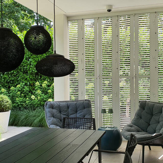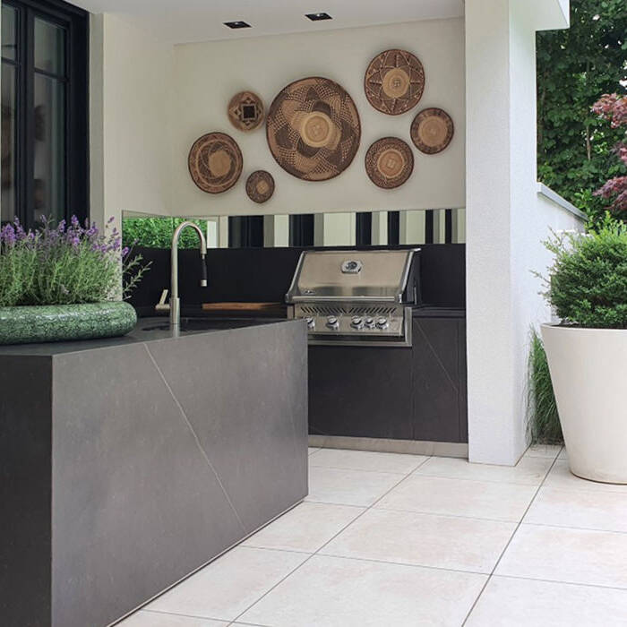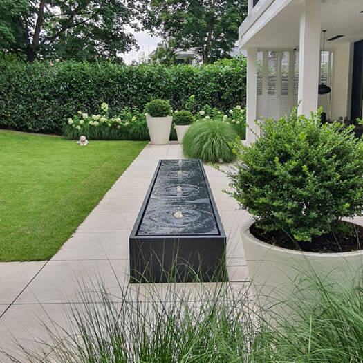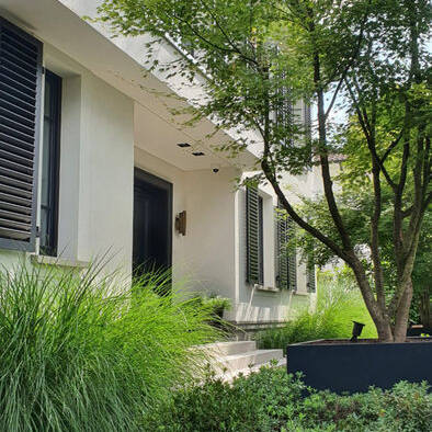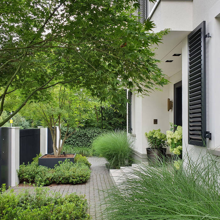 Im Vorgarten mit seinem Basalt-Kopfsteinpflaster stehen zwei vier bis fünf Meter hohe japanische Ahorne (Acer Palmatum) in großen pulverbeschichteten Metallkübeln, unter denen Leitungen verlaufen. Immergrüner Bloombux mit leicht rosa-weißen Blüten umrahmt die Kübel. Ein Hochbeet aus pulverbeschichtetem schwarzem Stahl und eine Natursteintreppe aus Basalt fangen den Höhenunterschied von der Zuwegung des Hauses zur Garagenabfahrt ab. Die Beleuchtung im mehrstämmigen japanischen Ahorn im Eingangsbereich sorgt für einen schönen Empfang – sogar bei Nacht. Auch der hintere Garten ist illuminiert: Warmes LED-Licht strahlt die Gehölze an und sorgt für eine Wohnraumverlängerung selbst bei Dunkelheit.