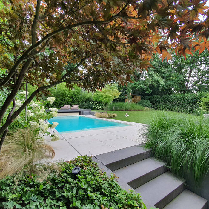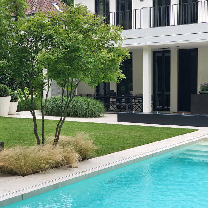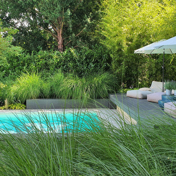 Gräser wiegen sich sanft im Wind, ein Wasserspiel plätschert leise vor sich hin und auf dem Holzdeck liegend blickt man über Pool und Garten auf das Haus samt Küche im Freien. Hohe Kirschlorbeerhecken und eine große Bambushecke schirmen diese grüne Idylle zu den Nachbargrundstücken ab. Nina Rudolph und Sabine Ullrich-Brosch von Rudolph Gartendesign haben diese Oase samt Pool für ihre Bauherren geplant – wobei die Entscheidung für den Pool erst spät fiel. Auf Wunsch der Auftraggeber entstand so ein ebenso kindgerechter wie pflegeleichter Garten mit modernen und klaren Strukturen, dessen Pflanzen möglichst weiß blühen sollten. Neben dem Sichtschutz zu den Nachbarn wünschten sich die Bauherren auch einen absolut kindersicheren Pool. Lediglich eine wunderbare alte Linde mussten die Landschaftsplaner dabei in ihr Konzept integrieren.