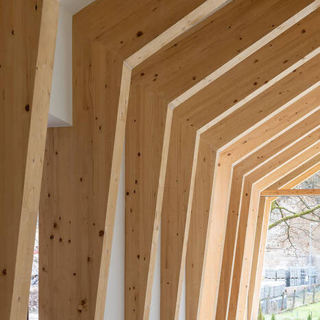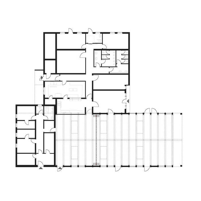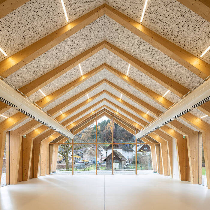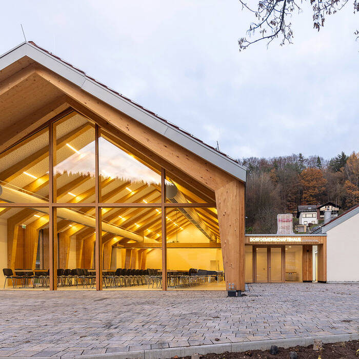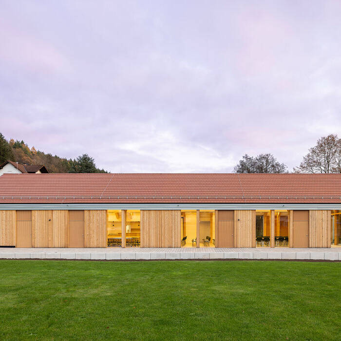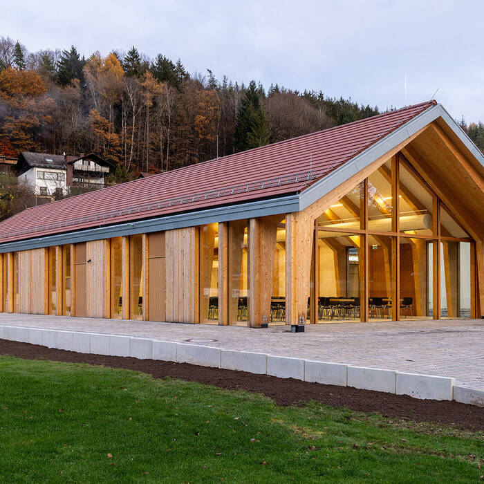 Durchgesetzt hat sich eine „Hybrid-Variante“. Diese sah zunächst eine Kernsanierung der Bestandsgebäude vor: Nach dem Abriss des alten Saals wurde dieser, der die eigentliche Veranstaltungsfläche beinhaltet, in einer Holzkonstruktion aus Dreigelenkrahmen neu errichtet sowie die Technik, Oberflächen und Dämmung erneuert. Der neue, mit Linoleum ausgelegte Saal, besticht mit scheinbar rahmenlosen Verglasungen sowie einer voll verglasten Giebelseite und verfügt nun über schwellenlose Ausgänge. Ein Zwischenbau, der den Haupt- sowie Nebeneingang mit Anlierung zur Küche beinhaltet, schafft eine Verbindung zwischen Alt- und Nebau. Das Gestaltungskonzept ist insgesamt an eine ortstypische „Scheune“ angelehnt – und modern interpretiert (keine Dachüberstände, flache Tonziegel, viel Glas mit Blickbezüge in die Natur). So bilden nun große Glasflächen, eine Akustikdecke und diverse Funktionsbereiche (einschließlich Gastro Küche) den Rahmen für diverse Veranstaltungen und Vereinsaktivitäten. Der erweiterte, massiv gemauerte Altbau , der sich eher geschlossen präsentiert, beinhaltet Lagerflächen und Sanitärbereiche. Die Außenanlagen wurden großflächig neu gestaltet und integrieren den vorhandenen Bachlauf. Der Gebäude-Komplex wird mittels Wärmepumpe beheizt, Lastspitzen werden über eine Gastherme sowie eine PV-Anlage gesenkt.