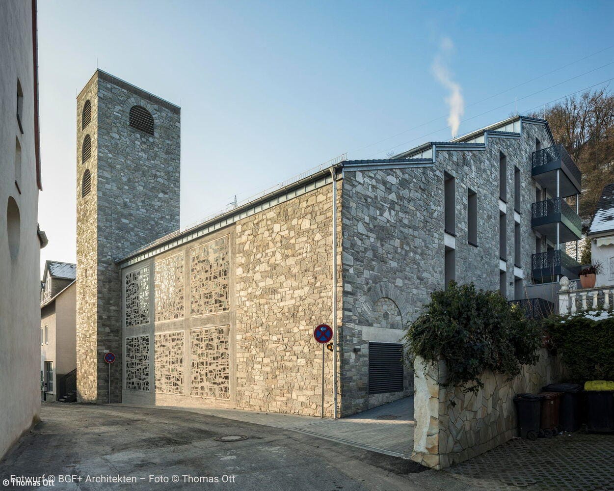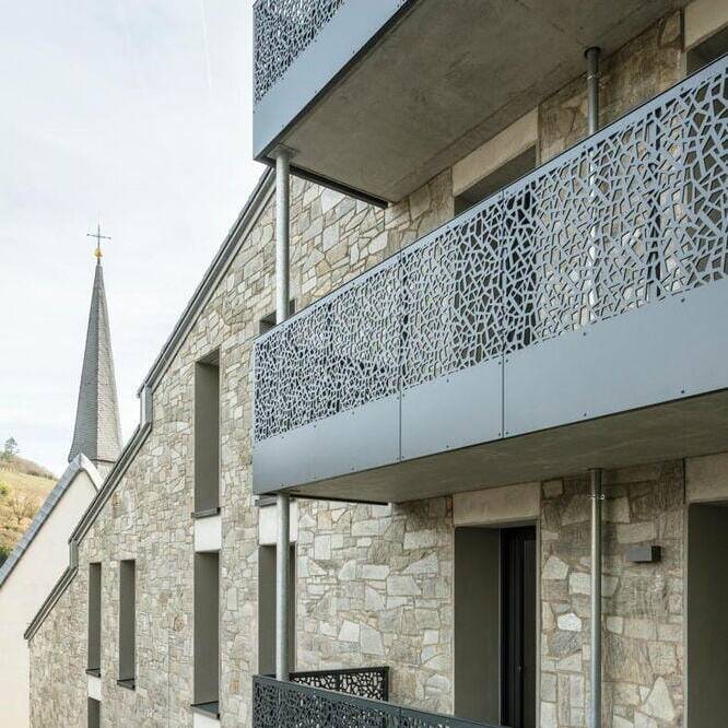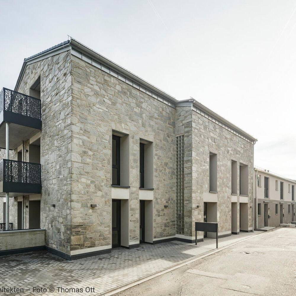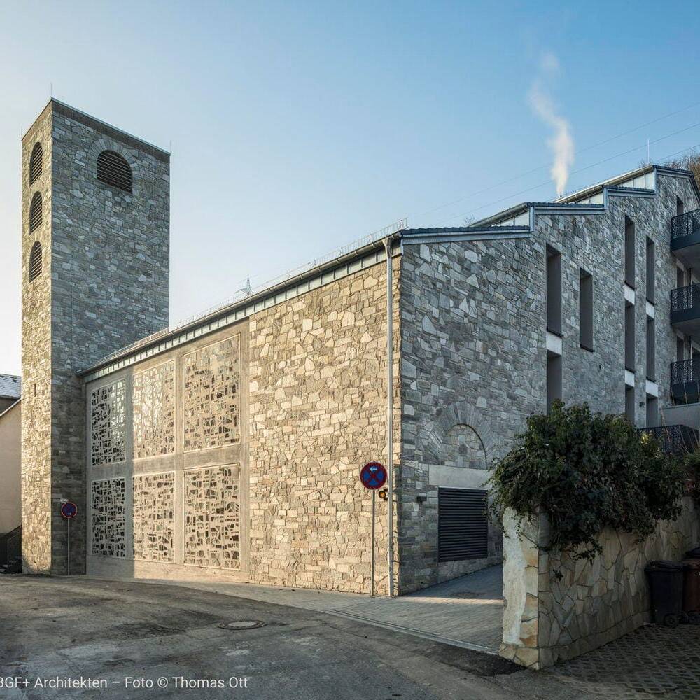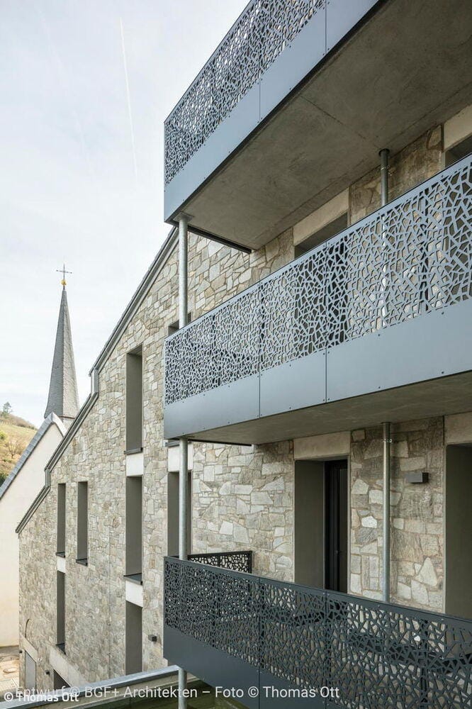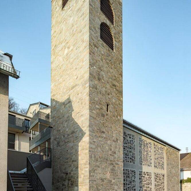 Das Ergebnis ist ein Wohnensemble, das Altes und Neues in Balance hält: Der charakteristische Natursteinbau und der markante Kirchturm blieben erhalten und prägen weiterhin das Ortsbild. Neue, vertikal proportionierte Fenster zitieren die Formensprache klassischer Kirchenfenster und bringen Licht und Leichtigkeit in die Fassade. Die einstige Kirche bleibt damit, was sie immer war: ein identitätsstiftender Ort – nun mit einem neuen, weltlichen Leben gefüllt. Im Inneren entkernten die Architekten das Gebäude vollständig. Innerhalb der  alten Natursteinwände entstand ein energetisch hochwertiges „Haus im Haus“ aus Poroton-Ziegeln mit 93 Zentimeter starken Wänden. Das neue Tragwerk sorgt für Stabilität und ermöglicht flexible Grundrisse. Ein Aufzugskern aus Stahlbeton erschließt nun vier Geschosse mit insgesamt neun Zwei- bis Vierzimmerwohnungen. Die oberen Ebenen profitieren von der beeindruckenden Raumhöhe des ehemaligen Kirchenschiffs, während neue Balkone und großzügige Fenster Ausblicke auf die Rauenthaler Weinberge eröffnen. Im Turm entstand ein kleines Turmzimmer – ein besonderer Rückzugsort mit Geschichte.