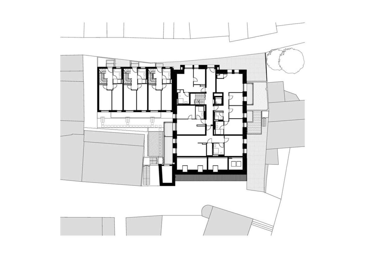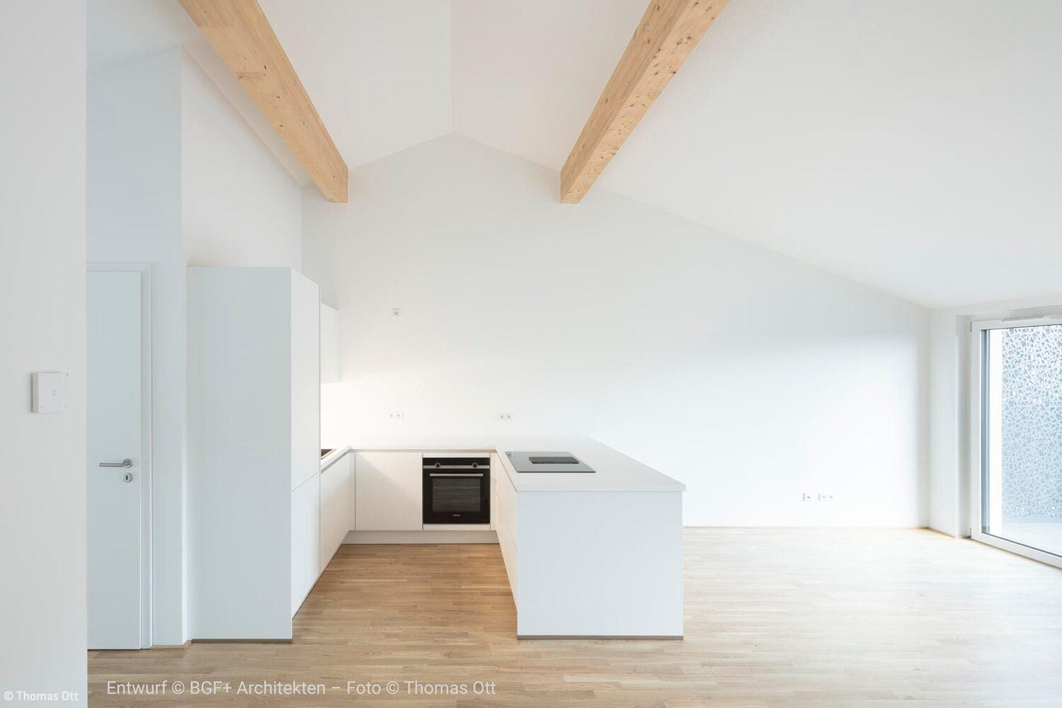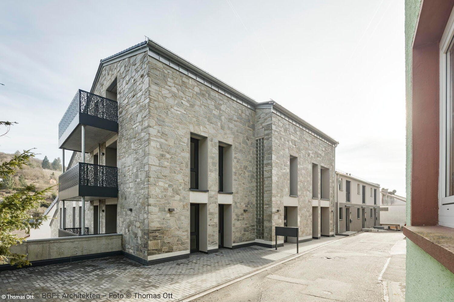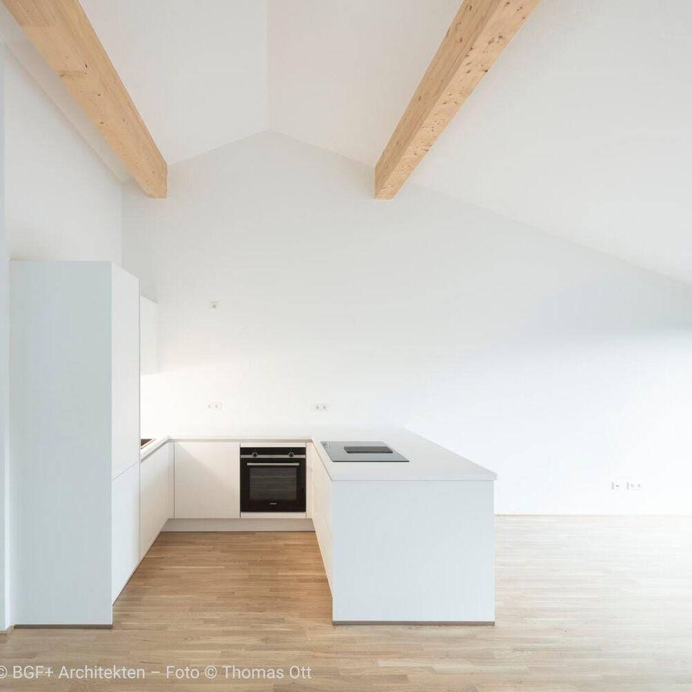 Das Ergebnis ist ein Wohnensemble, das Altes und Neues in Balance hält: Der charakteristische Natursteinbau und der markante Kirchturm blieben erhalten und prägen weiterhin das Ortsbild. Neue, vertikal proportionierte Fenster zitieren die Formensprache klassischer Kirchenfenster und bringen Licht und Leichtigkeit in die Fassade. Die einstige Kirche bleibt damit, was sie immer war: ein identitätsstiftender Ort – nun mit einem neuen, weltlichen Leben gefüllt. Im Inneren entkernten die Architekten das Gebäude vollständig. Innerhalb der  alten Natursteinwände entstand ein energetisch hochwertiges „Haus im Haus“ aus Poroton-Ziegeln mit 93 Zentimeter starken Wänden. Das neue Tragwerk sorgt für Stabilität und ermöglicht flexible Grundrisse. Ein Aufzugskern aus Stahlbeton erschließt nun vier Geschosse mit insgesamt neun Zwei- bis Vierzimmerwohnungen. Die oberen Ebenen profitieren von der beeindruckenden Raumhöhe des ehemaligen Kirchenschiffs, während neue Balkone und großzügige Fenster Ausblicke auf die Rauenthaler Weinberge eröffnen. Im Turm entstand ein kleines Turmzimmer – ein besonderer Rückzugsort mit Geschichte.
