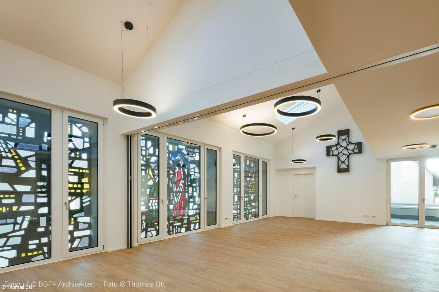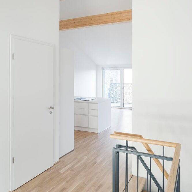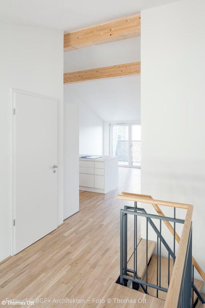 Ergänzt wird der Sakralbau durch einen Neubau an der Stelle des früheren Pfarrhauses, wo drei Townhouses das Ensemble komplettieren. Die Häuser verfügen über jeweils fünf Zimmer auf drei Ebenen, private Terrassen und kleine Gärten. Die Hanglage war dabei eine planerische und logistische Herausforderung: Zwischen Kirchstraße und Rotheckerstraße liegen rund 7,5 Meter Höhenunterschied, denen das Bauwerk nun elegant folgt. Auch die Kirchengemeinde bleibt vor Ort präsent. In Teilen des Erdgeschosses finden sich ein Gemeindesaal, eine Küche und eine Bibliothek, Räume, die auch weiterhin Begegnung ermöglichen. Die hier erhaltenen Betonglasfenster des Künstlers Johannes Beeck tauchen den Raum in ein weiches, farbiges Licht und verweisen auf die sakrale Vergangenheit. Das Projekt zeigt beispielhaft, wie Geschichte bewahrt, Ressourcen geschont und Gemeinschaft gestärkt werden und ein Ort entsteht, an dem sich Vergangenheit und Zukunft unter einem Dach vereinen.