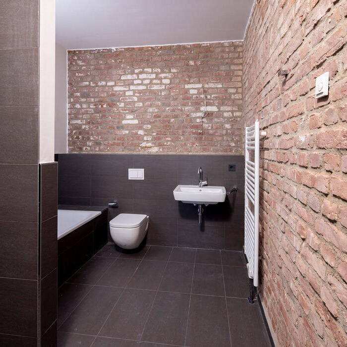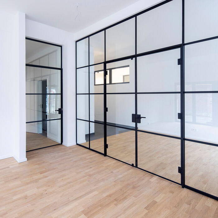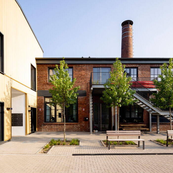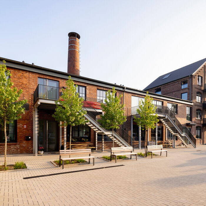Das hinter einer Zufahrt verborgene, etwa 4.000 m² große Areal umfasste unter anderem eine viergeschossige Industriemühle, ein zweigeschossiges Werkstattgebäude sowie eine große Stahlbauhalle. Die Bestandsgebäude wurden umfangreich saniert und an die neue Nutzung adaptiert. Die prägenden konstruktiven Strukturen der Gebäude zu erhalten und mit den heutigen Anforderungen der Bauphysik sowie des Brandschutzes zu verbinden, stellte sich dabei als die größte Herausforderung dar. So verlangte in der Industriemühle etwa die alte Kappendecke mit Stahlträgern aufwendige Sonderlösungen – zumal sie mit den neu eingezogenen Balkonträgern zu kombinieren war. Und auch beim Umbau der Halle, die heute den Großteil der insgesamt 23 Wohnungen beherbergt, gab es Herausforderungen zu meistern. Um das alte Stahltragwerk zu erhalten, zugleich aber auch eine Unterteilung in mehrere Brandabschnitte und eine barrierefreie Erschließung mit Aufzügen zu gewährleisten, musste eine neue massive Hülle um das alte Tragwerk gelegt werden. Im Eingangsbereich des Gebäudes erinnert noch die erhaltene Kranbahn an die frühere Nutzung der Halle. Nach dem Rückbau von nicht nutzbaren Nebengebäuden konnten die beiden zweigeschossigen Neubauten und eine Tiefgarage ergänzt werden, um den Abschluss für den Innenhof zu bieten – ein zentraler Platz, der den Bewohner:innen für Begegnung und Austausch zur Verfügung steht. Alt- und Neubauten wurden dabei in ihrer Fassadengestaltung harmonisch aufeinander abgestimmt. Der rote Backsteinklinker des Bestands stand Pate für die Fassadengestaltung der Neubauten mit ebenfalls roten Backsteinriemchen. Kombiniert wird der Backstein mit golden eloxierten Blechpaneelen, die eine unterschiedliche Haptik aufweisen. So ist die gesamte Westfront der alten Halle mit einem filigranen Zackenprofil-Blech verkleidet, das das Gebäude besonders heraushebt. Eingangsbereiche, Sicht- und Eckfenster wurden dazu – bei Neu- wie Altbau – mit einem glatteren Blech akzentuiert. Die entstandenen Wohnungen sind größtenteils barrierefrei ausgeführt und haben zugleich doch individuelle Grundrisse, mit Raumhöhen bis zu fünf Metern. Dabei konnte das Sichtmauerwerk teilweise aufgearbeitet werden und der weitläufige Loftcharme ließ sich durch den Einbau von Glastrennwänden, anstelle von konventionellen Trockenbauwänden, erhalten. So ist es gelungen den Industriecharakter modern umzusetzen und dem Projekt eine ganz eigene Note zu geben.
