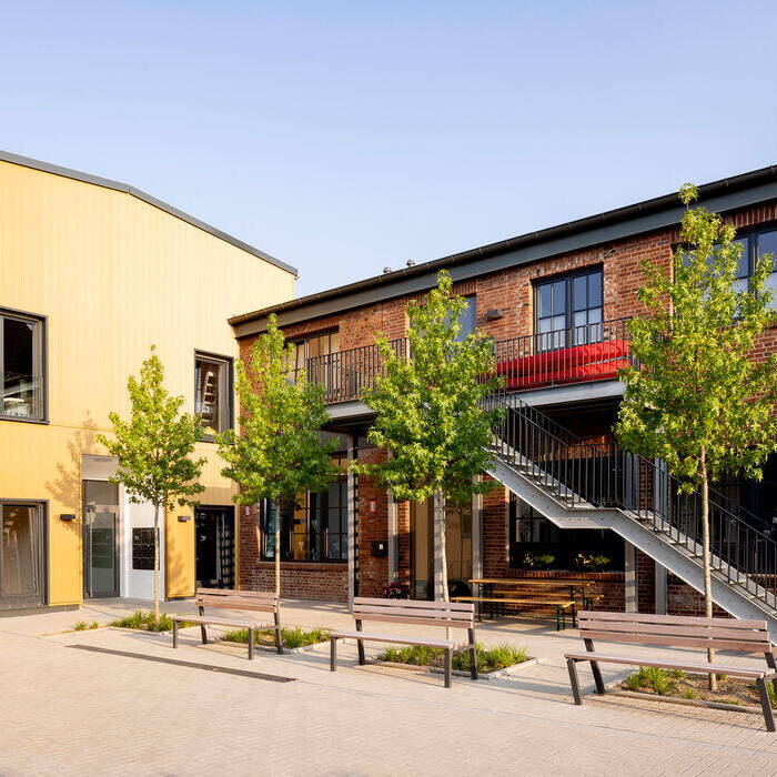 Ein Hinterhof mit alten Gewerbehallen in Langenfeld, der zuletzt der Gerätefirma Keller als Standort diente, besaß nicht zuletzt wegen seiner ruhigen, von der stark befahrenen Hauptstraße abgetrennten Lage das Potenzial zu einem attraktiven Wohnstandort. Rotterdam Dakowski Architekten aus Leverkusen haben drei Bestandsgebäude saniert und mit zwei zusätzlichen Neubauten zu einer barrierefreien innerstädtischen Wohnoase mit einer Büroeinheit nachverdichtet. Diese erhält den alten Industriecharme und schreibt ihn fort.