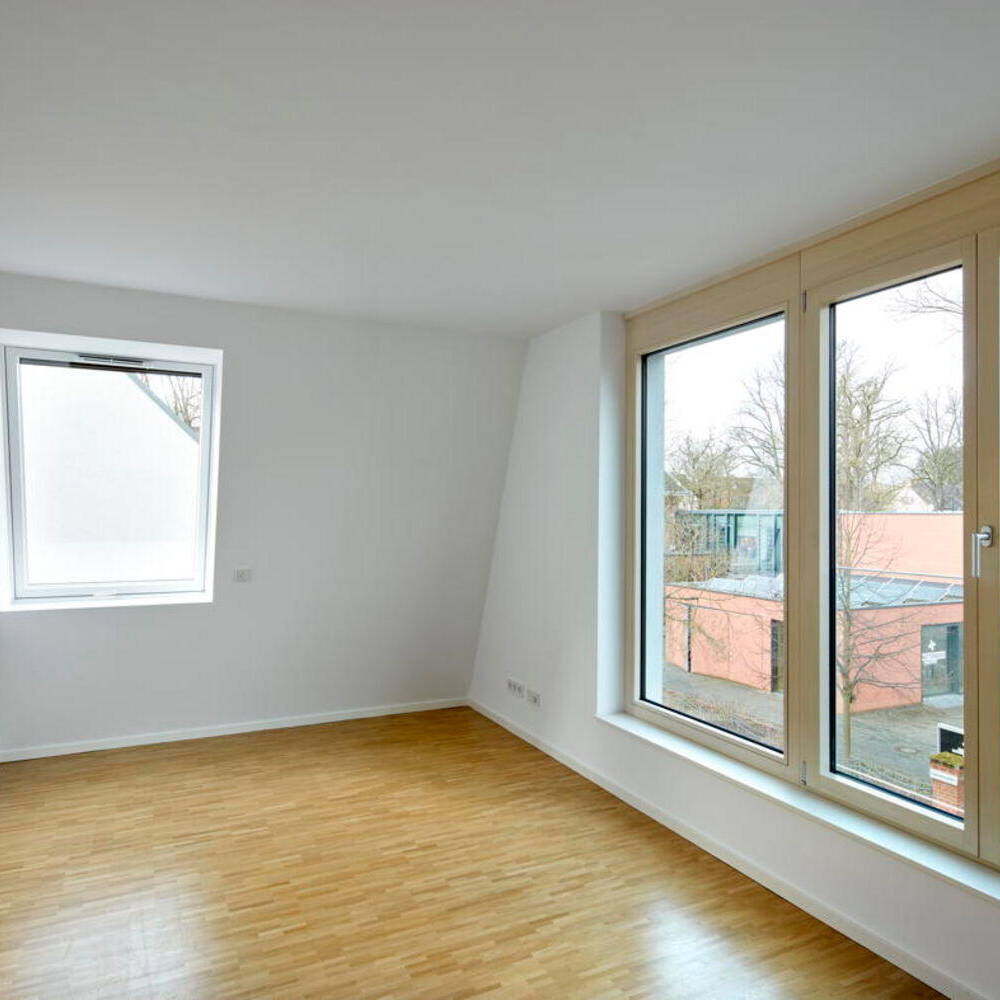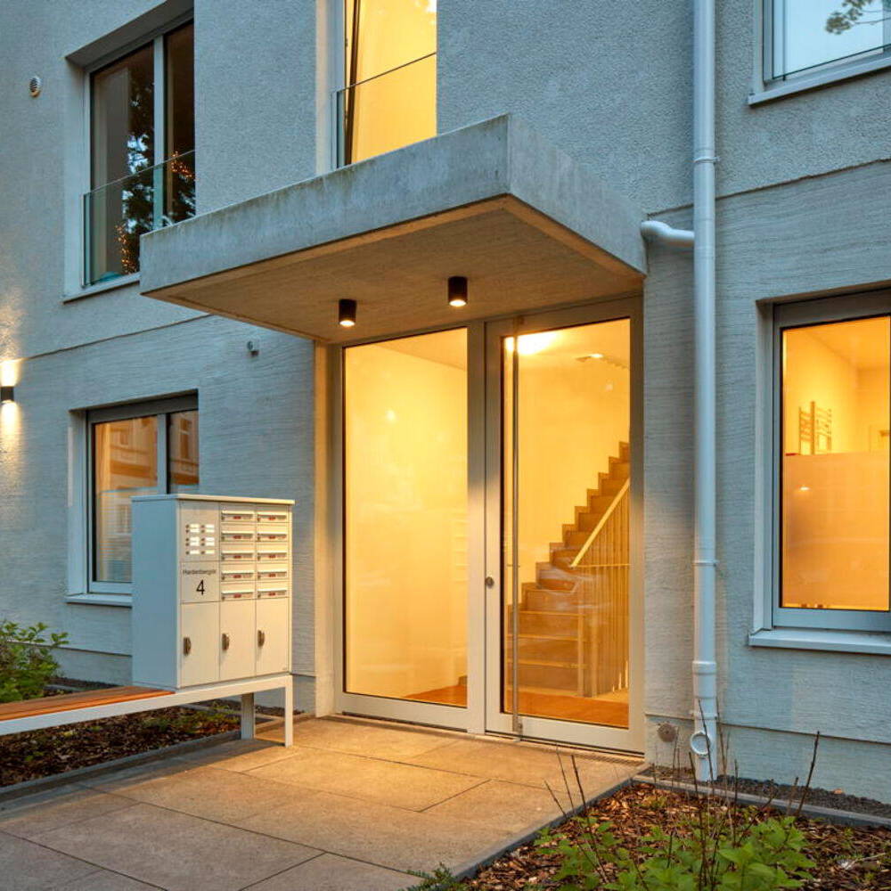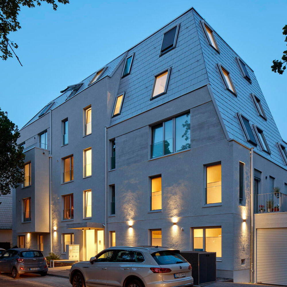 Die plastische Wirkung der Dachform wird durch das monochrome Erscheinungsbild weiter unterstrichen: Ein helles Lichtgrau prägt die mit Besenstrich ausgeführte Kratz-Putzfassade, die Holz-Alufenster sowie ihre Raffstores genauso wie das Dach aus Faserzementplatten und die Absturzsicherungen. Es entsteht eine einheitliche und zugleich zurückhaltende Wirkung im Stadtraum. Vielfältig sind dagegen die Grundrisse der Ein- bis Viereinhalb-Zimmerwohnungen: Neun sehr individuell geschnittene, lichtdurchflutete und barrierefreie Wohneinheiten mit großzügigen Balkon- und Terrassenflächen bilden die neue Hausgemeinschaft. Auch zwei Maisonette-Wohnungen sind darunter, die sich jederzeit flexibel zu zwei kleineren Wohneinheiten separieren lassen. Neben dem Wohnraum nimmt das Haus zudem eine soziale Nutzung auf: Erdgeschoss und Souterrain werden von der Diakonie für die Tagesbetreuung von Grundschüler:innen genutzt. Energetisch punktet der Neubau durch eine dachgestützte Luftwärmepumpe mit Fußbodenheizung und kontrollierte Wohnraumlüftung über Fensterfalzlüfter, zwei Duplex-Garagen mit Wallbox-Anschlüssen sowie den Fahrradkeller mit E-Ladedosen. In einer zweiten Ausbaustufe soll schließlich noch eine PV-Anlage auf dem Dach folgen.