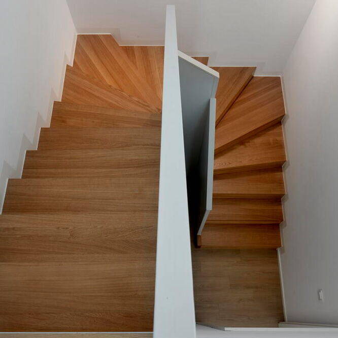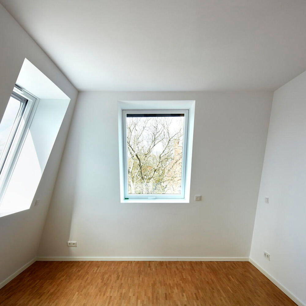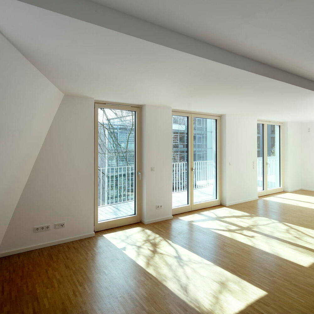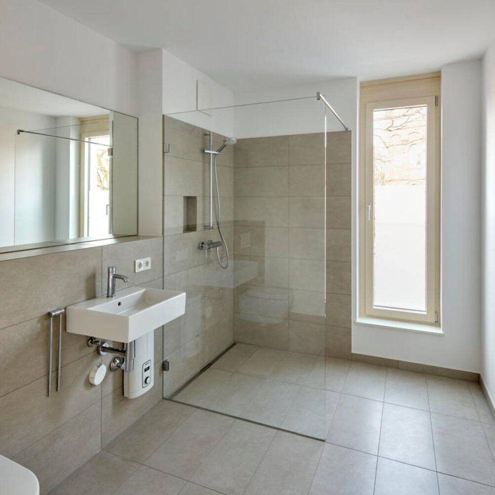Die plastische Wirkung der Dachform wird durch das monochrome Erscheinungsbild weiter unterstrichen: Ein helles Lichtgrau prägt die mit Besenstrich ausgeführte Kratz-Putzfassade, die Holz-Alufenster sowie ihre Raffstores genauso wie das Dach aus Faserzementplatten und die Absturzsicherungen. Es entsteht eine einheitliche und zugleich zurückhaltende Wirkung im Stadtraum. Vielfältig sind dagegen die Grundrisse der Ein- bis Viereinhalb-Zimmerwohnungen: Neun sehr individuell geschnittene, lichtdurchflutete und barrierefreie Wohneinheiten mit großzügigen Balkon- und Terrassenflächen bilden die neue Hausgemeinschaft. Auch zwei Maisonette-Wohnungen sind darunter, die sich jederzeit flexibel zu zwei kleineren Wohneinheiten separieren lassen. Neben dem Wohnraum nimmt das Haus zudem eine soziale Nutzung auf: Erdgeschoss und Souterrain werden von der Diakonie für die Tagesbetreuung von Grundschüler:innen genutzt. Energetisch punktet der Neubau durch eine dachgestützte Luftwärmepumpe mit Fußbodenheizung und kontrollierte Wohnraumlüftung über Fensterfalzlüfter, zwei Duplex-Garagen mit Wallbox-Anschlüssen sowie den Fahrradkeller mit E-Ladedosen. In einer zweiten Ausbaustufe soll schließlich noch eine PV-Anlage auf dem Dach folgen.