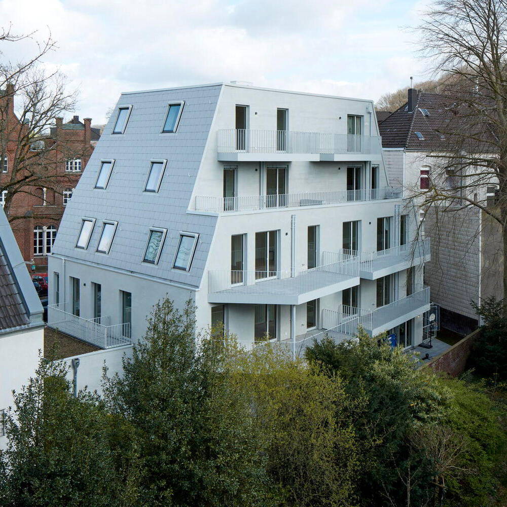Bereits 2008 konnten pier7 architekten aus Düsseldorf für die Evangelische Kirchengemeinde Gerresheim ein neues Gemeindezentrum planen, das sich behutsam in den Denkmalbestand integriert. Auf der gegenüberliegenden Seite der Hardenbergstraße ergab sich für das Büro nun erneut die Gelegenheit, Fingerspitzengefühl im Umgang mit dem Ort zu zeigen: Für die Kirchengemeinde wurde ein neues barrierefreies Mehrfamilienhaus geplant, das sich dank seiner komplexen Kubatur mit Augenmaß harmonisch in die Umgebung einfügt. Das Grundstück, das zuvor nur mit einem eingeschossigen, sanierungsbedürftigen Pfarrhaus bebaut war, bot das Potenzial für eine bessere Ausnutzung mit einem mehrgeschossigen Wohnhaus. An einem Straßenknick zwischen einer geschlossenen, bestandgeschützten Gründerzeitbebauung und einer niedrigen aufgelockerten Wohnbebauung gelegen, war beim Entwurf die größte Herausforderung, das richtige Maß für den Neubau inmitten des heterogenen Bestands zu finden. Den Übergang stellt ein drei- bis viergeschossiger Baukörper her: Dieser richtet sich unter Einbeziehung der Abstandsflächen an den Baufluchten der Anrainer aus ist sowohl straßen- wie auch gartenseitig in der Höhe gestaffelt. Dabei sind es besonders die zu drei Seiten steil geneigten Dachflächen, mit denen eine unterschiedliche Anschlusshöhe zu den Nachbargebäuden ausgebildet wird.