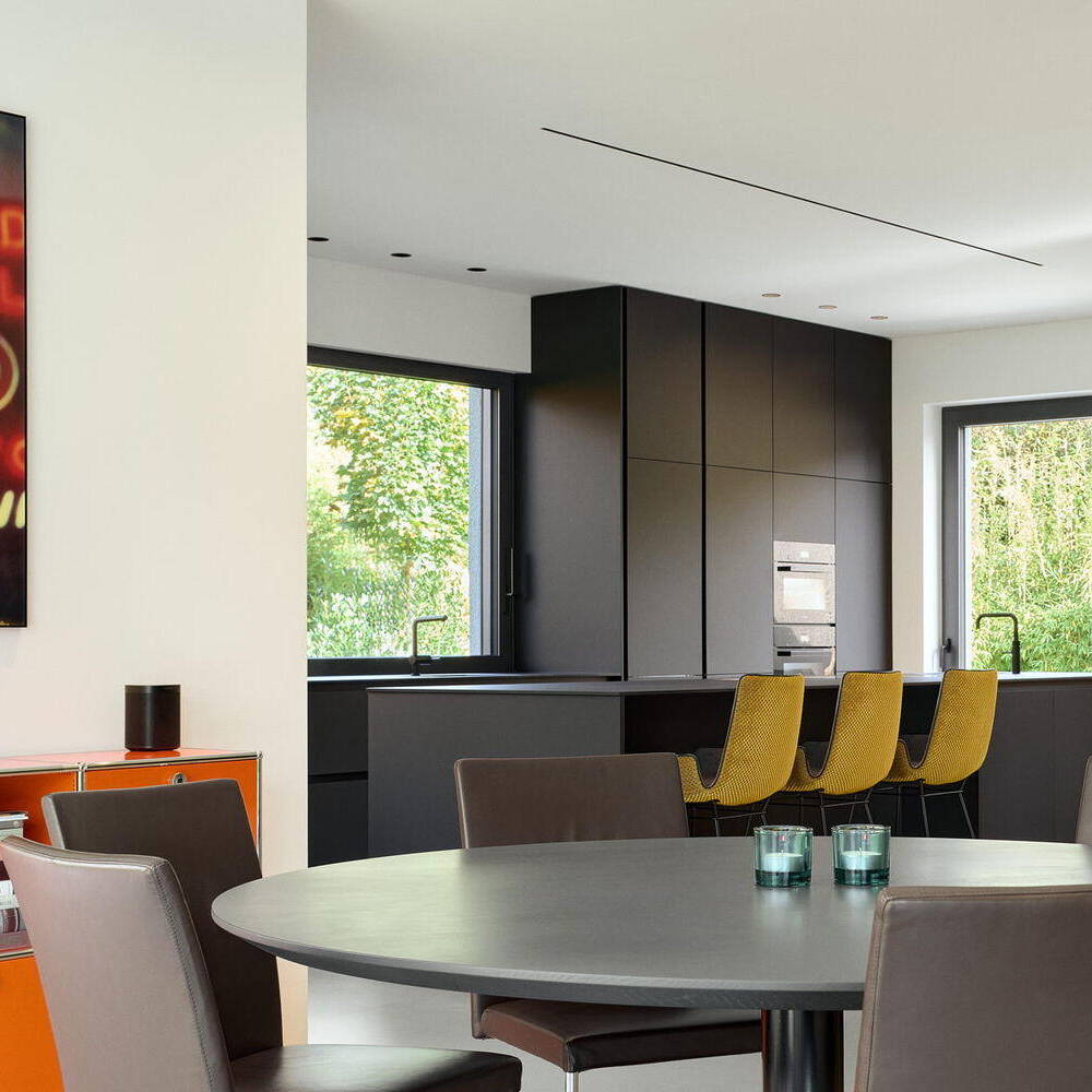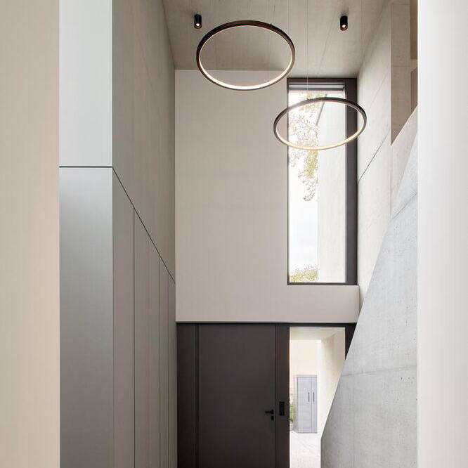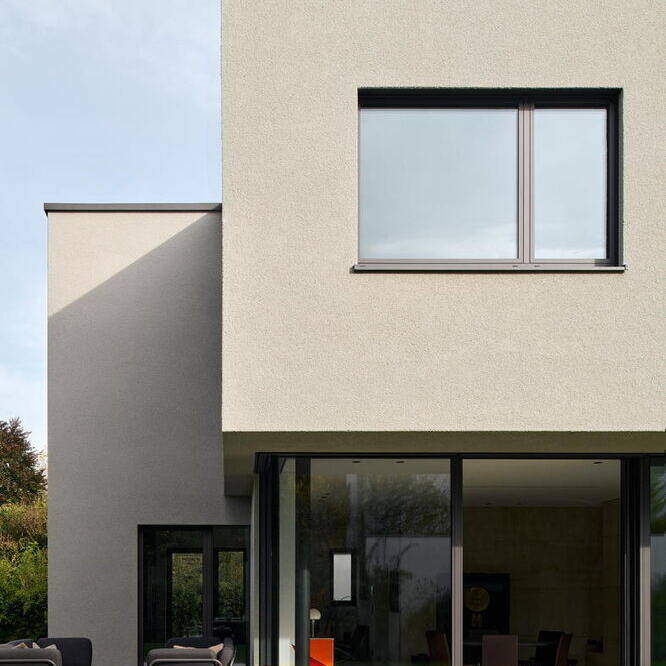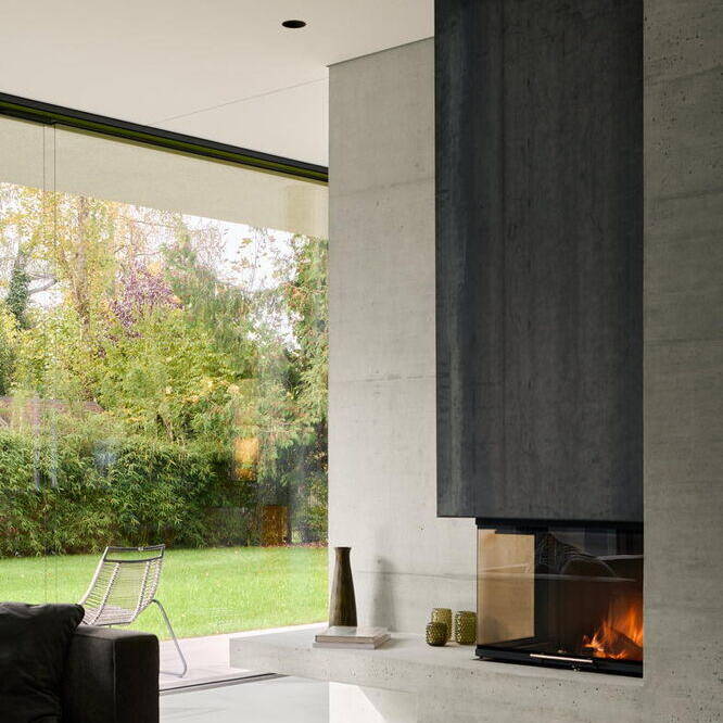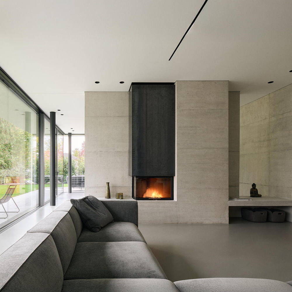 Die Vorderfront des Hauses ist als klassische Lochfassade ausgebildet. Bewusst zurückhaltend gesetzten Fensteröffnungen verleihen dem Gebäude einen fast schon verschlossenen Charakter. Als Kontrast hierzu öffnet sich das Haus gartenseitig über die gesamte Breite der Wohnräume, mit einer großflächigen, raumhohen Fensterfront, im wahrsten Sinn des Wortes ins Grüne. Sichtbeton bestimmte auch im Innern die Gestaltung. Aufgrund seiner Klarheit und elegant-noblen Wirkung gehörte es zum Entwurf, das Material der Wahl bewußt als sinnlich erfahrbares Gestaltungselement einzusetzen. Zentral im Haus angeordnet, erstreckt es sich über alle Geschosse und integriert als Kern auch Treppen und den Kamin im Erdgeschoss. Die Verteilung der Räume folgt dem klassischen Muster: Im Anschluss an einen zweigeschossigen Eingangsbereich folgt der halböffentliche Bereich mit Kochen, Essen und Entspannen in einer Polsterlandschaft. Die privaten Räume liegen im Obergeschoss – das Elternschlafzimmer mit Masterbad und Ankleide sowie die Kinderzimmer, ebenfalls mit Bad. Die Energieversorgung und Heizung werden zu einem großen Teil durch Geothermie und eine Grundwasser-Wärmepumpe gewährleistet. Das Projekt nahm inklusive Planung und Realisierung insgesamt drei Jahre in Anspruch. Da nur eine schmale Zufahrt von knapp drei Metern auf das rückwärtige Grundstück führte, bedeutete das gewisse Schwierigkeiten für das Baugeschehen, die jedoch erfolgreich gemeistert werden konnten.