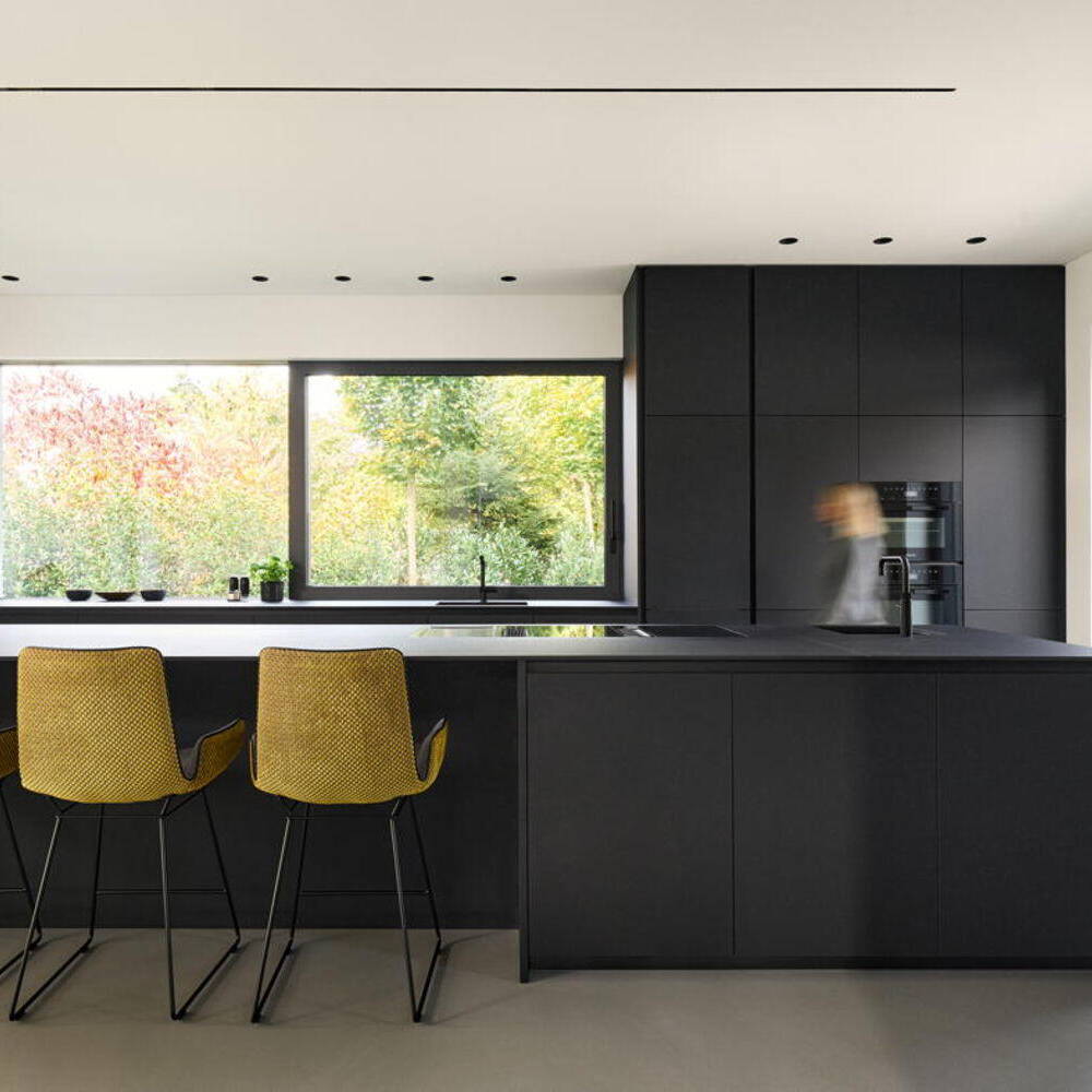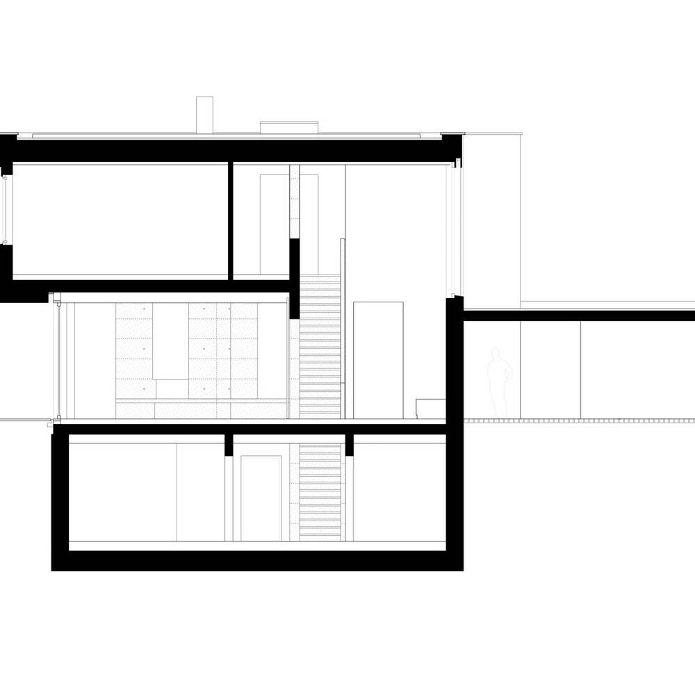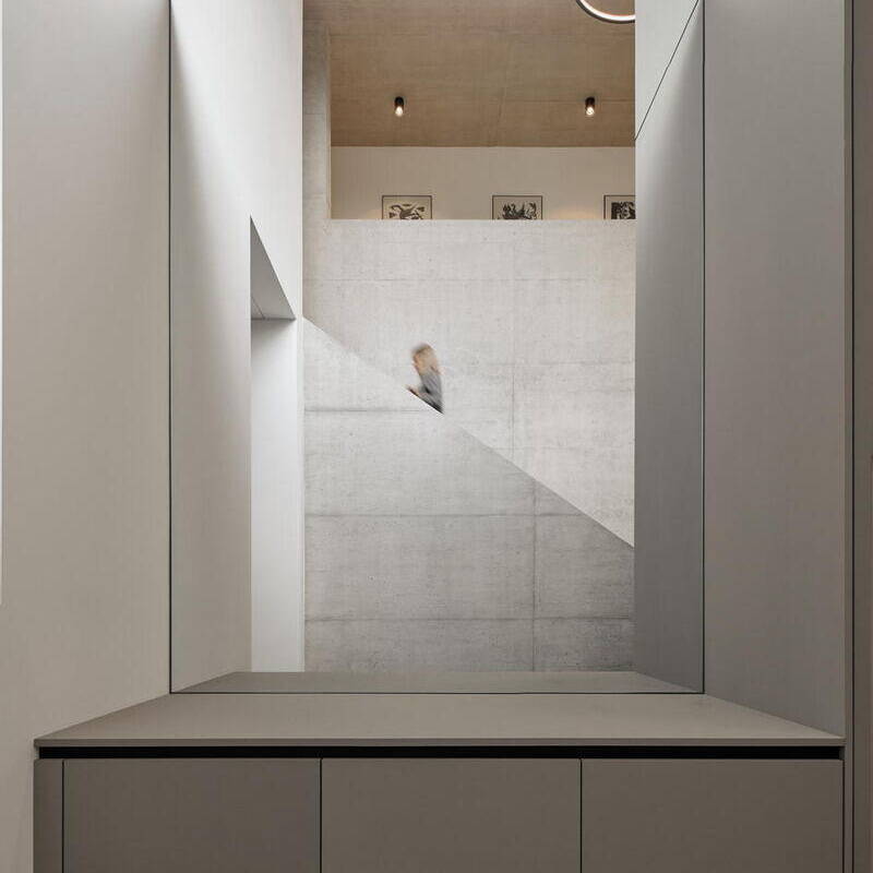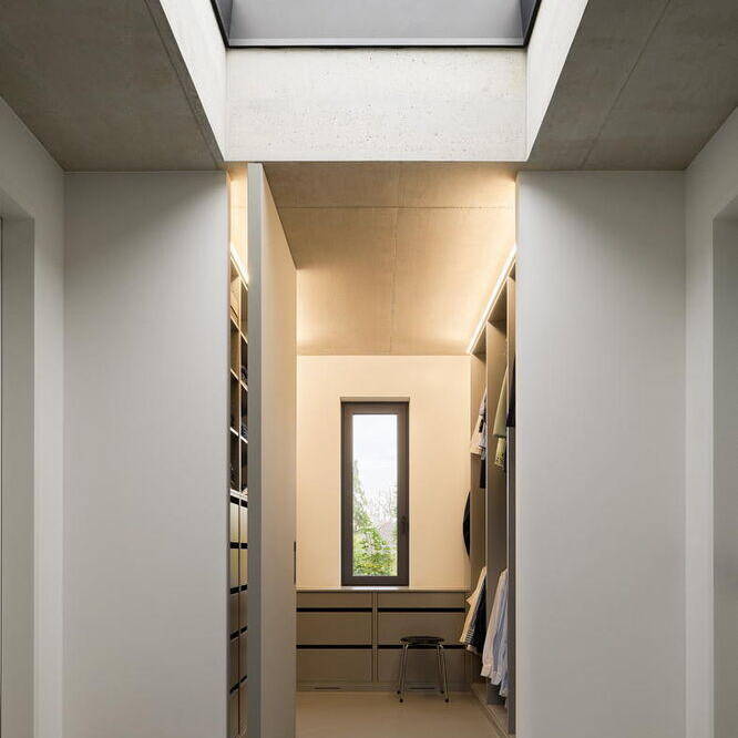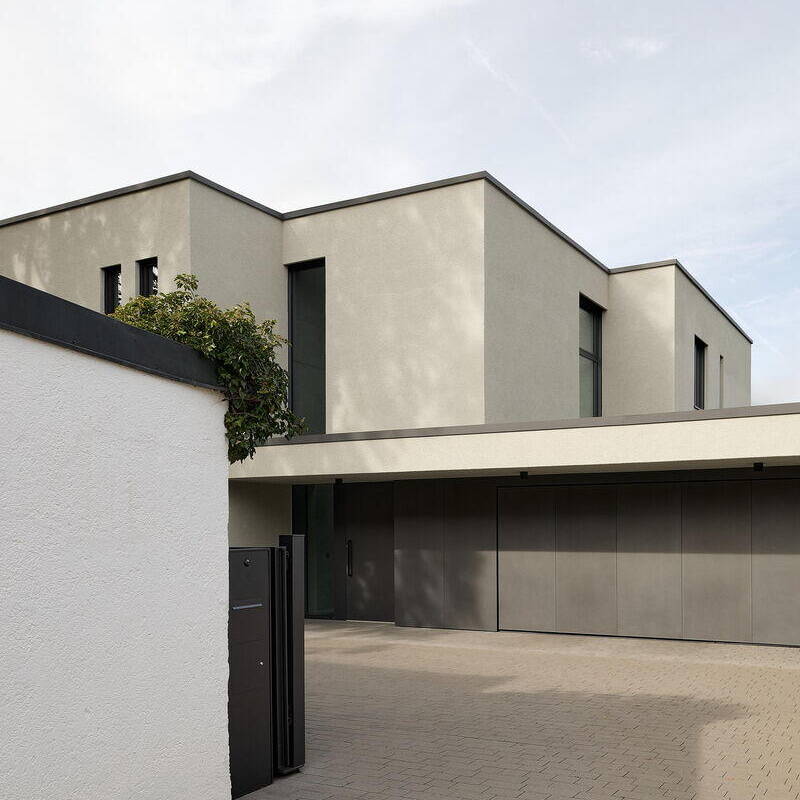 Die Vorderfront des Hauses ist als klassische Lochfassade ausgebildet. Bewusst zurückhaltend gesetzten Fensteröffnungen verleihen dem Gebäude einen fast schon verschlossenen Charakter. Als Kontrast hierzu öffnet sich das Haus gartenseitig über die gesamte Breite der Wohnräume, mit einer großflächigen, raumhohen Fensterfront, im wahrsten Sinn des Wortes ins Grüne. Sichtbeton bestimmte auch im Innern die Gestaltung. Aufgrund seiner Klarheit und elegant-noblen Wirkung gehörte es zum Entwurf, das Material der Wahl bewußt als sinnlich erfahrbares Gestaltungselement einzusetzen. Zentral im Haus angeordnet, erstreckt es sich über alle Geschosse und integriert als Kern auch Treppen und den Kamin im Erdgeschoss. Die Verteilung der Räume folgt dem klassischen Muster: Im Anschluss an einen zweigeschossigen Eingangsbereich folgt der halböffentliche Bereich mit Kochen, Essen und Entspannen in einer Polsterlandschaft. Die privaten Räume liegen im Obergeschoss – das Elternschlafzimmer mit Masterbad und Ankleide sowie die Kinderzimmer, ebenfalls mit Bad. Die Energieversorgung und Heizung werden zu einem großen Teil durch Geothermie und eine Grundwasser-Wärmepumpe gewährleistet. Das Projekt nahm inklusive Planung und Realisierung insgesamt drei Jahre in Anspruch. Da nur eine schmale Zufahrt von knapp drei Metern auf das rückwärtige Grundstück führte, bedeutete das gewisse Schwierigkeiten für das Baugeschehen, die jedoch erfolgreich gemeistert werden konnten.