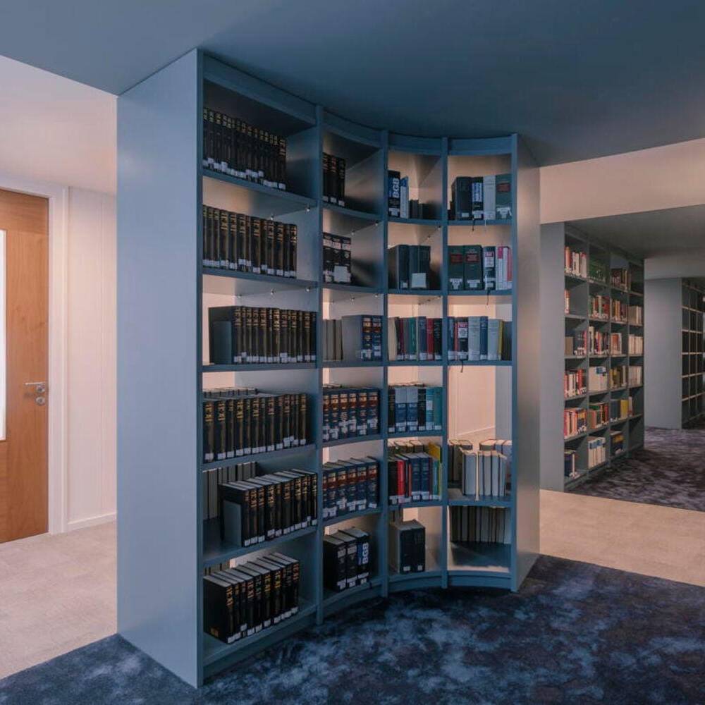 Das Gestaltungskonzept vom Architekturbüro CSMM soll die Transformationen des Ortes räumlich erfahrbar machen und übersetzt die Gebäudegeschichte in drei gestalterische Epochen: Der Mandantenbereich greift mit subtilen Anklängen an die 1920er-Jahre die Handschrift von Professor Hans Kollhoff auf, dessen an klassischer Moderne angelehnte Formensprache die Berliner Innenstadt bis heute prägt. Die Arbeitsbereiche verkörpern indes das sogenannte „sleek present“– zeitlos, hell und reduziert auf das Wesentliche. Die Gemeinschaftszonen stehen für eine neue Identität: farbenfroh, offen und auf Interaktion ausgerichtet. Relevante Bestandselemente wurden bewusst integriert und neu inszeniert: Hierzu zählen sowohl originale Türen als auch die Flurleuchten von Louis Poulsen (von Halogen auf LED umgerüstet); ebenso der Empfangstresen und die markante Onyx-Wand im Eingangsbereich sowie die von Hans Kollhoff entworfenen Zitronenholzpaneele und Beschläge. Als klassische Kanzlei mit überwiegend verzimmerten Arbeitsbereichen stellte sich bei Linklaters LLP vor allem die Frage, wie Rückzug und konzentriertes Arbeiten mit Austausch und Gemeinschaft verbunden werden können. Als gestalterisches Element diente das kommunikative Zentrum der Kanzlei als neu geschaffenes „Social Heart“: Die vormals geschlossene Bibliothek wurde geöffnet und über beide Etagen verteilt, während der zuvor fensterlose Flur Glastrennwände erhielt, die Licht und Transparenz schaffen. Variierende Flurbreiten ermöglichen neue Gemeinschaftszonen wie Teeküchen, Druckerstationen und Bibliotheksbereiche – und schaffen so entspannte Orte für Begegnung und Wissensaustausch.