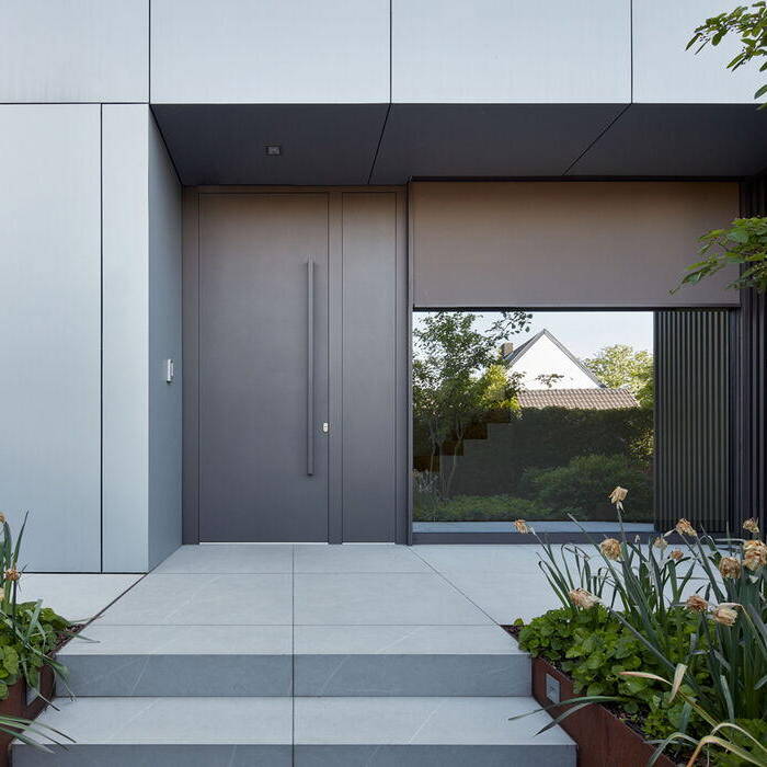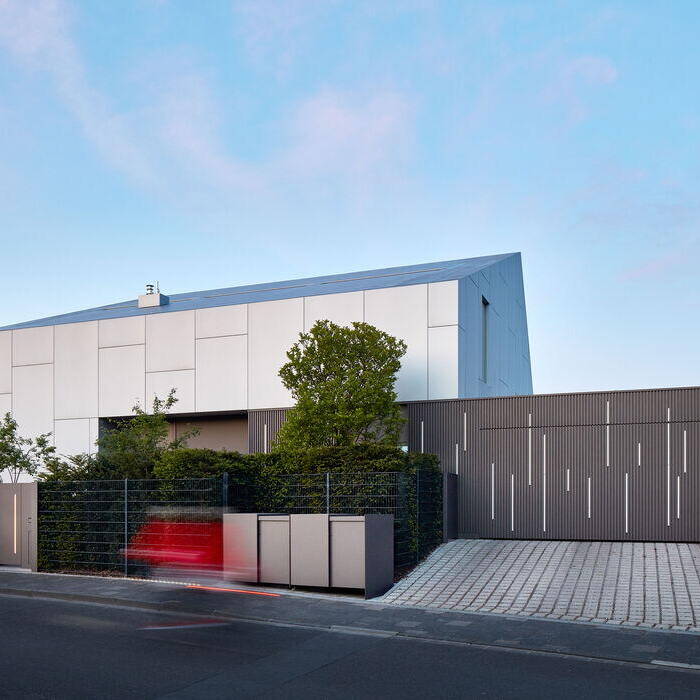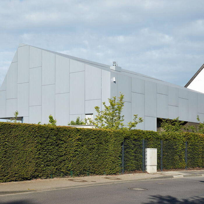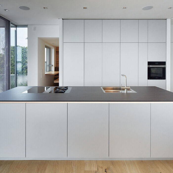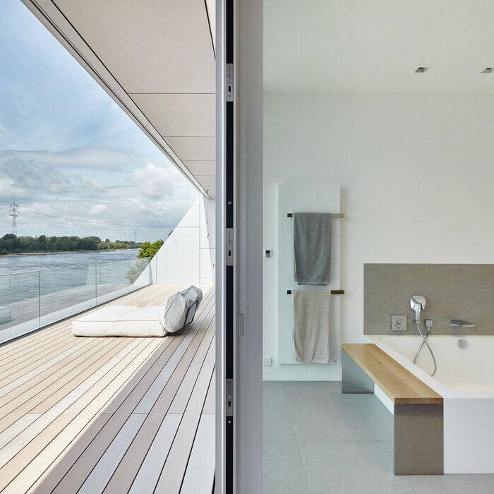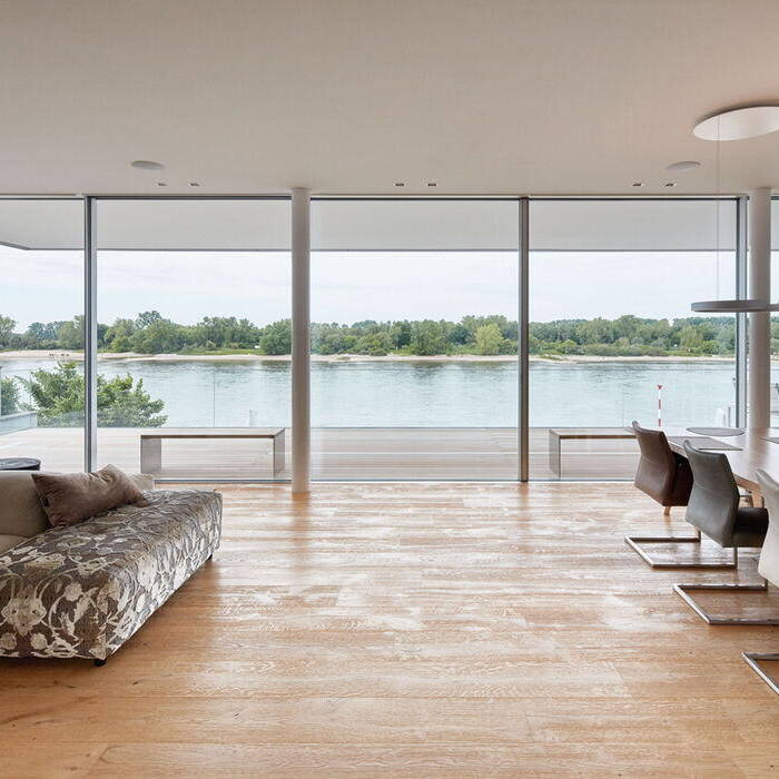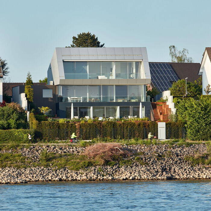 Eigentlich hatten die Bauherren auf dem Grundstück für die vierköpfige Familie ein eingeschossiges Flachdachhaus mit zusätzlichem Staffelgeschoss bauen wollen. Eine entsprechende Bauvoranfrage wurde im Jahre 2018 positiv beschieden. Die Novellierung der Bauordnung im Folgejahr und ein ultimativer richterlicher Beschluss machten das Vorhaben allerdings nicht mehr genehmigungsfähig – das Gebäude musste entsprechend dem B-Plan aus den 1960er-Jahren zwingend mit einem Satteldach abgeschlossen werden. So entstand die ungewöhnliche Kubatur, die die Konturen der Nachbardächer aufnimmt und sich mit den Fassaden und Terrassen zu einem ungewöhnlichen skulpturalen Baukörper verbindet. Die Materialwahl unterstreicht diese Haltung, indem sich die Fassade aus großformatigen silberschimmernden Aluminium-Elementen in den Dachflächen kontinuierlich fortsetzt – scharfkantig reduziert, mit unsichtbarer Dachentwässerung. Die mit dem Eingangsbereich optisch verzahnte Doppelgarage tritt dazu mit einer sepiabraunen Lamellenfassade und integrierten LED-Bändern in den Hintergrund. Während sich der Neubau zur Straße eingeschossig und nahezu fensterlos hinter einem kleinen Vorgarten abschirmt, öffnet er sich zum Fluss mit einem ungewöhnlich weit auskragenden, verschattenden Steildach, einem eingeschobenen Erdgeschoss und dem sockelartig abgesetzten Untergeschoss. Durch die transparenten Glasfronten mit filigranen Schiebefensteranlagen bietet sich auf allen drei Etagen ein nahezu rahmenloser Ausblick auf den Rhein und es entsteht ein fast nahtloser Übergang zwischen Innen und Außen. Die funktionale Ordnung der Etagen spiegelt sich in klaren Grundrissen wider: Im Obergeschoss liegen Schlafräume und Bäder mit jeweils eigenen Terrassen. Im Erdgeschoss dehnt sich um einen Gaskamin großzügig der offene Wohn-/Koch- und Essbereich aus – samt einer gemütlichen Sitzecke, die einen besonders fokussierten Ausblick auf den Rhein erlaubt. Über eine Länge von fast viereinhalb Metern lässt sich die Wohnetage zum Terrassendeck öffnen; ein Treppenstieg aus Cortenstahl ermöglicht den Zugang in den Garten. Das Untergeschoss ist Gästeetage mit direktem Gartenzugang, bietet aber auch einen Arbeits- sowie einen Fitness- und Wellnessbereich mit einer Sauna, die eine beeindruckende Aussicht auf den Fluss bietet. Sämtliche Einbauten bis hin zur XXL-Badewanne im Masterbad – selbstverständlich mit Rheinblick – wurden nach Entwürfen der Architekten von einem Schreiner auf Maß gefertigt.