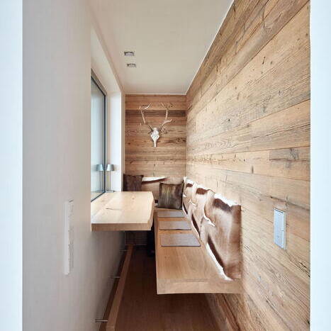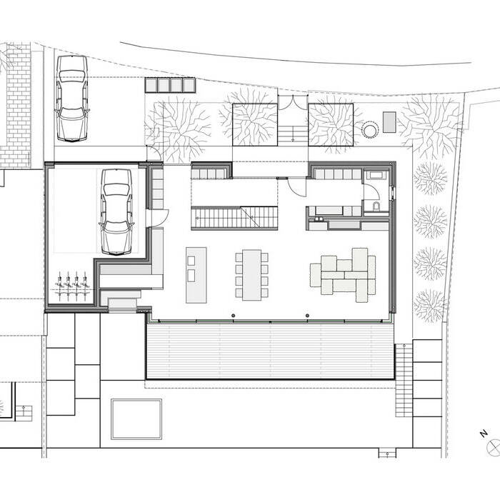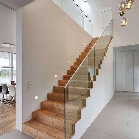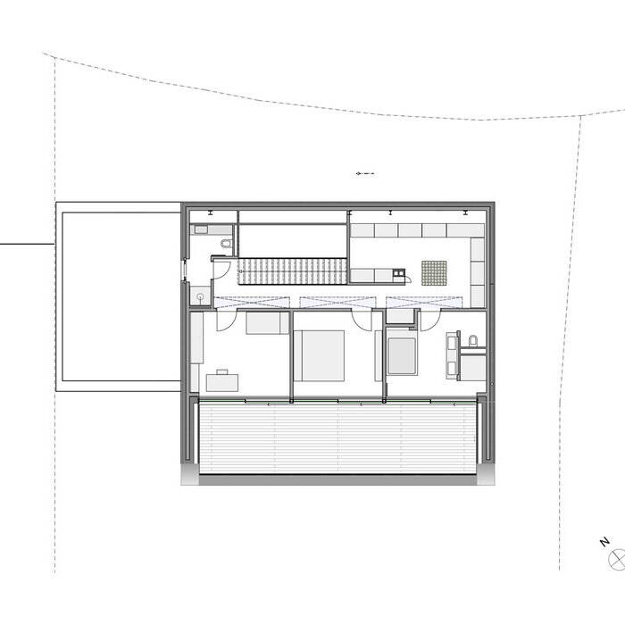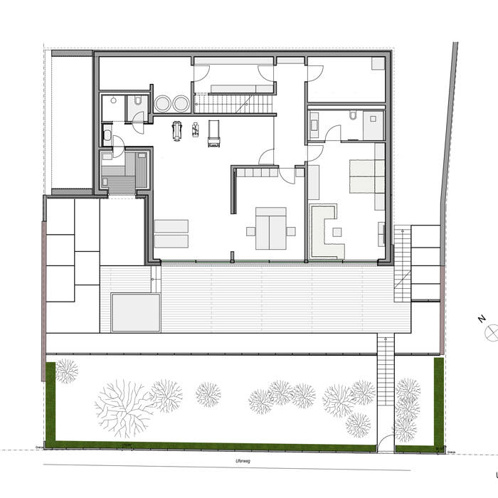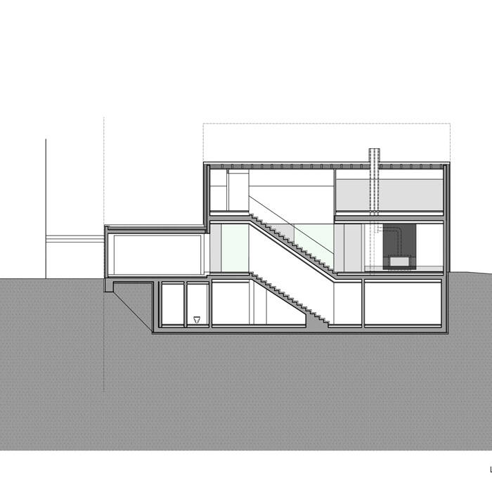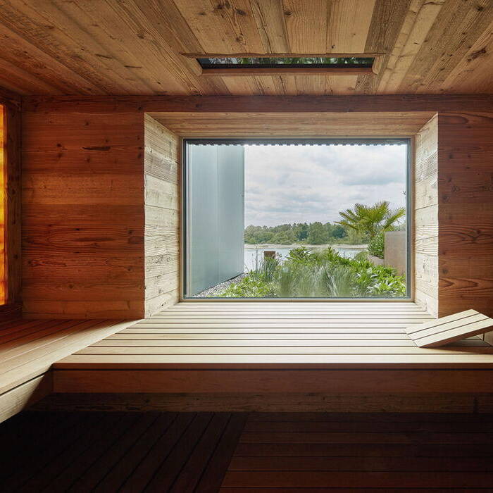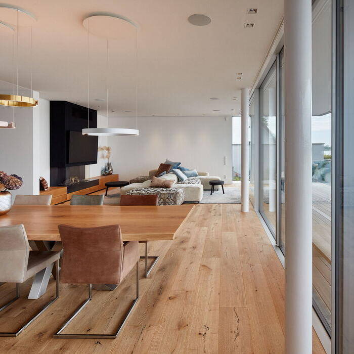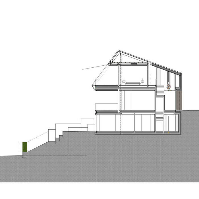 Eigentlich hatten die Bauherren auf dem Grundstück für die vierköpfige Familie ein eingeschossiges Flachdachhaus mit zusätzlichem Staffelgeschoss bauen wollen. Eine entsprechende Bauvoranfrage wurde im Jahre 2018 positiv beschieden. Die Novellierung der Bauordnung im Folgejahr und ein ultimativer richterlicher Beschluss machten das Vorhaben allerdings nicht mehr genehmigungsfähig – das Gebäude musste entsprechend dem B-Plan aus den 1960er-Jahren zwingend mit einem Satteldach abgeschlossen werden. So entstand die ungewöhnliche Kubatur, die die Konturen der Nachbardächer aufnimmt und sich mit den Fassaden und Terrassen zu einem ungewöhnlichen skulpturalen Baukörper verbindet. Die Materialwahl unterstreicht diese Haltung, indem sich die Fassade aus großformatigen silberschimmernden Aluminium-Elementen in den Dachflächen kontinuierlich fortsetzt – scharfkantig reduziert, mit unsichtbarer Dachentwässerung. Die mit dem Eingangsbereich optisch verzahnte Doppelgarage tritt dazu mit einer sepiabraunen Lamellenfassade und integrierten LED-Bändern in den Hintergrund. Während sich der Neubau zur Straße eingeschossig und nahezu fensterlos hinter einem kleinen Vorgarten abschirmt, öffnet er sich zum Fluss mit einem ungewöhnlich weit auskragenden, verschattenden Steildach, einem eingeschobenen Erdgeschoss und dem sockelartig abgesetzten Untergeschoss. Durch die transparenten Glasfronten mit filigranen Schiebefensteranlagen bietet sich auf allen drei Etagen ein nahezu rahmenloser Ausblick auf den Rhein und es entsteht ein fast nahtloser Übergang zwischen Innen und Außen. Die funktionale Ordnung der Etagen spiegelt sich in klaren Grundrissen wider: Im Obergeschoss liegen Schlafräume und Bäder mit jeweils eigenen Terrassen. Im Erdgeschoss dehnt sich um einen Gaskamin großzügig der offene Wohn-/Koch- und Essbereich aus – samt einer gemütlichen Sitzecke, die einen besonders fokussierten Ausblick auf den Rhein erlaubt. Über eine Länge von fast viereinhalb Metern lässt sich die Wohnetage zum Terrassendeck öffnen; ein Treppenstieg aus Cortenstahl ermöglicht den Zugang in den Garten. Das Untergeschoss ist Gästeetage mit direktem Gartenzugang, bietet aber auch einen Arbeits- sowie einen Fitness- und Wellnessbereich mit einer Sauna, die eine beeindruckende Aussicht auf den Fluss bietet. Sämtliche Einbauten bis hin zur XXL-Badewanne im Masterbad – selbstverständlich mit Rheinblick – wurden nach Entwürfen der Architekten von einem Schreiner auf Maß gefertigt.