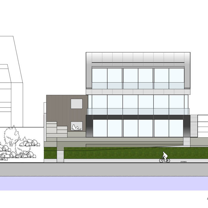 Eher überschaubar, dafür aber steil war das Grundstück auf einem Hochdeich des Rheins. Nordöstlich von einer Ortsstraße begrenzt, schien der Strom nach Südwesten sprichwörtlich zum Greifen nah. Die Düsseldorfer DDJ Architekten Döring Dahmen Joeressen entwickelten ein Wohnhaus auf drei Ebenen, das alle Räume großzügig mit Terrassen auf den Fluss ausrichtet – mit einer überraschend skulpturalen Wendung in der Kubatur.
