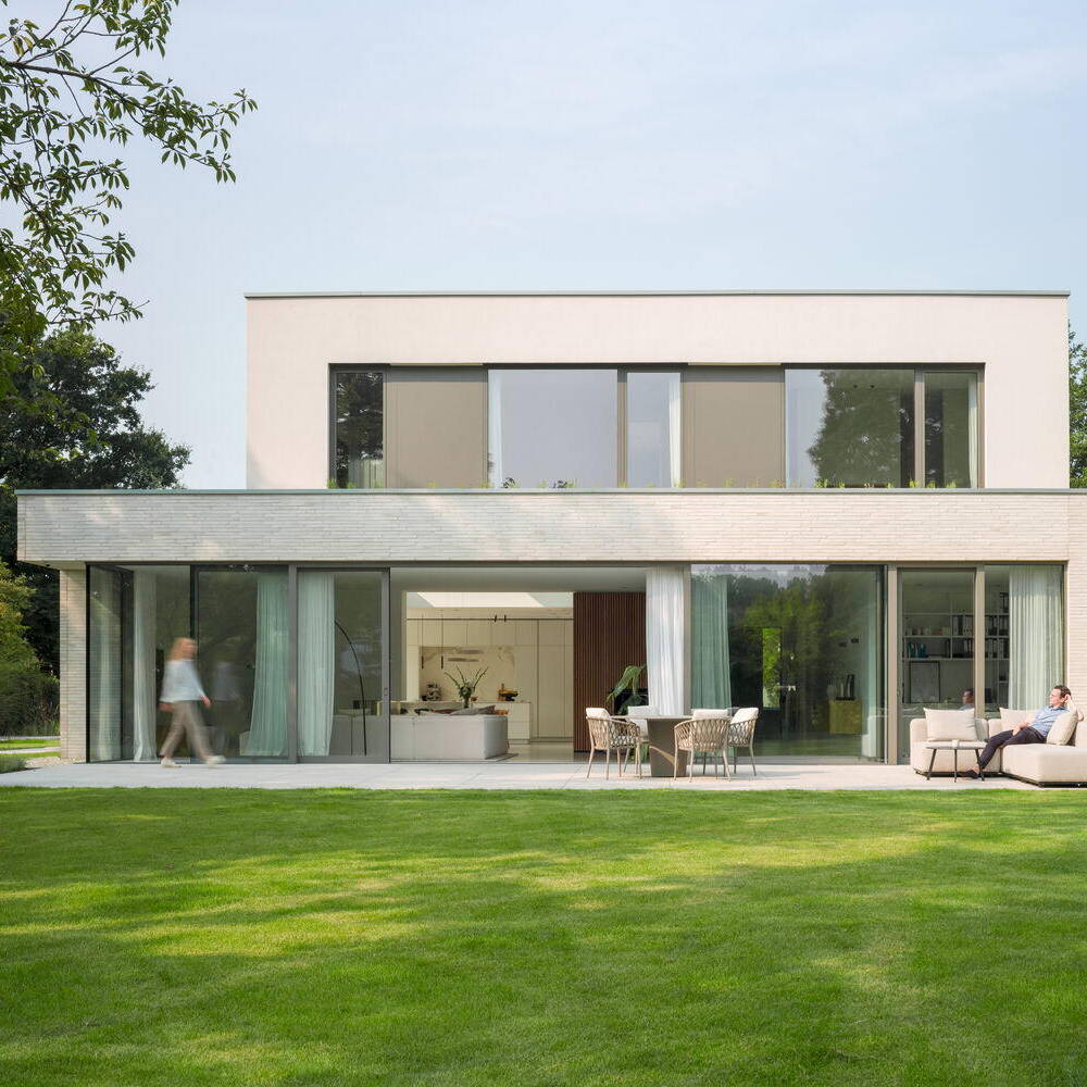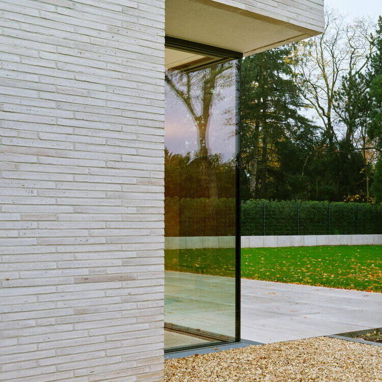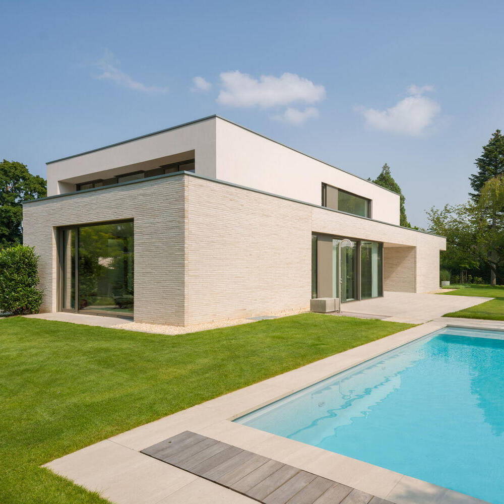 Das in einer ruhigen Wohngegend gelegene, großzügige Grundstück ist ein Traum: Mit ausreichendem Abstand zur Nachbarbebauung bot sich schrötgens architekten aus Mönchengladbach die Möglichkeit, den Neubau über alle drei Sonnenseiten zu bespielen und mit großzügigen Glasflächen zu öffnen. Der gestaffelte Baukörper ruht mittig auf dem weitläufigen Gartengrundstück und öffnet sich mit seinen großformatigen Glas-Schiebeanlagen über eine Hauptterrasse zum weitläufigen Garten nach Osten und über die Küche zum Pool nach Süden. Durch die allseitigen Öffnungen kann der Blick ungehindert durch die Räume fließen, Innen und Außen gehen harmonisch ineinander über. Die Fassade des kubischen Gebäudes mit zurückspringendem Staffelgeschoss wird geprägt durch einen hellen, schlanken wie besonders lang geformten Wasserstrichziegel.