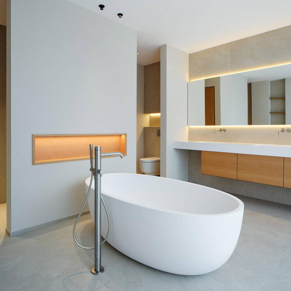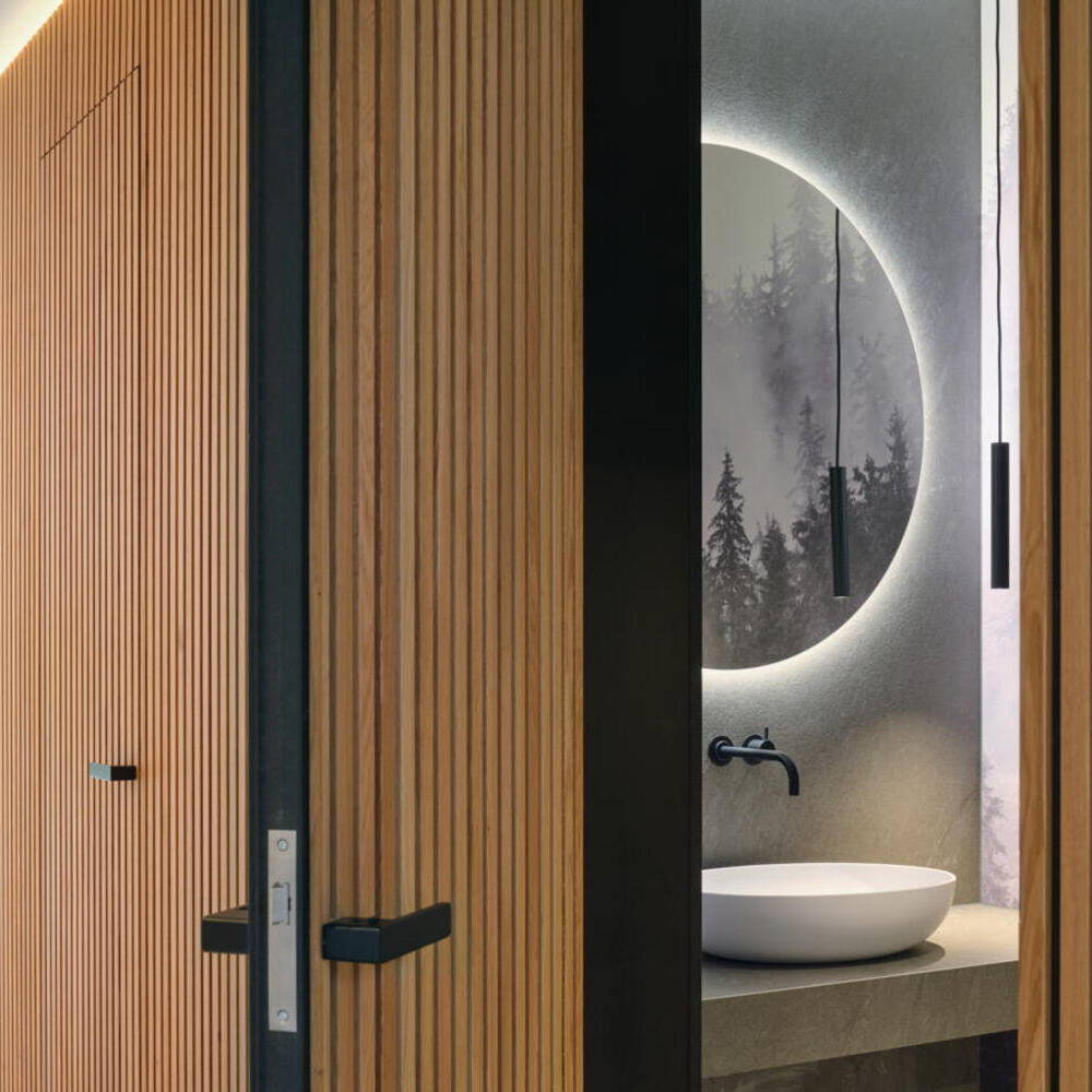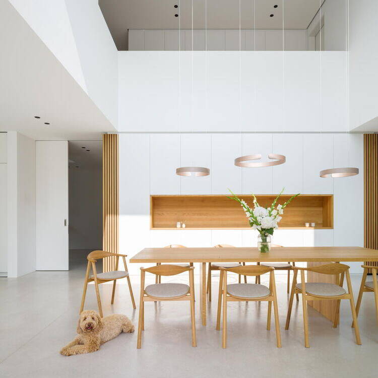 Über dem Essbereich erstreckt sich schließlich ein hoher Luftraum ins Obergeschoss, der durch höhenverstellbare Lichtringe vertikal bespielt wird. Nicht nur die Farbgebung der reduziert verwendeten Materialien strahlt dabei Ruhe und eine elegante Gemütlichkeit aus, auch der Akustikputz im Bereich der Obergeschossdecke sorgt für ein besonders angenehmes Raumgefühl. Im Erdgeschoss wird der warme Eichenholzton der Einbauten und der Wandlamellen durch den Sichtestrichboden kontrastiert und mit hellen Gestaltungselementen wie den Vorhängen ergänzt. Eine indirekte Beleuchtung mit wiederkehrenden LED-Strips und Einbaustrahlern akzentuiert Gaskamin und maßangefertigtes Einbaumobiliar. Entstanden ist ein allseitig durchdachtes Wohnhaus voller Licht und Leben.