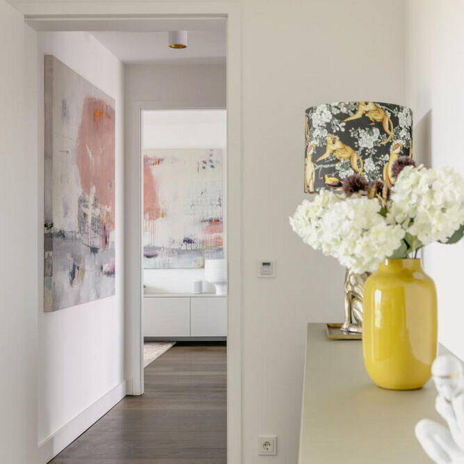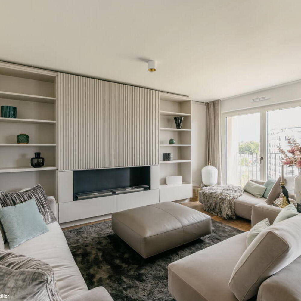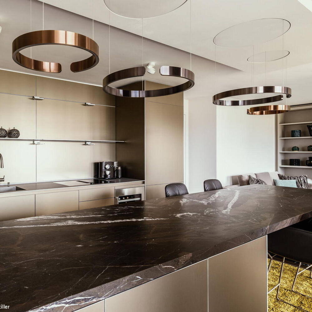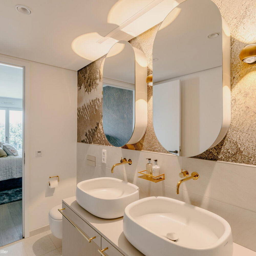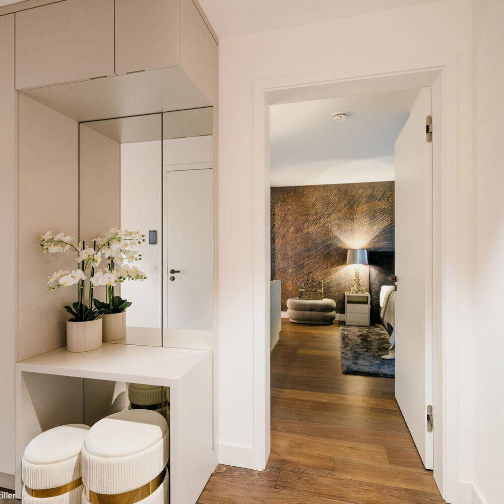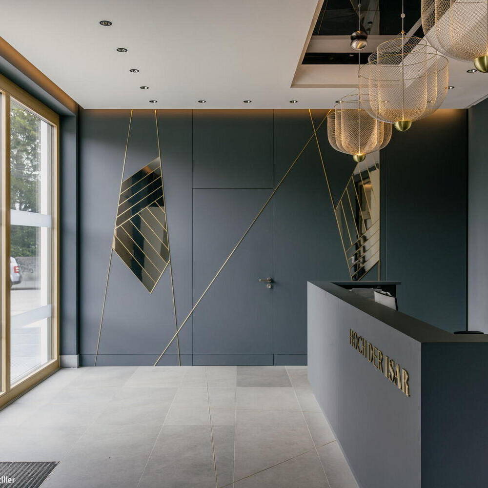 Zentraler Anlaufpunkt des Ensembles ist die repräsentative Lobby mit Concierge-Service. Sie gibt schon einen Vorgeschmack auf die drei exklusiven Stilwelten der Wohnungen. Hochwertige Leuchten, die minimalistisch-ästhetischen Briefkastenanlagen und goldene Akzente in den Wandoberflächen in den Eingangsbereichen der Häuser unterstreichen den exklusiven Anspruch des Projekts, in dem es sogar einen „Raum der Wünsche“ – eine innovative Paketboxenanlage – gibt. Die neuen Bewohner:innen konnten aus insgesamt drei Stylewelten – von „Golden Light“ über „Silver Sparkle“ bis „Essence of Grey“ – wählen, die jeweils in Materialität und Farbwelt unterschiedlich sind. Beim Entwurf „Golden Light“ wird die Liebe der Innenarchitektinnen zum Fluss und ihr besonderes Gespür für die Stadt besonders deutlich: Sie taucht die Wohnung in warme, natürliche Farbtöne – inspiriert vom Isarstrand und den goldenen Wasserreflexionen bei Sonnenaufgang. Helles Feinsteinzeug und die Dekorfliesen spiegeln die besondere Haptik und Maserung der hellen Kieselsteine des Isarstrands wider. Applikationen und Accessoires aus Messing greifen die glitzernden Reflexionen der Sonnenstrahlen auf. Eine elegante Farbpalette aus Kiesel-, Beige- und Sandtönen unterstützt das Design und lässt die Räume freundlich erstrahlen. „‚Hoch der Isar‘ hat gezeigt, dass Standardlösungen der Vergangenheit angehören. Wer sich von der Masse abheben will, setzt auf individuelle, hochwertige Konzepte, die weit über Material- und Farbauswahl hinaus gehen“, so Susanne Brückner, Innenarchitektin und CEO der Brücknerinnen.
