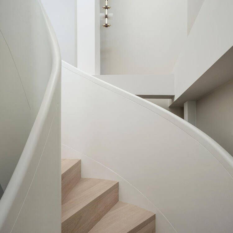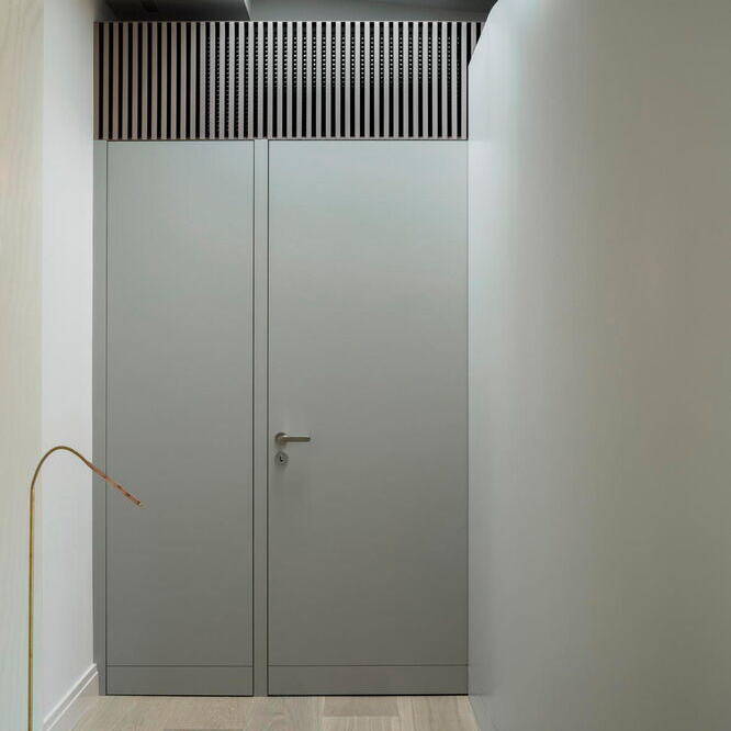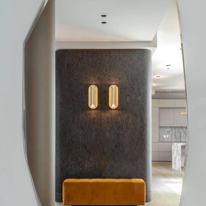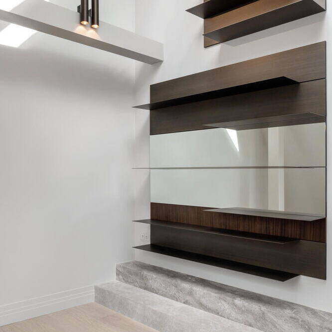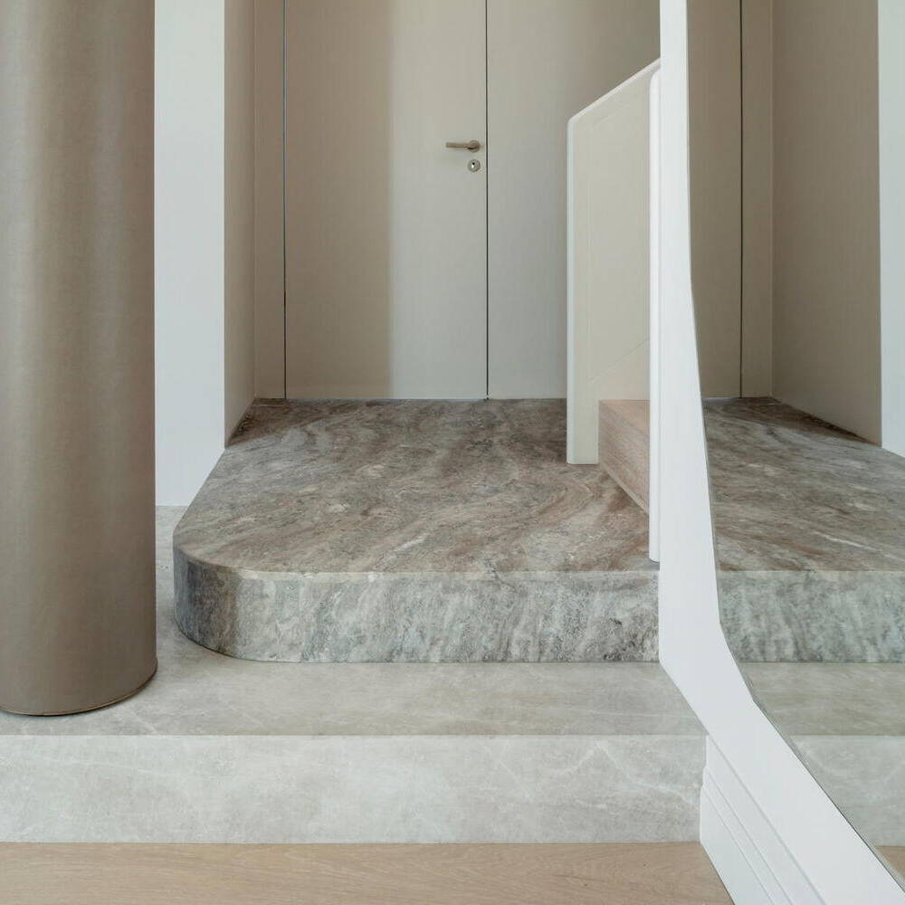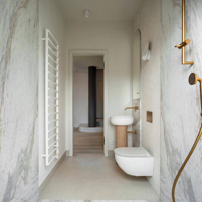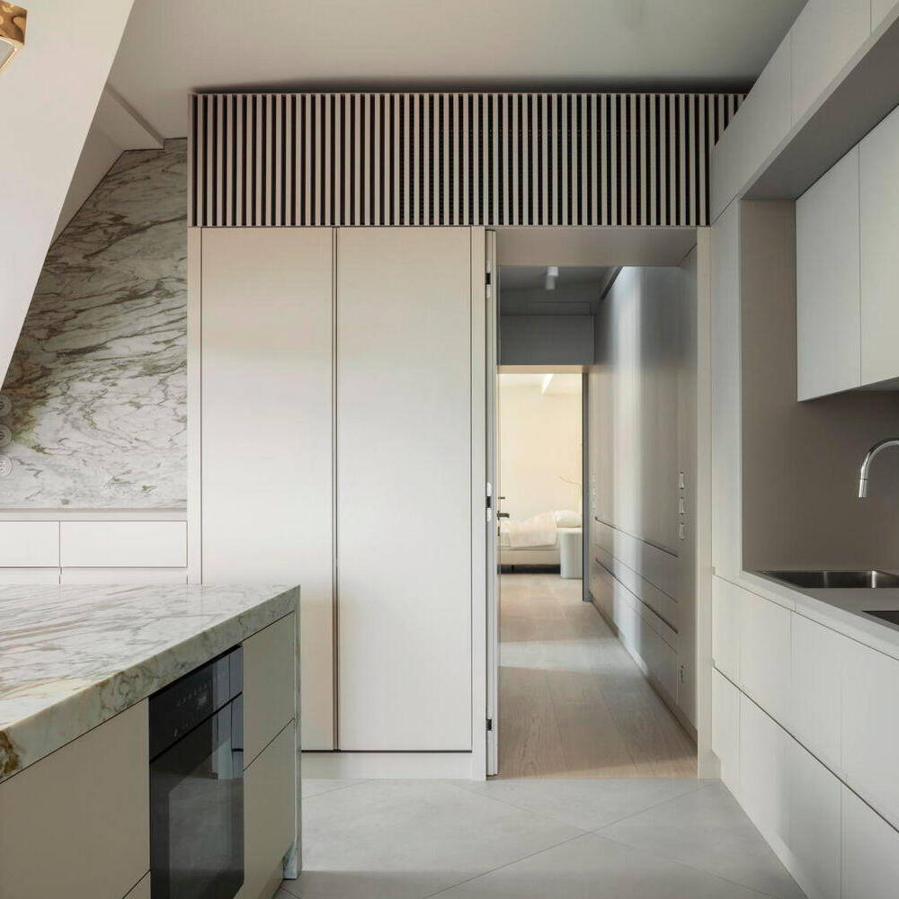 Das Komplizierte an der Aufgabe bestand darin, den Spagat zu vollziehen, alten Charme zu bewahren und hochwertige heutige Wohnansprüche zu vereinen. Dies scheint gelungen: Soeben bekam Clarissa Baldini für dieses Projekt den Design-Award 2025. Was zunächst als normaler Auftrag erschien, entpuppte sich als herausforderndes Unterfangen: In dem aufgestockten Dachgeschoss hatte ein früherer Ausbau stattgefunden, der so verschachtelt und verwinkelt war, dass es nahezu keinen rechten Winkel gab. Die einfachste Lösung wäre gewesen, alles abzureissen und wieder bei Null anzufangen. Diese Option stand jedoch nicht zur Verfügung, es musste mit dem vorgefundenen Gegebenheiten umgegangen werden. Clarissa Baldini drehte den Spieß um: „Ich bin der Überzeugung, dass es oft gerade die besonderen Merkmale, Eigenheiten im Bestand sind, die ein Projekt einzigartig machen, indem man den Fokus auf diese Aspekte legt und sie in einem neuen Licht präsentiert.“ Der Kunstgriff, den die Architektin anwendet, besteht also darin, die zunächst störenden Elemente zu verstärken: Sie fügt technische Einhausungen hinzu, statt diese zu reduzieren, ergänzt ebenfalls Architrave, um Raum für Einbaumöbel zu gewinnen. Nach diesem ersten entscheidenden Schritt kann der nächste gegangen werden: Die Innenraumgestaltung. Nach umfangreichen Malerarbeiten wird mit verschiedenen Beige-Nuancen gearbeitet, es werden gekonnt Lichtreflexe in Nischen und Zwischenräumen gesetzt. Werthaltige Materialien kommen z. B. als Wandbespannung zum Einsatz oder Möbelfurniere im Schlafzimmer, brünierte Messingverkleidungen und veganes Leder als Bezug der Säulen. Neue sanfte und skulpturale Einbauten runden das gesamte Arrangement ab. „Sophie-Charlotte“ – so der Name der edlen Mansardenwohnung – ist geboren.