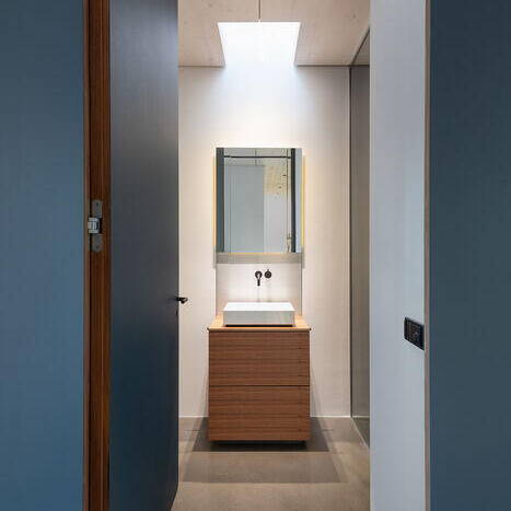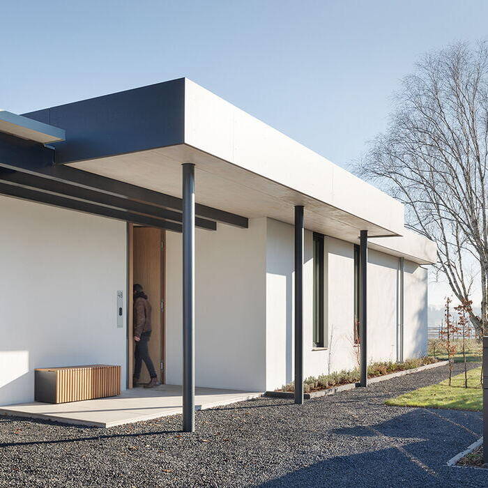 Aus der Perspektive des Dorfes gibt sich der Neubau zurückhaltend und verschlossen. Nach Süd-Osten orientiert zentrieren die großen Fensterfronten den Blick in die weitläufige Landschaft und lenken so die Aufmerksamkeit weg vom heterogenen Dorfbild. Die klare äußere Kubatur des Hauses hebt sich bescheiden von der Nachbarbebauung ab. Das vorgesehene Baufenster wurde bewusst nicht vollständig ausgenutzt: Nicht Maximierung der Flächen, sondern Bedarf und Angemessenheit standen im Fokus der Entwurfsidee. Den Mittelpunkt des Hauses bildet ein großzügiger Wohn-Koch- und Essbereich, der durch einen Dachausschnitt über der Küche den Blick nach oben öffnet und den Raum weitet. Ein halboffener Arbeitsbereich und der private Trakt mit Ankleide, Schlafzimmer und Masterbad mit freistehender Wanne schließen sich an. Sie schaffen eine harmonische Einheit mit dem Außenbereich, der von einem Sportpool begrenzt wird. Die weitspannende Dachkonstruktion, die aus einer auf gemauerten Wandscheiben ruhenden Brettstapeldecke besteht, unterstreicht den Eindruck eines nahtlosen Überganges zusätzlich. Der Grundriss ist dabei so flexibel gestaltet, dass auf sich wandelnde Anforderungen leicht reagiert werden kann: So lässt sich etwa der vordere Teil des Gebäudes durch das Ergänzen einer einzigen Wand in eine Einliegerwohnung umnutzen. Auch eine spätere barrierefreie Wohnsituation wurde mitgedacht und umgesetzt. Auf die energetische Herausforderung eines beheizten Sportpools wurde mit einer großzügigen Geothermieanlage und einer 200 m² großen PV-Anlage reagiert. Im Kombination mit einer Wärmepumpe kann damit der Wärmebedarf für das gesamte Gebäude und den Pool gedeckt werden. In den Sommermonaten kühlt die Fußbodenheizung die Räume herunter und wärmt die Geothermie wieder auf, so dass am Ende ein Kreislauf mit neutraler Energiebilanz steht.