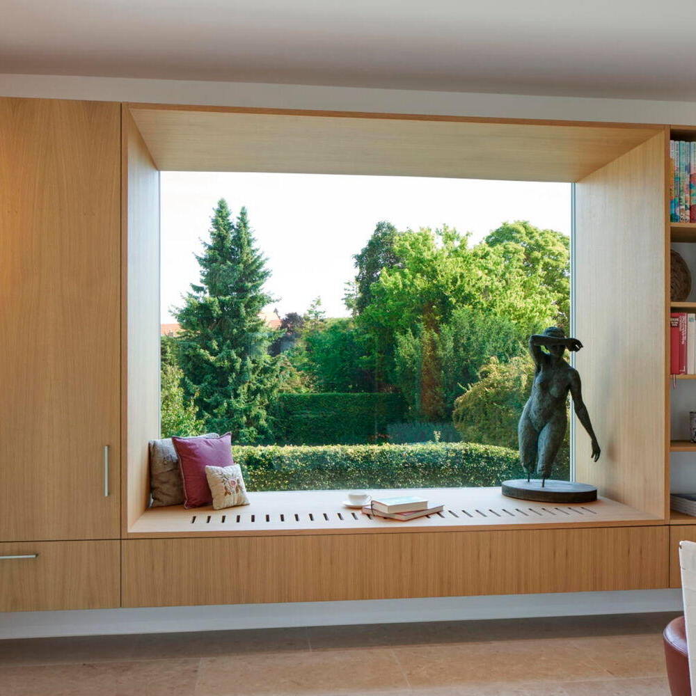 Die Fassade nimmt sich zurück, da das Haus im Kanon der Nachbargebäude nicht zu sehr auffallen soll. Die verwendeten Materialien und die Dachform orientieren sich am Umfeld: Putz und Klinker, dazu Metall für die Fenster sowie ein Satteldach mit Gauben. Der Vorgartenbereich ist Treffpunkt und Plauderecke für die Nachbarschaft. Das Bandfenster im Obergeschoss ermöglicht der Bauherrin von ihrem Arbeitsplatz aus auch bei schlechtem Wetter einen Blick auf das Geschehen auf der Straße. So ist ein unaufgeregt-einfaches, in sich gleichwohl durchaus raffiniertes Haus entstanden, das den besonderen Ansprüchen des Ehepaars auch in ästhetischer Hinsicht gerecht wird.