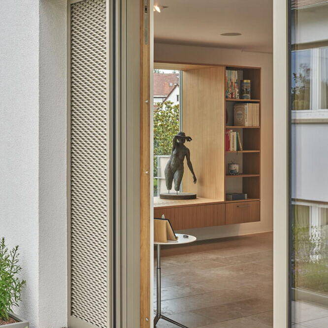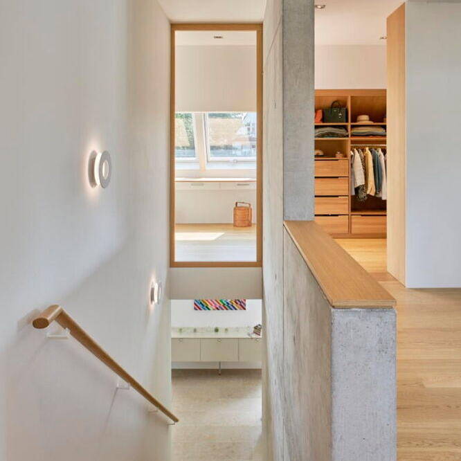 Der Aufbau des rollstuhlgerechten Wohnhauses ist einfach: Während im Erdgeschoss die Einliegerwohnung untergebracht ist, das Auto geparkt wird und die Kunst wirkt, entfalten sich auf den beiden oberen Etagen die Lebens- und Schlafräume des Ehepaars. Ein Aufzug verbindet alle Ebenen miteinander und bindet auch das Untergeschoss mit dem Kunstlager ein. Vom Erdgeschoss führt eine teils überdachte Terrasse in den ebenfalls komplett barrierefreien Garten mit breiten ebenen Wegen. In den Obergeschossen erweitern zwei großzügige Balkone auf auskragenden Erdgeschossbereichen die Wohnfläche ins Freie. Baukonstruktiv herausfordernd waren die schwellenfreien Übergänge ohne den geringsten Höhenunterschied. Die Arbeitsflächen in der Küche sind je nach Bedarf flexibel in ihrer Höhe anpassbar und die Bäder barrierefrei nutzbar. Trotz der Kleinteiligkeit des Grundrisses sorgen Durchblicke, Fluchten und Ausblicke für eine gewisse Großzügigkeit.