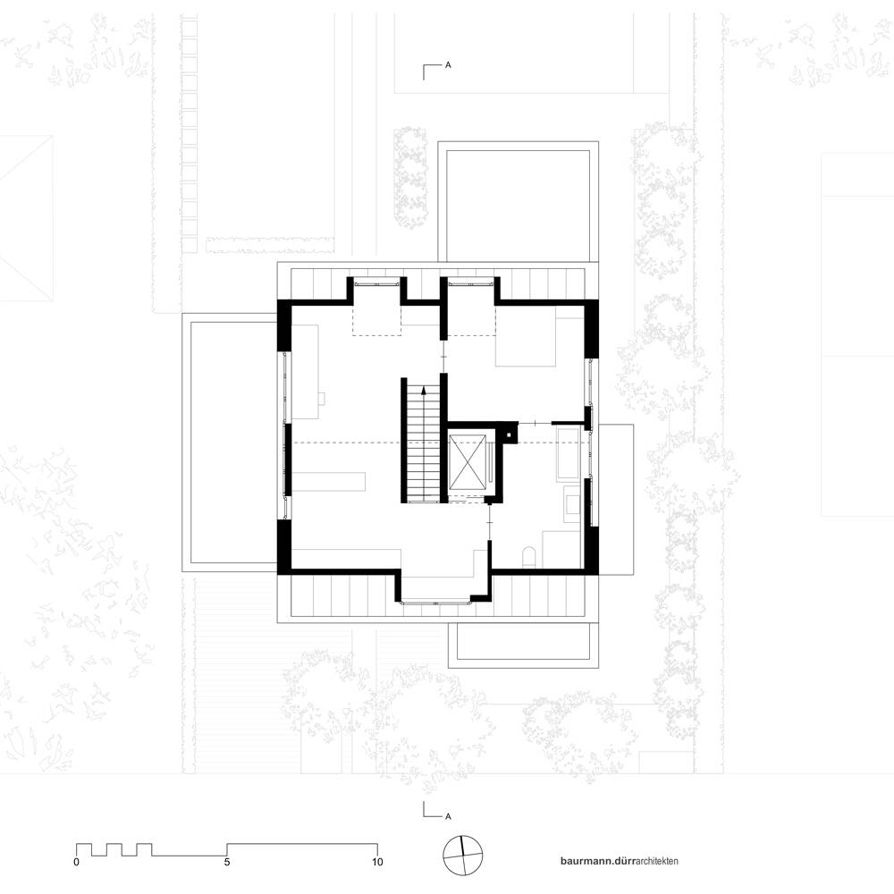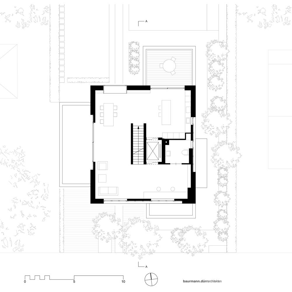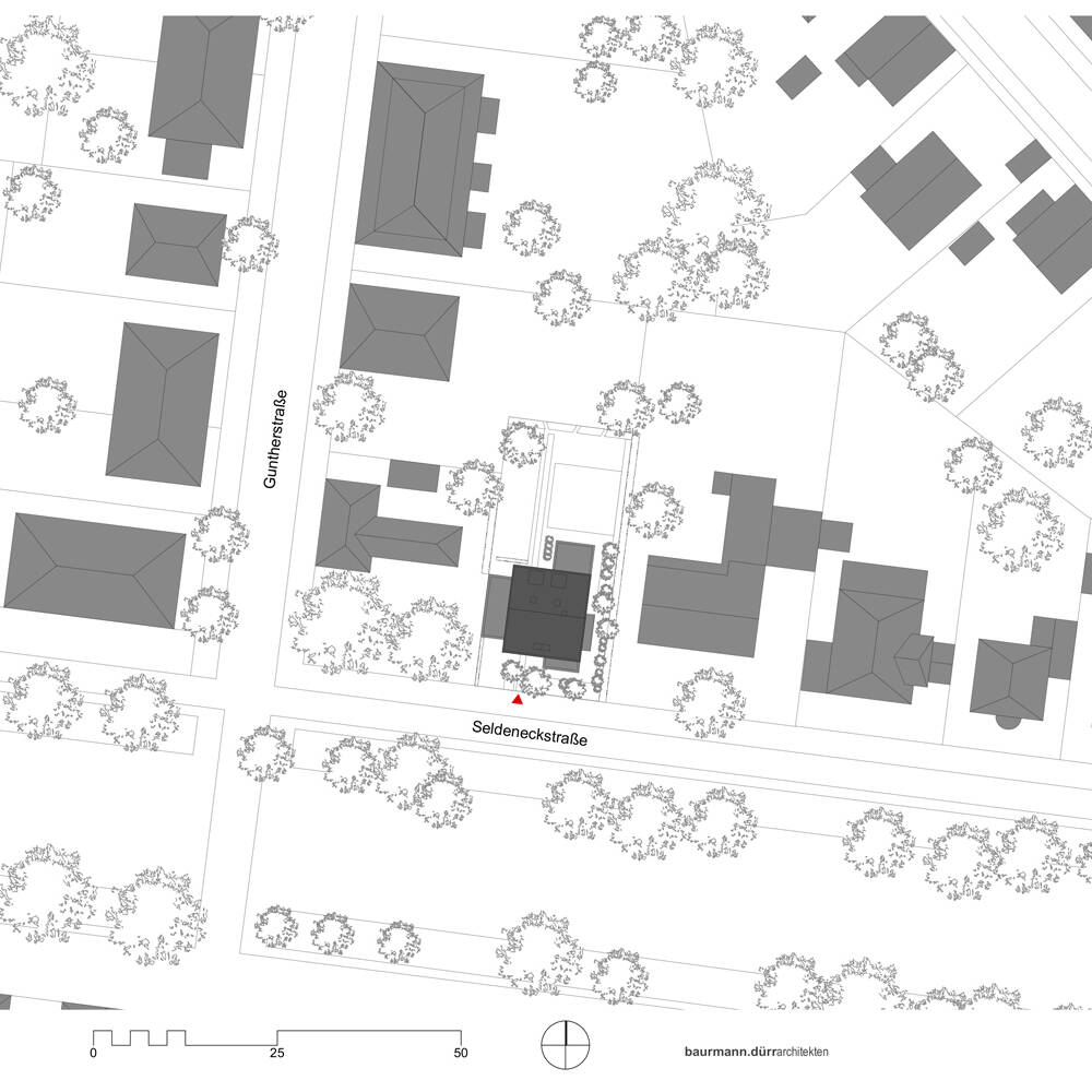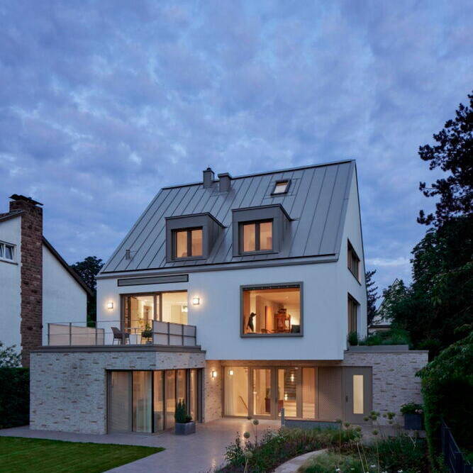In einem beliebten Wohnviertel nahe der Innenstadt wurde ein Bestandsgebäude abgerissen und das freigewordene schmale Grundstück war bereit für Neubebauung. Es befindet sich im nördlichen Bereich des Quartiers am Rande eines langen Grünzugs, der sich durch das von gründerzeitlichen Villen geprägte Quartier zieht. Für Baurmann Dürr Architekten galt es, ein überzeugendes Gebäudekonzept sowohl auf der Grundlage der strengen Bauauflagen als auch der hohen Anforderungen der Bauherrschaft zu entwickeln. Zum einen wünschte sich das Ehepaar größtmögliche Offenheit zur Straße, um ein „Willkommen“ zu vermitteln. Zum privaten Garten hingegen sollte das Haus nicht einsehbar und geschützt angelegt werden. Im Erdgeschoss galt es eine Einliegerwohnung für die Schwiegermutter zu integrieren und das gesamte Haus sollte Raum für eine exquisite Sammlung zeitgenössischer Kunst bieten. Dazu kamen vielfältige technische Anforderungen, bedingt durch die Tatsache, dass die Hausherrin auf einen Rollstuhl angewiesen ist und das Haus ihr die Möglichkeit bieten sollte, ihren Alltag möglichst unbeschwert zu gestalten.