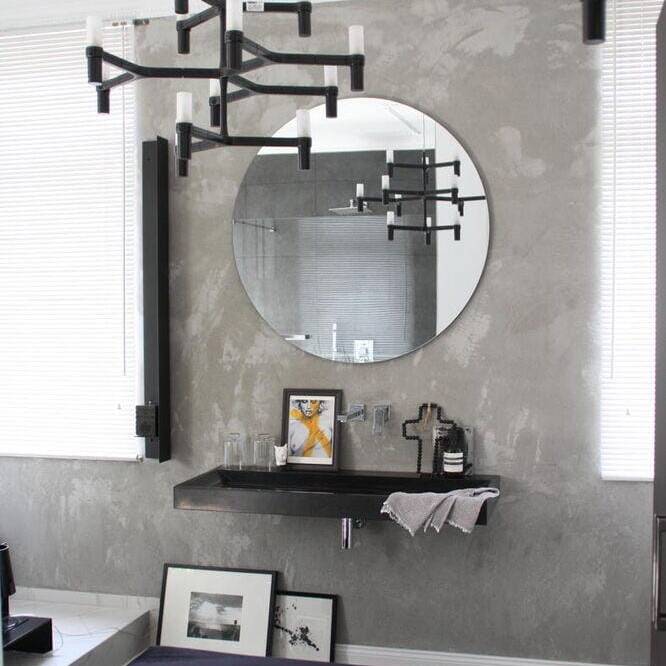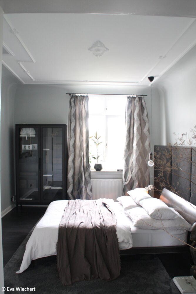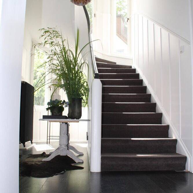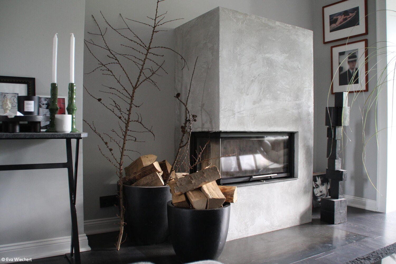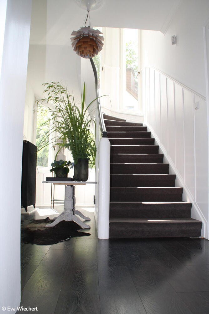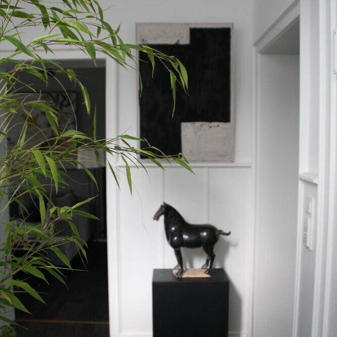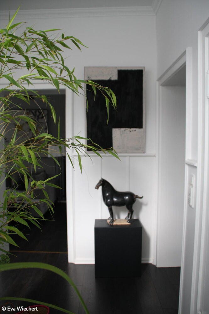 2017 erwarb sie die Doppelhaushälfte mit 220 m² Wohnfläche, ließ die Tannen fällen und begann mit tatkräftiger Unterstützung und eigener Hand, das Haus unter Wahrung der zeitlosen Eleganz seiner Architektur von Grund auf zu sanieren und technisch auf einen zeitgemäßen Standard zu bringen. Das undichte Dach wurde instandgesetzt, der Dachboden ausgebaut, Fenster nach historischem Vorbild neu angefertigt. Die in der Küche noch verortete Badewanne entfernte man und die dortigen Fliesen, die der neuen Fußbodenheizung weichen mussten, fanden im Weinkeller eine neue Verwendung. Die Arbeiten muteten zuweilen wie eine Schatzsuche an, die sich über Monate und Jahre hinzog: Immer wieder traten überraschende Details zutage, die unter Schichten wenig überzeugender „Schönheitsmaßnahmen“ ehemaliger Voreigentümer verborgen waren. Stuckelemente mit Ornamenten an den hohen Decken, geschwungene Türzargen und ein Glaselement mit Sprossenfenstern über der Tür zum Badezimmer kamen wieder zum Vorschein, wurden aufgearbeitet und teilweise ergänzt. Auch die alten Heizkörper auf Füßchen fügen sich als stimmige Details ein. „Ich bin sicher, dass dieses Haus mich gefunden hat und nicht umgekehrt“, erzählt Eva Wiechert. Profitieren konnten sicherlich beide Seiten: Das Haus gewann viel von seinem einstigen Charme zurück und Eva Wiechert konnte ihre gestalterische Handschrift subtil in jeden Raum einfließen lassen. Acht Räume, das Dachgeschoss und einen Keller mit Sauna galt es zu gestalten. Wobei schon der Eingangsbereich Freude macht: Die originale Haustür wurde mit größtmöglichem Respekt vor dem historischen Vorbild auf den neuesten Sicherheitsstandard gebracht, ein Windfang mit Pendeltür und Bleischeiben führt in einen lichtdurchfluteten Flur mit breiter, geschwungener Eichentreppe. Die Holzvertäfelungen erstrahlen in Weiß, eine Wand im Bad wurde in markanter Betonoptik gestaltet, jeder Raum erhielt eine andere Farbwelt. In der Küche sorgt eine Kochinsel aus Granit für Aufmerksamkeit, während im Wohnzimmer ein Kamin aus gegossenem Beton eingebaut wurde. Überall begegnet man Kunstwerken der Interiordesignerin – selbstgemalten Bildern und handgefertigten Skulpturen, die den Räumen eine unverwechselbare Note verleihen. Und ein Blick in den schönen Garten offenbart, dass die Liebe zum Detail nicht nur drinnen, sondern auch draußen gelebt wird.