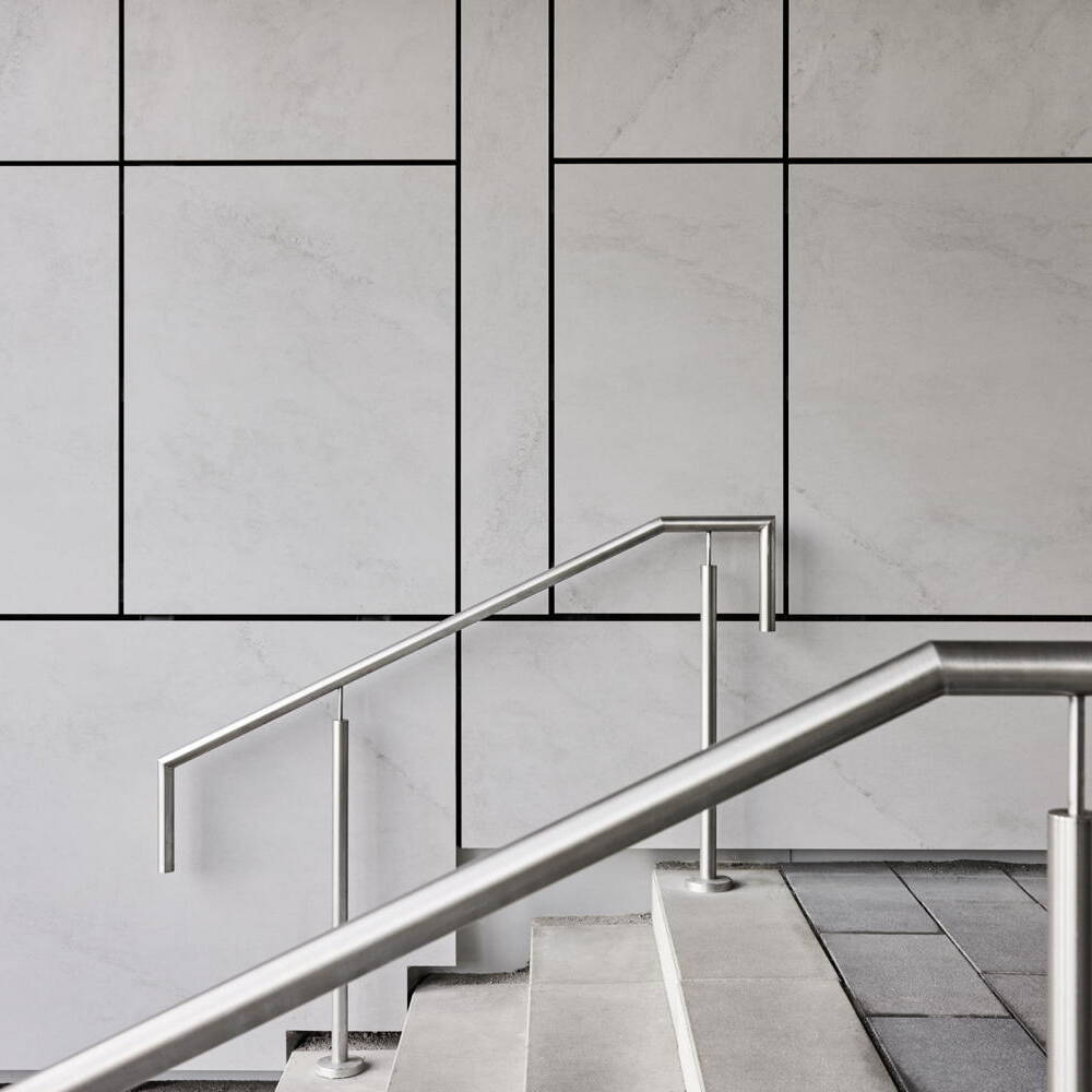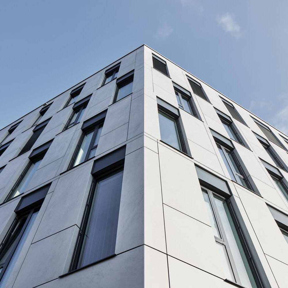 Befestigt sind die Dekton-Platten von außen unsichtbar mit Keil Hinterschnittankern. Die Fenstermodule variieren in der Breite und schaffen so ein abwechslungsreiches Gleichgewicht zwischen Dynamik und Ruhe. Trotz der Lage an einer vielbefahrenen Straße sorgt die pflegeleichte Fassade für weithin sichtbare Strahlkraft.