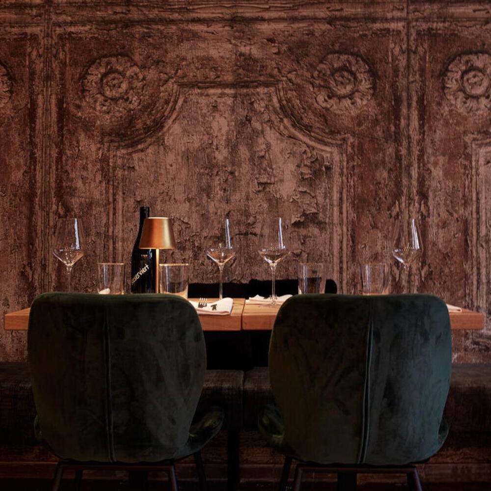 Um den kleinen, aber außergewöhnlich hohen Gastraum mit seinen drei Metern Höhe in Szene zu setzen (früher war hier mal eine Metzgerei untergebracht), wählte er Tapeten aus Italien – die dem Raum mit ihrem Vintagecharakter und den großen, symmetrischen Ornamenten mit floralen und barocken Einflüssen eine fast kirchen- oder schlossartige Atmosphäre verleihen. Und – eine handwerkliche Meisterleistung – auch sehr präzise auf der Front der Bar sowie dem wie schwebend wirkenden Flaschenregalbrett dahinter aufgebracht wurden. Die Tapete bietet einen Patina-Effekt, der ihr Tiefe und Charakter verleiht und fast dreidimensional wirkt. Moderne minimalistische Hängeleuchten aus einer belgischen Manufaktur in Schwarz-Gold über der Bar und dem Gastraum tauchen den Raum in weiches, umhüllendes Licht und erzeugen eine warme und einladende Atmosphäre. Einfache, massive Eichenholztische sowie bequeme, samtbezogene Stühle und Barhocker in gedecktem Rot und einem frischen Blaugrün ergänzen das erdig-puristische Konzept.