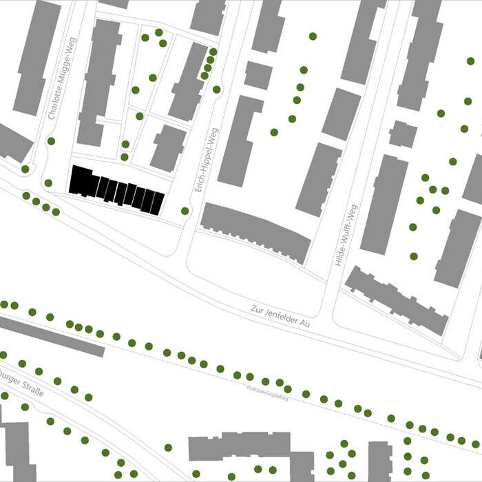 Eine zentrale Grünachse, der Kaskadenpark, sowie ein neu angelegter Teich bilden das Rückgrat des Viertels. Wasser unterschiedlicher Art spielt ein zentrale Rolle in der Jenfelder Au. Zum ersten Mal wurde hier der „Hamburg Water Cycle®“, ein neuartiges Schmutzwasserkonzept von Hamburg Wasser, im großen Maßstab realisiert. Schwarzwasser, Grauwasser sowie Regenwasser werden getrennt gesammelt und genutzt. Alle Haushalte werden mit Vakuumtoiletten ausgestattet, sodass das Schwarzwasser (aus Toiletten) einer Biogasanlage zugeführt werden kann, die als quartierseigenes Heizkraftwerk klimaneutral Wärme und Strom für das Viertel erzeugt. Das Grauwasser (z. B. aus Dusche oder Waschmaschine) wird gereinigt und in lokale Gewässer abgeleitet. Das Regenwasser fließt nicht in die Kanalisation, sondern versickert oder verdunstet im Quartier. Das Entwurfsbüro des Gebäudes hat sich Anfang 2024 umbenannt, aus wwa Architekten wurde nun Planebene A Architektur. Der Baukörper umfasst sieben Stadthäuser sowie vier Wohnungen, straßenseitig zeigt er eine differenzierte Gestalt durch Balkone, Loggien und Dachterrassen sowie Vor- und Rücksprünge in der Fassade. Diese Lebendigkeit setzt sich auch beim Mehrfamilienhaus fort, die Straßenflucht wirkt so insgesamt harmonisch und doch abwechslungsreich. Die Mischung der verwendeten Ziegelriemchen wechselt von Haus zu Haus in drei Varianten. Auch dies macht jedes Haus einzeln ablesbar und stärkt die Verbundenheit mit dem „eigenen“ Haus.