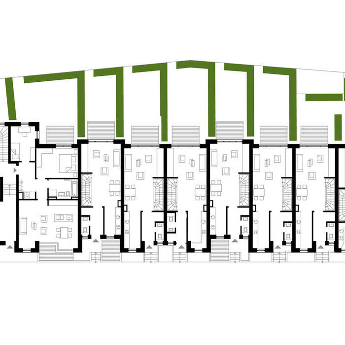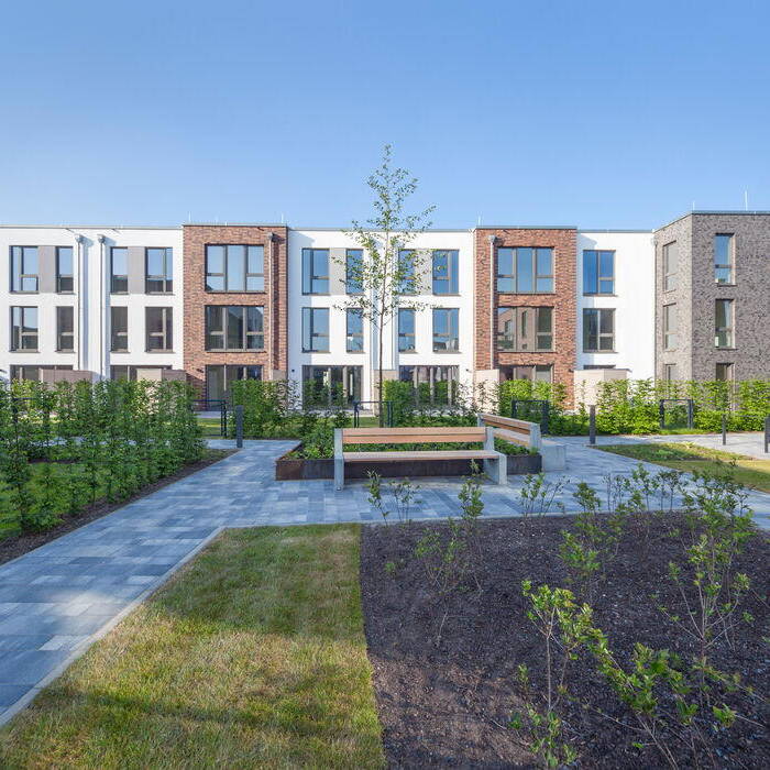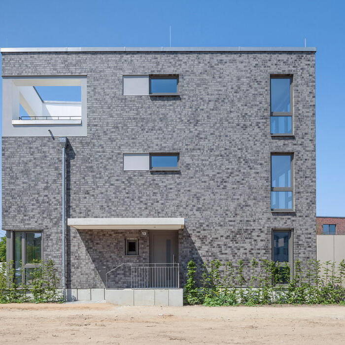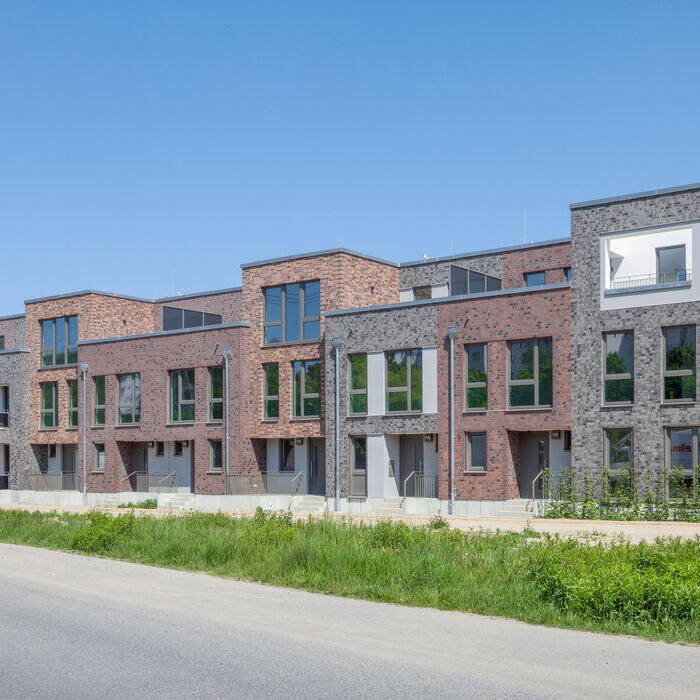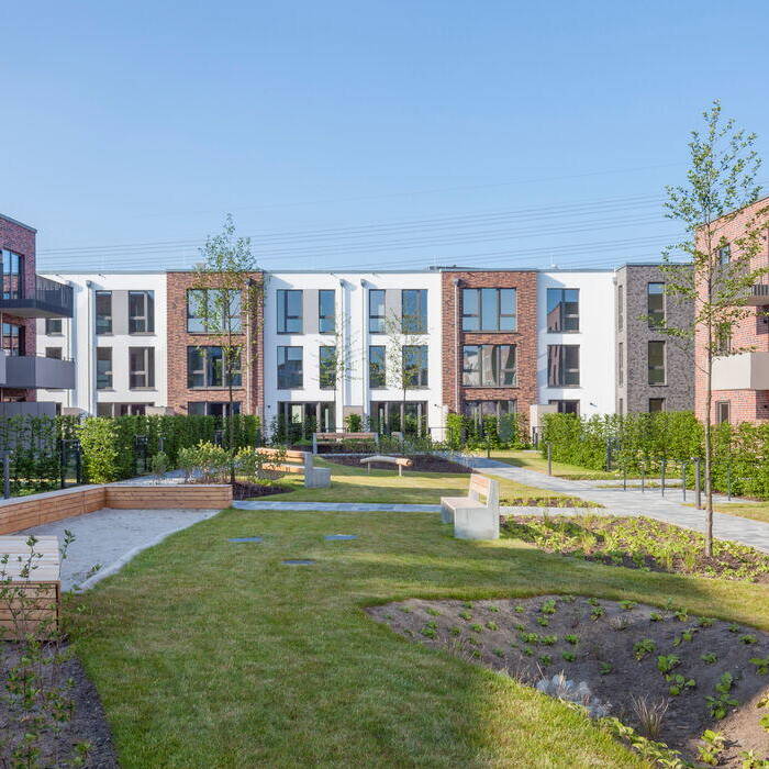 Auf der Gartenseite gestaltet sich das Gebäude zurückhaltender mit einer weißen Putzfassade – wie in den traditionellen Wohnquartieren in Hamburg üblich – aufgelockert durch mit Riemchen belegte Gebäudeteile. Dunklere Putzflächen und leicht zurückversetzte Klinkerflächen heben die Eingangsbereiche sowie den gemeinsamen Sockel des Gebäudes hervor und runden das Fassadenbild insgesamt auf allen Seiten ab. Die Fensterprofile und Metallbauteile der Fassaden erhielten einen grauen Farbton, der mit den verschiedenen Farben der Verblendsteine harmoniert. Die Grundrisse der Stadthäuser sind familiengerecht, trotz des schmalen Charakters öffnet sich der Raum großzügig zum Garten, kompakte Nischen für zentrale Funktionen wie Küche und Bad ordnen sich geschickt um den Eingangsbereich.