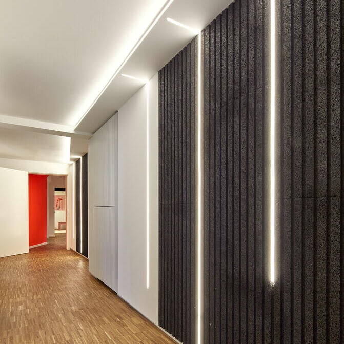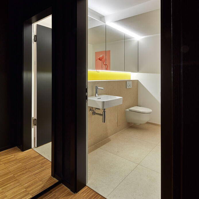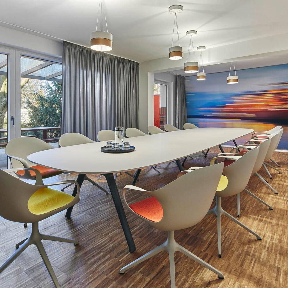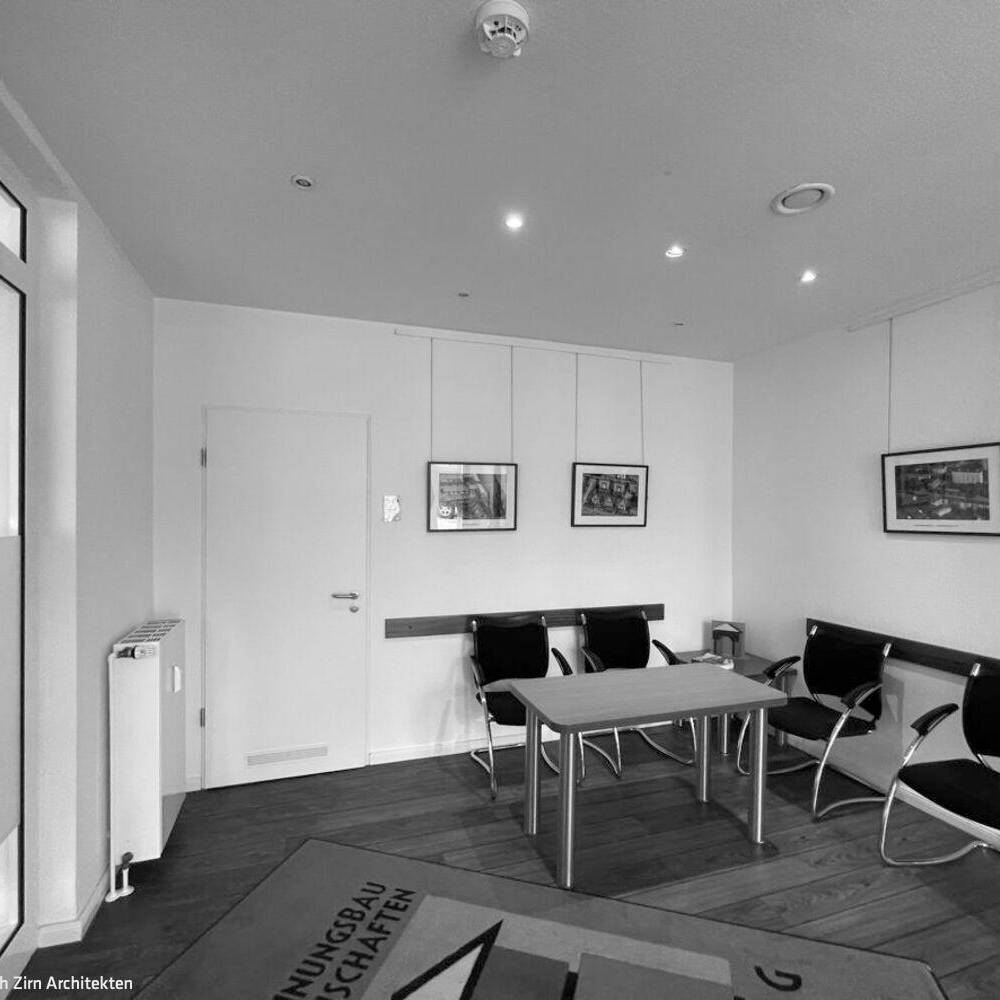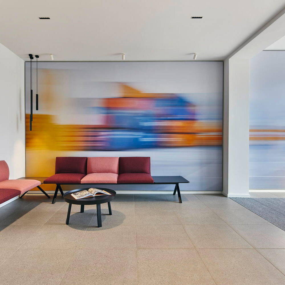 Der Eingriff belegt, dass mit dem Einsatz von Farbe, einer guten Beleuchtung und viel Holz auch aus einer „verbauten“ Situation ein Wohlfühlort entstehen kann. Großformatige, ortstypische Motive der Fotografin Stephanie Brinkkötter in Wischtechnik prägen die Räume der Wilhelmsburger Baugenossenschaft und vermitteln Mitgliedern und Mitarbeitenden Identität. Hinter den wandfüllenden, eigens für das Projekt in unmittelbarer Nachbarschaft entstandenen Fotografien befinden sich Schallabsorber-Wände, die für Wohlbefinden und Lokalkolorit, insbesondere im Eingangsbereich und den Besprechungsräumen, sorgen. Container, Schiffe und die Rethespeicher bestimmen das Ortsbild von Wilhelmsburg. Hier leben und arbeiten die Wohngenossen, das ist ihr Kiez. Vieles musste schwarz „weggestrichen“ werden oder wurde mit Wandfarben von Icons farblich akzentuiert. Anderes wurde geordnet und wegsortiert, Spiegel stellen neue Bezüge her. Bis zum Geschirr, den Kalendern, der Kunst und den Motiven der Bilder an den Wänden war das Team von RHWZ bei der Gestaltung intensiv eingebunden. Dadurch konnten auch die Persönlichkeiten der Menschen, die in den Räumen arbeiten, individuell berücksichtigt werden. Durch die vertrauensvolle und gute Zusammenarbeit mit der Bauherrschaft und den ausführenden Firmen gelang es eine kurze Bauzeit bei hoher Qualität der Ausführung zu erreichen. Es wurde ein Raumerlebnis geschaffen, das den Verwaltungsbau wieder zu einem beliebten Treffpunkt von Mitarbeitenden und Mieter:innen macht.