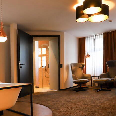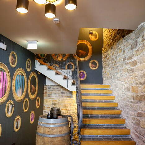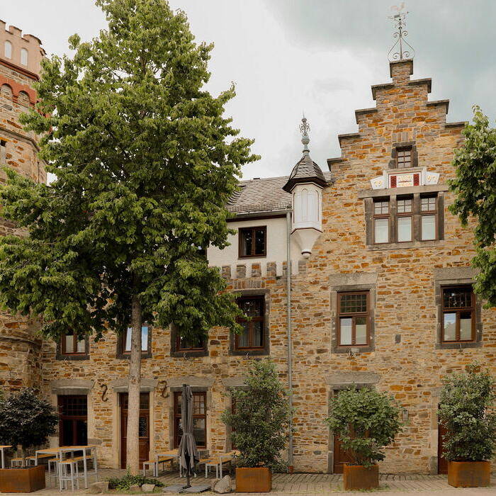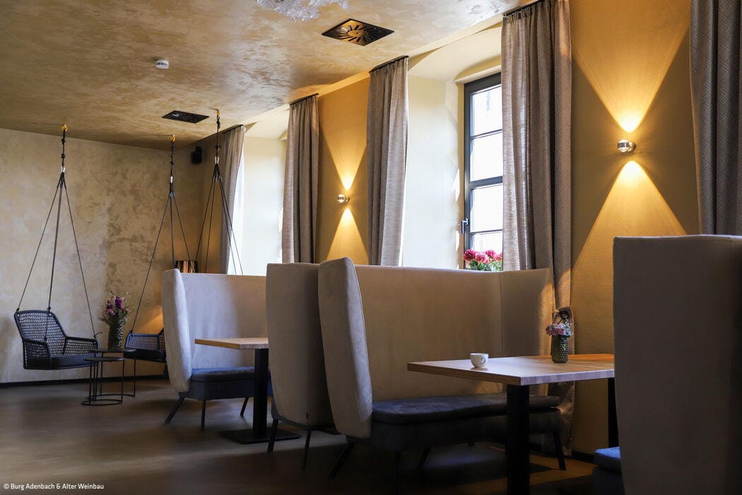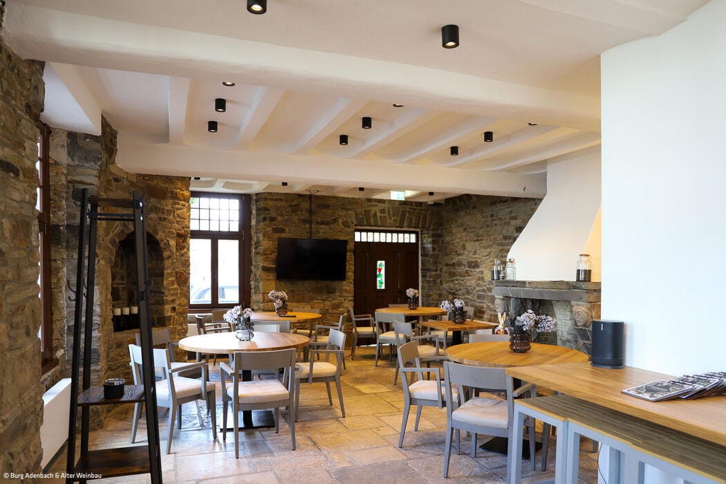 Vor allem in der Burg Adenau kann man den wild-romantischen Charme der Vergangenheit noch spüren. Der markante Turm, der ursprünglich das Treppenhaus beheimatete, wurde bei dem Umbau Teil der beiden 29 und 42 m² großen Turmsuiten. Heute befinden sich die stilvoll ausgestatteten Badezimmer in den runden Räumen und erlauben einen exponierten Ausblick über die Altstadtgiebel von Ahrweiler. Das Lennestädter Innenarchitekturbüro Hotelident hat bei der Ausstattung auf großformatige Fotografien, Teppiche und Tapeten gesetzt, die sich den lokalen Themen Burg und Wein assoziativ und mit einem Augenzwinkern nähern. Zum Verweilen lädt im „Alten Weinhof“ zudem eine lichtdurchflutete, großzügige Lounge ein, in der auch täglich das Frühstück serviert wird. Das Burghaus des Hotels verfügt seinerseits über ein Kaminzimmer und einen Gewölbekeller, die für private Feiern, Firmenveranstaltungen oder auch als Tagungsraum zur Verfügung stehen. Exklusiv kann auch eine Weinbar mit Außenterrasse angemietet werden – samt einem ausgesuchten Sortiment an regionalen Weinen aus dem traditionsreichen Weinbaugebiet an der Ahr.