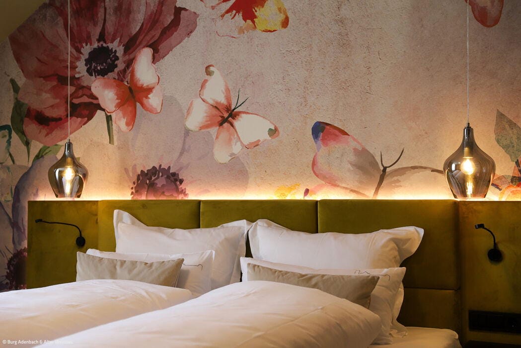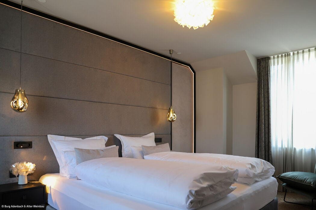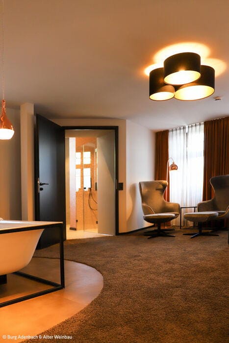 Vor allem in der Burg Adenau kann man den wild-romantischen Charme der Vergangenheit noch spüren. Der markante Turm, der ursprünglich das Treppenhaus beheimatete, wurde bei dem Umbau Teil der beiden 29 und 42 m² großen Turmsuiten. Heute befinden sich die stilvoll ausgestatteten Badezimmer in den runden Räumen und erlauben einen exponierten Ausblick über die Altstadtgiebel von Ahrweiler. Das Lennestädter Innenarchitekturbüro Hotelident hat bei der Ausstattung auf großformatige Fotografien, Teppiche und Tapeten gesetzt, die sich den lokalen Themen Burg und Wein assoziativ und mit einem Augenzwinkern nähern. Zum Verweilen lädt im „Alten Weinhof“ zudem eine lichtdurchflutete, großzügige Lounge ein, in der auch täglich das Frühstück serviert wird. Das Burghaus des Hotels verfügt seinerseits über ein Kaminzimmer und einen Gewölbekeller, die für private Feiern, Firmenveranstaltungen oder auch als Tagungsraum zur Verfügung stehen. Exklusiv kann auch eine Weinbar mit Außenterrasse angemietet werden – samt einem ausgesuchten Sortiment an regionalen Weinen aus dem traditionsreichen Weinbaugebiet an der Ahr.