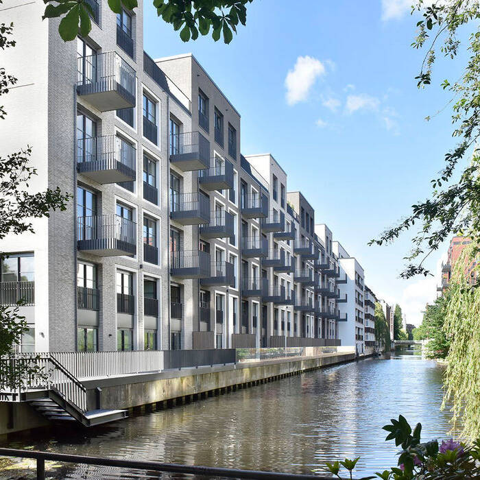 Die Uhlenhorst mit ihren attraktiven Wasserlagen gehört zu den begehrtesten Wohnadressen in Hamburg. Hier am Uhlenhorster Kanal, der über den Feenteich direkt mit der Außenalster verbunden ist, entstanden die von APB Architekten für GFG Bauherren entworfenen Waterlofts. In den zwei parallel zueinanderstehenden, vier- und fünfgeschossigen Gebäuden wurden 101 hochwertige Wohneinheiten realisiert.