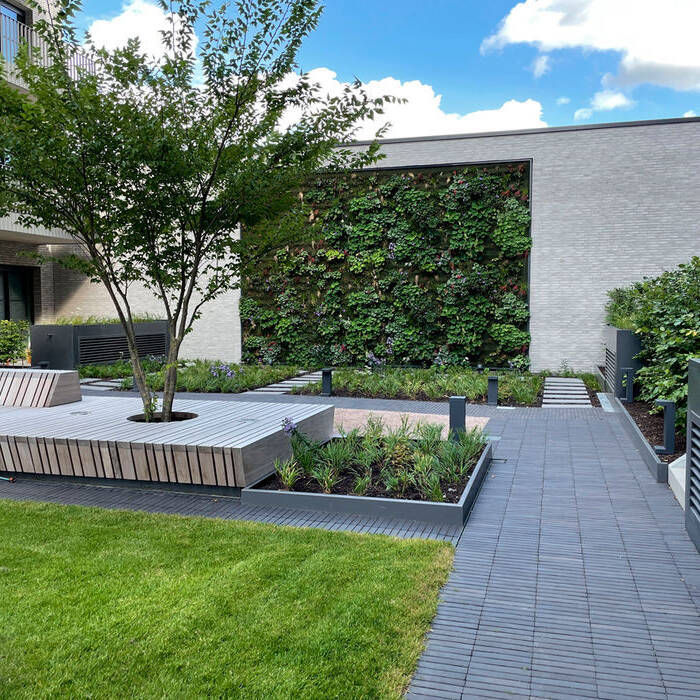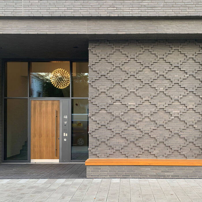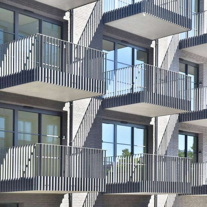 Die Volumen der Baukörper der beiden 80 Meter langen Riegel sind durch den Wechsel von hellen und dunklen Verblendfassaden gut gegliedert und wurden leicht ablesbar in jeweils fünf Häuser unterteilt. Großformatige, übereinander angeordnete Fassadenöffnungen in Form von bodentiefen Sprossenfenstern und zurückliegenden Loggien wechseln sich ab und sorgen so für ein ruhiges Erscheinungsbild. Darüber hinaus wird die Fassade veredelt durch die Faschen, die zusätzliche Einfassung der Öffnungen mit einem aufgesetzten bzw. zurückspringenden Rahmen. Entlang der Kanalstraße fasst ein durchlaufender Verblendsockel im höheren Erdgeschoss, das auch die vier Gewerbeinheiten aufnimmt, die einzelnen Gebäudeteile zusammen. Feine Ziegelornamentflächen markieren die großzügig verglasten Eingangsbereiche des Vorderhauses. Das Staffelgeschoss springt teilweise zurück und bildet so Zinnen aus, die den stadtteiltypischen Stadthauscharakter betonen. Die beiden Baukörper flankieren einen begrünten und hochwertig ausgestatteten Innenhof – eine ruhige, erholsame und exklusive Oase für alle Bewohner:innen. Klare Linien und hochwertige Materialien zeichnen die Waterlofts mit ihrer zurückhaltenden, aber gediegenen und edlen Architektursprache aus.