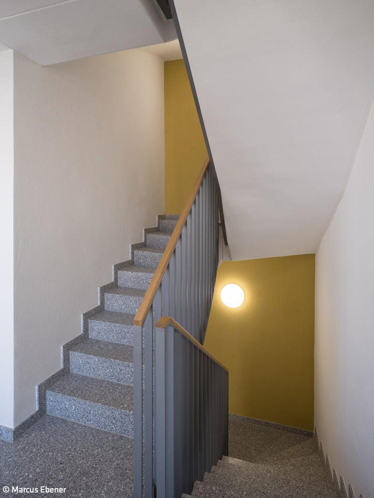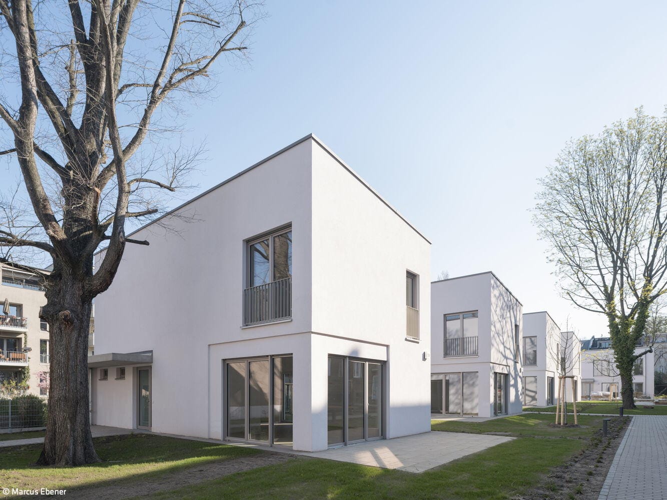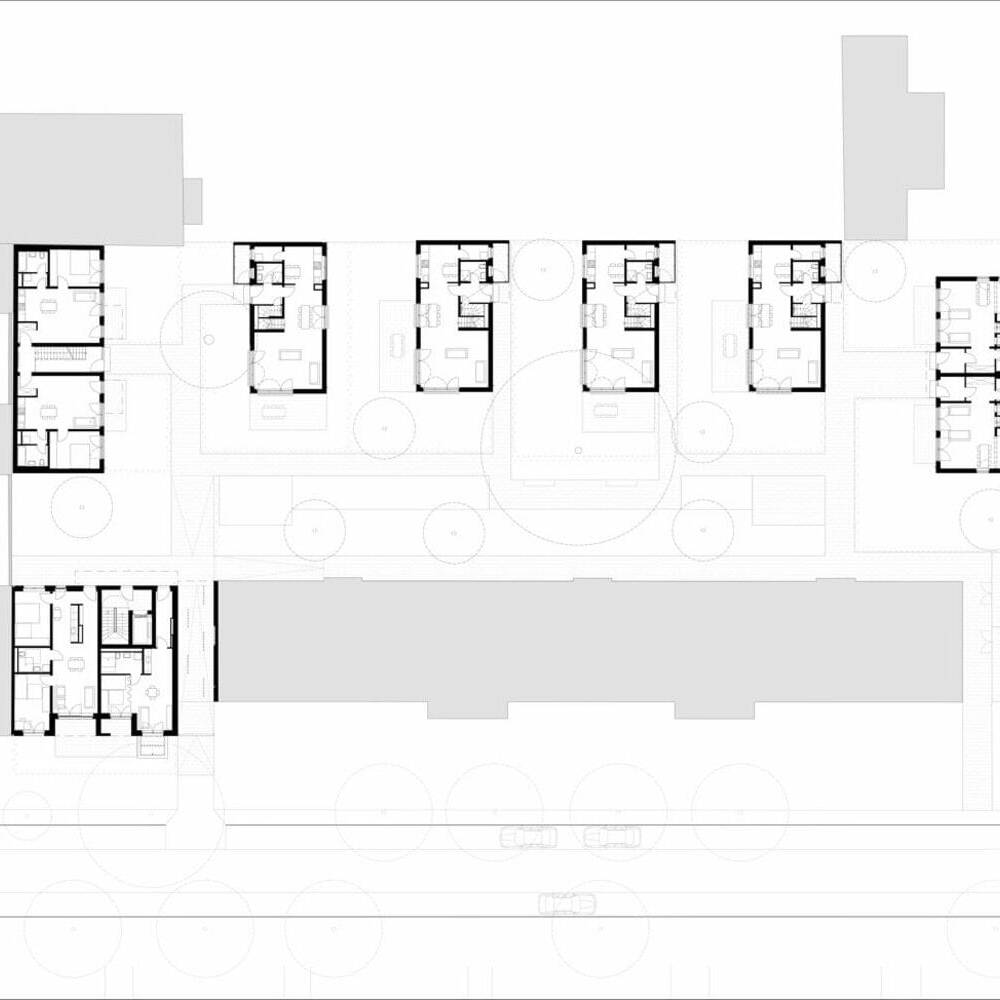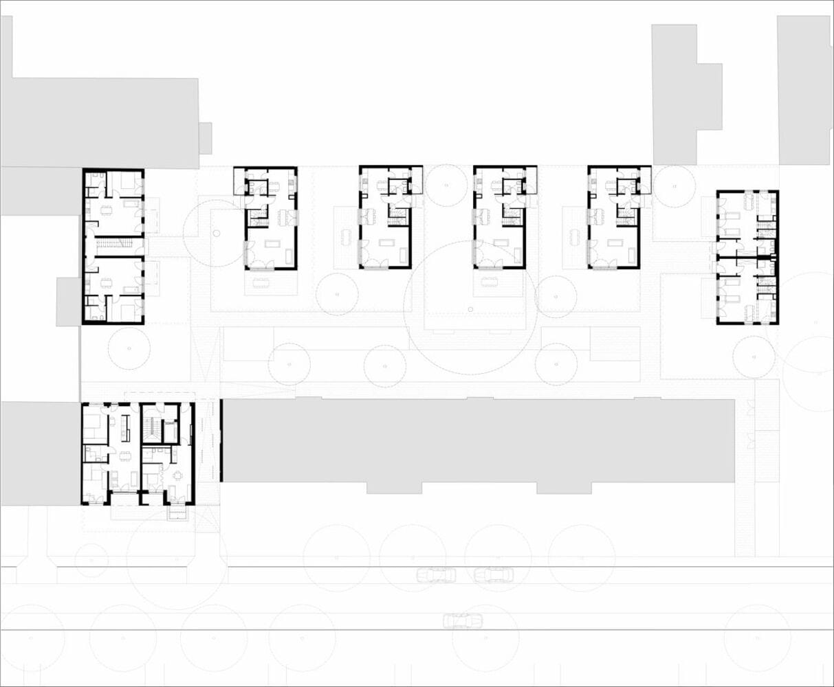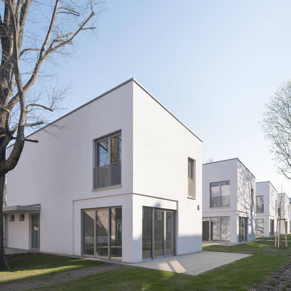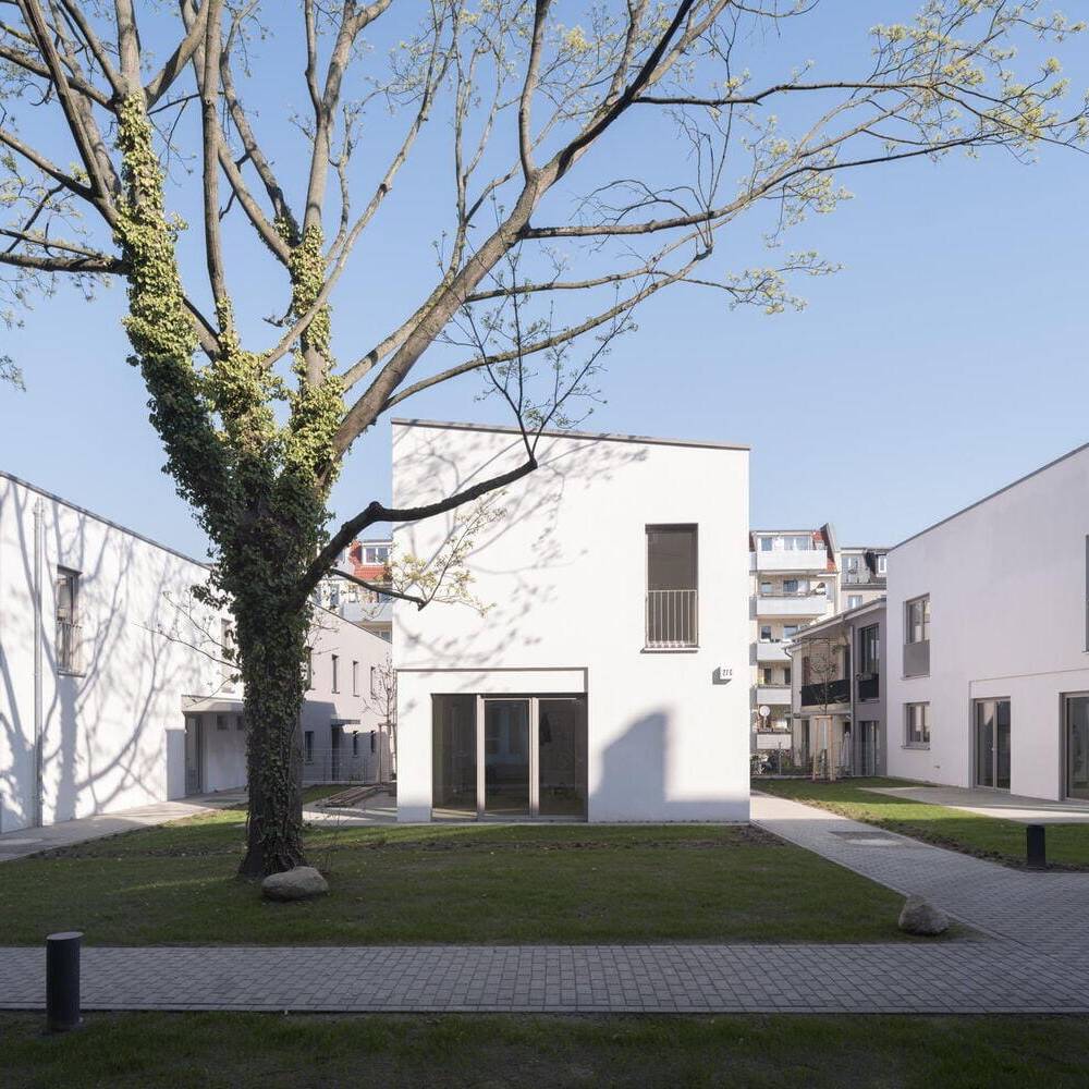 Das Besondere an diesem Projekt ist die kleinteilige Bauweise: Die Architekten haben das Wohnungsprogramm auf mehrere kleine, zweigeschossige Gebäude verteilt. Vier dieser Häuser stehen in einer Reihe, ähnlich wie Zinnsoldaten, und sind durch viel Grün und offene Flächen voneinander getrennt. Ergänzt werden die Häuser durch zwei Doppelhäuser, die als Remisen am westlichen und östlichen Rand des Grundstücks fungieren. Das sogenannte „Torhaus“ mit Durchgang zum halböffentlichen Hinterhof ist mit vier Geschossen gestaltet und passt sich in der Traufhöhe an die traditionelle Umgebung an. Die weiß verputzten Baukörper heben sich positiv von den meisten Nachbarhäusern ab, die oft grau und wenig differenziert wirken. Die Kleinteiligkeit der Neubauten vermittelt ein Gefühl von Großzügigkeit, das sonst eher auf dem Land zu finden ist, wo es üppigen Platz gibt. Insgesamt bieten die sieben Gebäude 20 Ein-, Zwei- und Dreizimmerwohnungen. Zehn dieser Wohnungen sind gefördert und nur mit einem Berechtigungsschein WBS zugänglich. Großzügige Fensterfronten sorgen für helle, freundliche Räume, die durch die Abstandsflächen zwischen den Gebäuden zusätzlich profitieren. Die Häuser sind unterkellert, verfügen jedoch nicht über eine Tiefgarage, sondern über Kellerabteile für die Bewohner:innen sowie Abstellflächen für Fahrräder und Rollstühle. Im Gartenbereich laden Sitzgelegenheiten und Spielmöglichkeiten für Kinder zum Verweilen ein.
