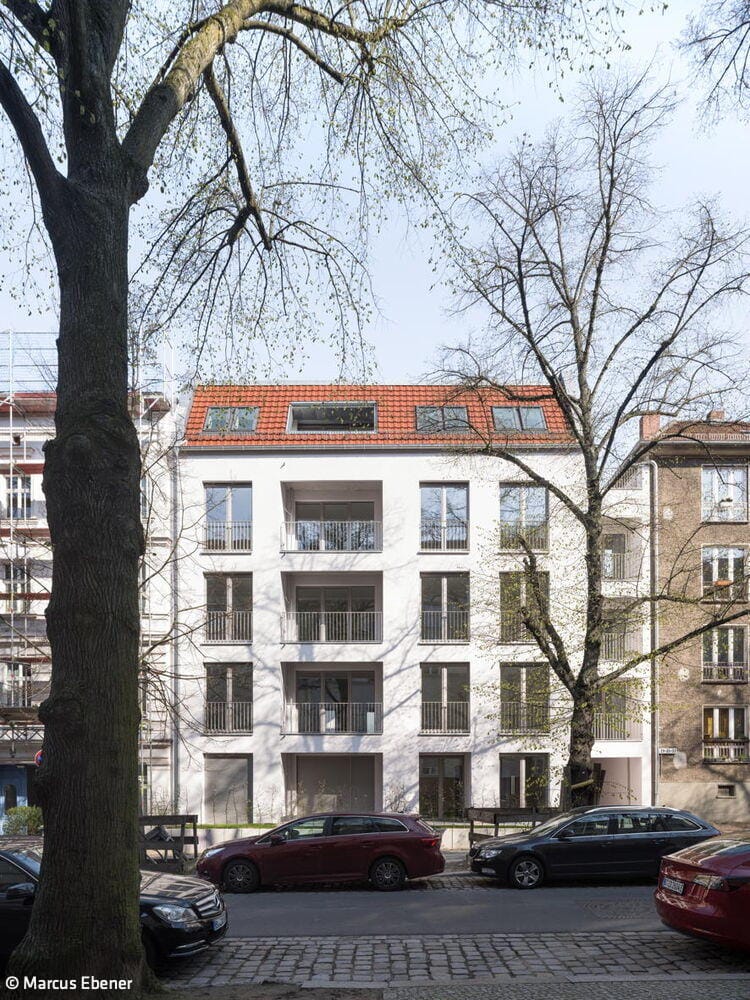 Viele Komponisten von Weltruhm – Mahler, Bizet und Meyerbeer – säumen den Weg zum neuen Wohnquartier in der nach Georges Gounod benannten Straße in Weissensee. Hier verbergen sich hinter einem straßenseitigen Neubau, der eine Baulücke schließt, sechs weitere Wohnhäuser im ehemaligen Innenhof. Was unvorstellbar klingt, wurde von Bollinger + Fehlig Architekten auf eine Weise gelöst, die kein Engegefühl aufkommen lässt. Im Auftrag der Gesobau planten die Architekten 20 Wohnungen auf dem nur 2.214 m² großen Grundstück. Trotz mehrjähriger Bauverzögerung, die durch Einwände der Nachbarschaft verursacht wurde, konnte das Vorhaben erfolgreich abgeschlossen werden. Die Befürchtung, die Neubauten könnten im Innenhof eine erdrückende Baumasse bilden, erwies sich bei Fertigstellung als unbegründet.