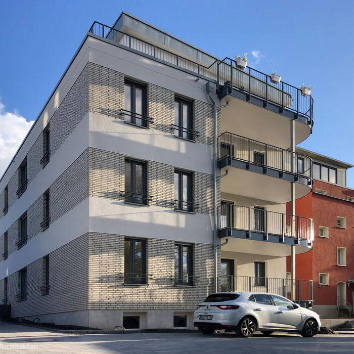 Drei Wohnungen mit nach Osten ausgerichteten Balkonen in Größen von 130 m² und ein 100 m² großes Zweizimmer-Penthouse verteilen sich auf vier Geschosse, wobei die obere Etage als Staffelgeschoss mit großzügiger Terrasse ausgebildet ist. In der Fassade wechseln sich horizontal verlaufende Bänder aus hellen Klinkerriemchen mit einer Edelputzfassade in strahlendem Weiß ab. Der von Randsteinen sowie Stauden und Gräsern eingefasste Vorgarten greift die Rundung der vorderen Gebäudeecke auf. Die Kunststofffenster sind dreifach verglast und mit Rollläden bzw. Raffstores im Dachgeschoss ausgestattet. Im großzügigen und hellen Treppenhaus wurde Kunststein verlegt, die Etagen sind zudem über einen Aufzug erreichbar. In den Wohnräumen ist massives Eichenparkett verlegt, die Bäder sind barrierefrei mit bodengleichen Duschen ausgestattet. Energetisch zeigt sich das Gebäude anspruchsvoll: Die Beheizung erfolgt durch Geothermie in Verbindung mit einer Wärmepumpe und Fußbodenheizung. Das Pultdach wurde als extensives Gründach umgesetzt. Die bereits vorhandenen Garagen blieben erhalten und im Keller ist ein Fahrradabstellraum hinzugekommen. Das Gebäude ist am 30. Juni im Rahmen des Tags der Architektur zu besichtigen.