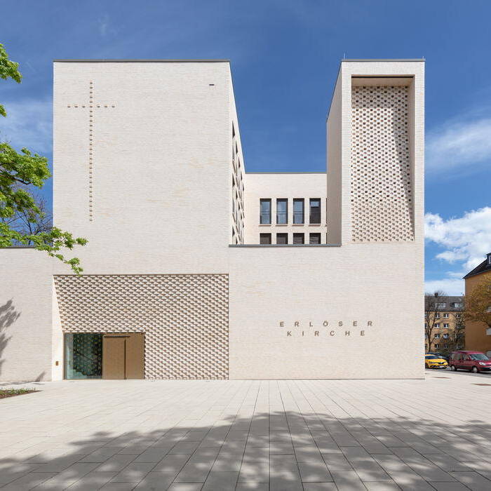 Schon der Vorplatz stellt einen Treffpunkt für alle dar. Unter dem alten Baumbestand ist Raum für Begegnung. Der Blick fällt auf die helle Klinkerfassade, die sich einerseits vorwiegend geschlossen, andererseits mit einem regelmäßigen Fensterraster zeigt. Daran lässt sich die Nutzung der dahinterliegenden Räumlichkeiten ablesen. Wohnungen und Kita, Gemeindebüro und Gemeindehaus sind über viele Fenster belichtet. In den Gottesdienstraum fällt natürliches Licht durch wenige, aber sehr bewusst gesetzte große Fenster. Wo sich die Fassade geschlossen zeigt, fallen die Öffnungen umso mehr auf, betont durch die ornamentale Gestaltung mit Verblendklinkern. Trichterförmig schneiden sich die beiden Eingänge in die Fassade, münden in messingfarbenen, von beschrifteten Fensterelementen ergänzten Portalen. Besuchende werden geradezu von diesen asymmetrischen Umrandungen angezogen, die auf die Räume dahinter neugierig machen. Hervorragend, im wahrsten Wortsinn, sind auch die beiden Reliefs an den großen, fast fensterlosen Fassadenseiten. Ein Kreuz auf der einen Seite sowie fünf Brote und zwei Fische in stilisierter Form auf der anderen verweisen auf die kirchlich-christliche Nutzung des Gebäudes. Auch hier ragen die Verblendklinker aus der Klinkerriemchenfassade hervor. Fast schon orientalisch mutet die Gitterstruktur des Glockenturms an. Er betont die Außenecke über dem Gottesdienstraum, trägt so dazu bei, dass der gesamte Neubau eine kompakte Form erhält und doch offen und für alle einladend wirkt.