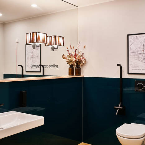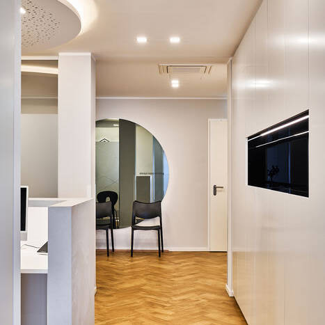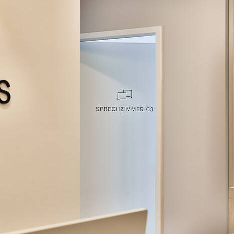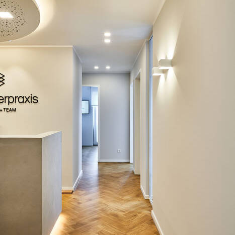 Natürlich wurde bei dem Ausbau aber auch auf das passende Lichtkonzept geachtet: So werden bestimmte Bereiche durch punktuell gesetzte Lichtquellen besonders hervorgehoben und akzentuiert. Das ist etwa beim Empfangsbereich wahrnehmbar, der durch indirekte Lichtquellen am Deckensegel und der Empfangstheke angenehm betont wird. Schließlich tragen aber auch direkt strahlende Lichtakzente zum harmonischen Ambiente der Praxis mit ästhetisch ansprechendem Praxisdesign bei, in dem sich die Patient:innen wohlfühlen.