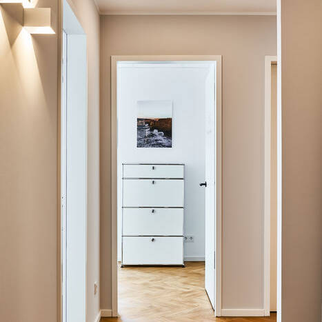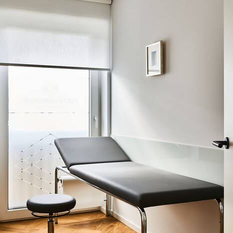 Als Herausforderung gestalteten sich dabei die kleinteiligen Räumlichkeiten: Alle Nutzungen mussten auf kleiner Fläche sehr kompakt und raumsparend angeordnet werden. Eine besondere Schwierigkeit stellte zudem die Belichtung dar, denn einige der Räume sind innenliegend und ohne Fenster. Der Ausbau teilt die Praxis in zwei Bereiche: Während sich auf der rechten Seite vom Hausflur die eigentlichen Praxisräume mit Empfang, Wartezimmer und den Sprechzimmern entfalten, wurden Eingriffsraum, Laserraum sowie das Labor separat auf der linken Seite angeordnet. Durch klare Strukturen und eine reduzierte Materialauswahl ist dabei eine moderne Praxis mit einladender Atmosphäre entstanden: Hochwertige Materialien schaffen durch ihr homogenes und stimmiges Erscheinungsbild ein ruhiges, zeitloses Design. Um genügend Wärme auszustrahlen, kam für den Boden ein Vinylbelag in einem Eichedekor zum Einsatz, der in moderner Fischgrät-Optik verlegt wurde. Passend dazu sind die Wände in einem sanften Grauton gestrichen. Die Empfangstheke, die das Aushängeschild jeder Praxis sein sollte, sticht hier durch ihre Betonoptik ins Auge und fügt sich zugleich perfekt in das Gesamtbild ein. Spanische Designstühle beleben das Bild mit ihren formschönen Silhouetten.