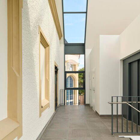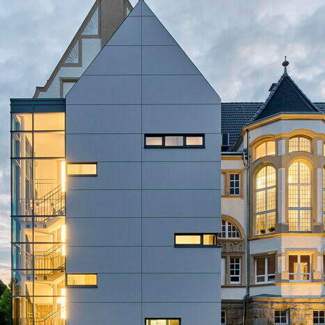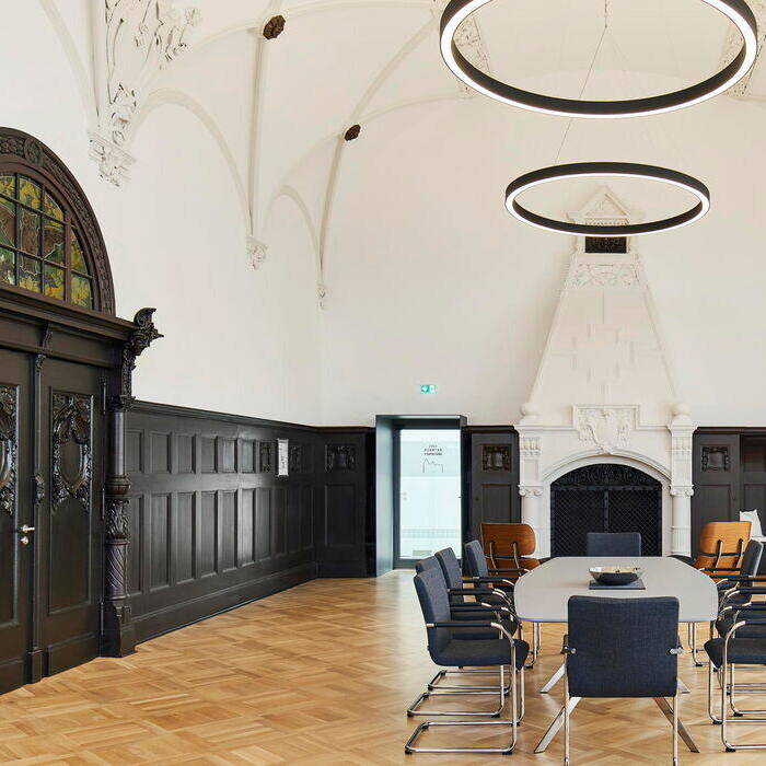 Fertiggestellt im April 2024, erstrahlt das historische Bauwerk in neuem Glanz, ergänzt durch einen bewusst schlicht gehaltenen Gebäudeteil an seiner Rückseite. „Der moderne Treppenhausbau integriert sich harmonisch in das Gesamtbild, indem er die Materialität und Farbgebung des Altbaus respektiert und gleichzeitig durch klare Linien und eine reduzierte Ästhetik auffällt“, erläutert Projektleiter Tobias Janßen. Im Alt- wie im Neubau galt es, vielfältige Denkmalschutzauflagen zu erfüllen sowie für die neue Nutzung erforderliche Änderungen im Konsens auf den Weg zu bringen. Beides sei mit dem Denkmalamt der Stadt Essen mit viel Augenmaß gelungen. Abgestimmt wurden unter anderem Farbe und Material der Fassade aus Bruchstein und historischer Putzfassade, die Kubatur und Farbe der Fassade des neuen Treppenhauses, die teilweise Dachöffnung, sämtliche Holzverkleidungen innen, die Holztüren innen und außen sowie die Farbwahl bei Geländern und Fenstergittern. Handwerkskunst war etwa bei den Stuckelementen gefragt, die vorsichtig entschichtet und deren Strukturen ohne Schleifen freigelegt wurden. Bleiglasfenster blieben erhalten und wurden aufgearbeitet. Auch die Außentreppe erwies sich als anspruchsvoll: Deren Natursteinsockel und Natursteinelemente wurden auseinandergebaut, beschriftet und später in Kombination mit neuen Elementen wie ein Puzzle wieder zusammengesetzt. Den Kontrast von Alt und Neu kann man am Treppenhaus im Wortsinn erfassen. Möglich macht dies eine Fuge zwischen der ehemaligen Außenfassade des Altbaus und dem Neubau, der als Pfosten-Riegel-Fassade mit einer Verkleidung aus Faserzement-Platten ausgebildet ist und mit Glaselementen den lichtdurchfluteten Übergang zum Bestandsgebäude bildet. Innen wurde die historische Holztreppe freigelegt, die als zentrales Element das neue Open-Space Büro bereichert. So elegant wie möglich wurden die Brandschutzauflagen gelöst, indem die Flure durch Rauchschutzelemente abgetrennt wurden. Das einst verwinkelte Dachgeschoss wurde neu strukturiert und erhielt großflächige Fenster. Im alten Rathaussaal, der weiterhin für Veranstaltungen zur Verfügung steht, konnte der Parkettboden erhalten werden. Weiterhin wurde der Stuck aufwändig nachgearbeitet, gereinigt, neu beschichtet und gestrichen. LED Leuchten bringen Modernität in den Saal. Der Durchgang zum Fluchttreppenhaus wurde mit massiven, anthrazitfarbenen Stahlplatten dezent gestaltet. Dafür wurde die alte Holzvertäfelung ausgeschnitten und an anderer Stelle wieder eingefügt.