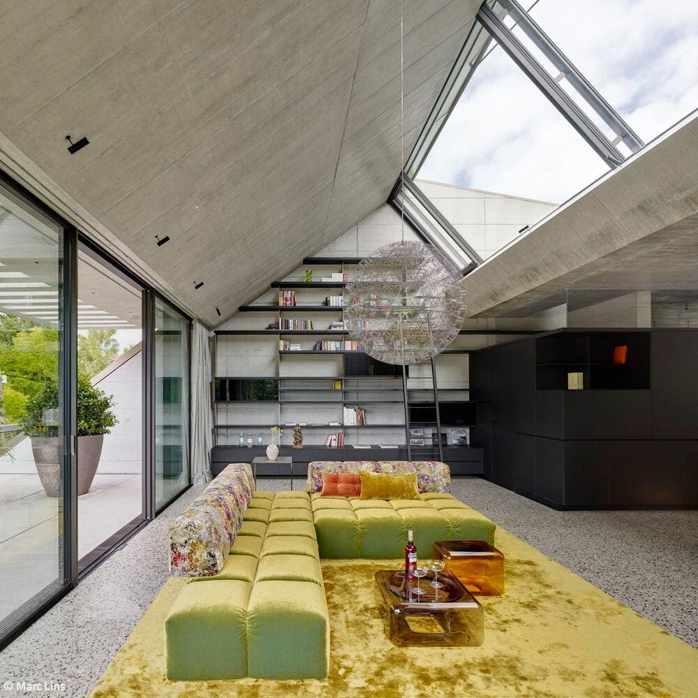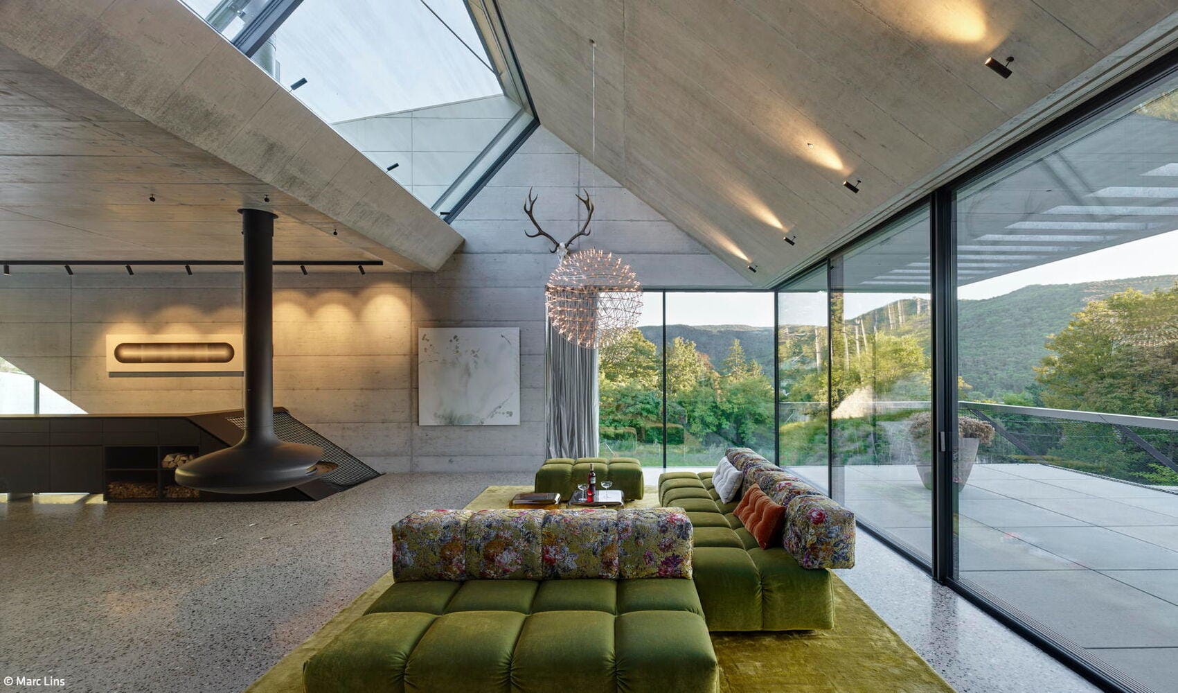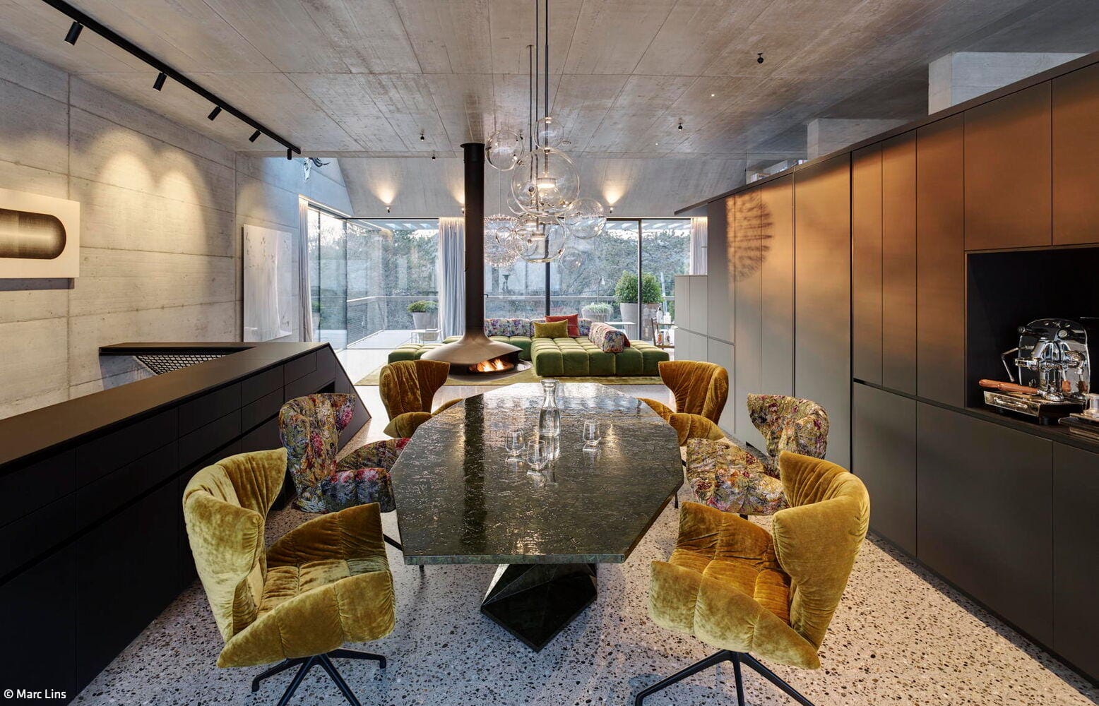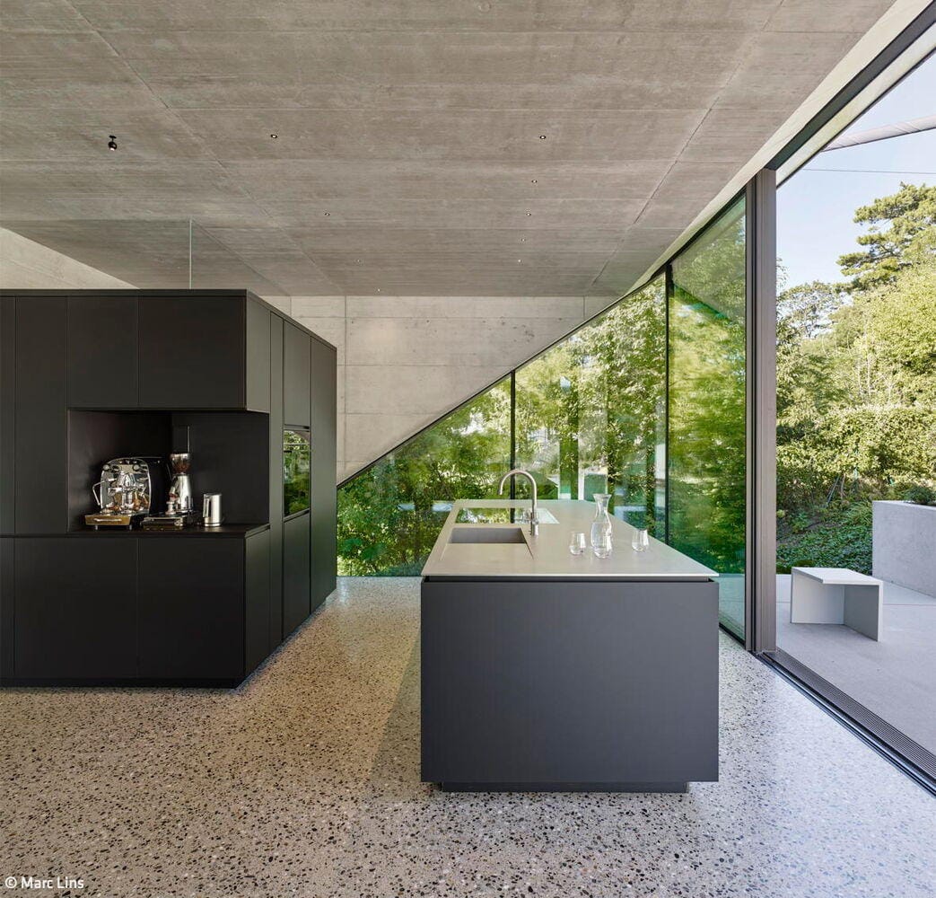 Im Inneren prägen Sichtbeton und geschliffener Beton das Erscheinungsbild. Ruhige, helle Farbtöne in Weiß und Hellgrau mit farblichen Akzenten und Schwarz sorgen für eine puristische, naturverbundene Atmosphäre. Für die Einbaumöbel aller Ebenen wurde das matte, nicht reflektierende Compactplattenmaterial Fenix NTM gewählt – in Schwarz, Weiß und Oliv. Die harmonisch aufeinander abgestimmten Farbtöne orientieren sich an den jeweiligen räumlichen Leitmotiven und unterstreichen die ruhige Eleganz. Geschliffene Terrazzoböden bereiten die Bühne für die hochwertige Ausstattung: Designermöbel, Statementleuchten und indirekte Spots sowie eine geradlinige schwarze Einbauküche mit einem imposanten vorangestellten Counter und Weitblick in die Ferne.