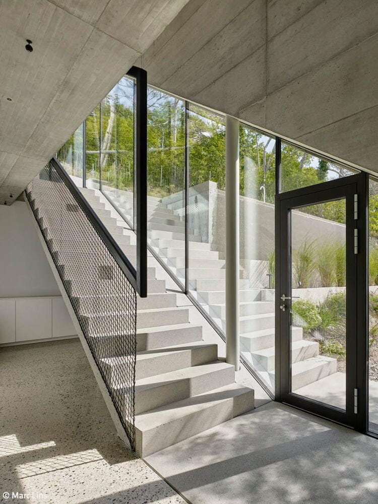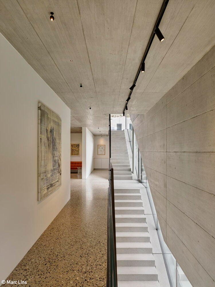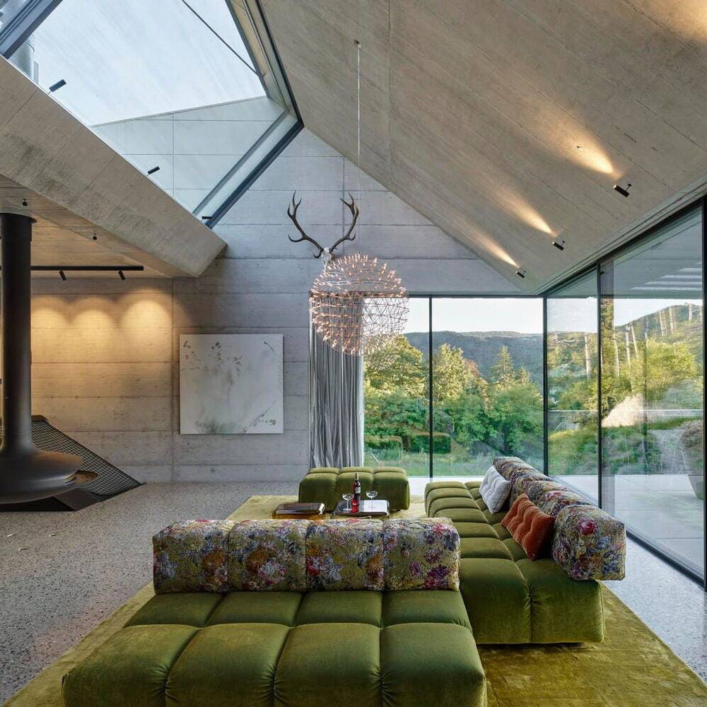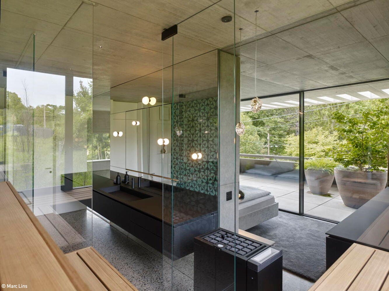 Im Inneren prägen Sichtbeton und geschliffener Beton das Erscheinungsbild. Ruhige, helle Farbtöne in Weiß und Hellgrau mit farblichen Akzenten und Schwarz sorgen für eine puristische, naturverbundene Atmosphäre. Für die Einbaumöbel aller Ebenen wurde das matte, nicht reflektierende Compactplattenmaterial Fenix NTM gewählt – in Schwarz, Weiß und Oliv. Die harmonisch aufeinander abgestimmten Farbtöne orientieren sich an den jeweiligen räumlichen Leitmotiven und unterstreichen die ruhige Eleganz. Geschliffene Terrazzoböden bereiten die Bühne für die hochwertige Ausstattung: Designermöbel, Statementleuchten und indirekte Spots sowie eine geradlinige schwarze Einbauküche mit einem imposanten vorangestellten Counter und Weitblick in die Ferne.