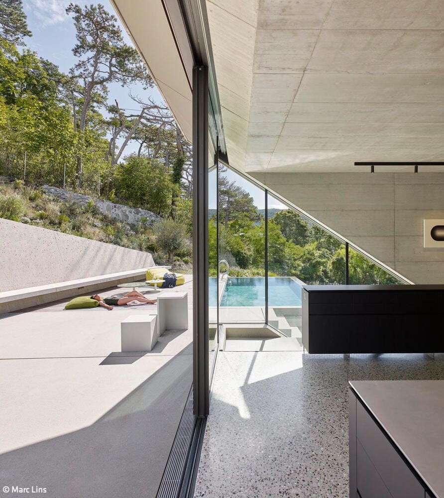 An künftige Anforderungen wurde ebenso gedacht: Ein vollständig vorbereiteter Aufzugsschacht schafft Barrierefreiheit auf Abruf und dient vorübergehend als Stauraum. Eine Ebene darüber liegen die Schlafräume, tief im Hang verankert, geschützt und ruhig. Das Elternschlafzimmer öffnet sich über eine großzügige Terrasse zum beeindruckenden Panorama der Hinterbrühler Wälder. Hier verschmilzt Rückzug mit Weite, Intimität mit Naturerlebnis. Im Außenraum setzt sich die Treppenbewegung fort: Eine parallel zur Innentreppe geführte Treppe verbindet die Terrassen und Gärten über alle Ebenen hinweg. So wird aus dem vertikalen Erschließen ein fließendes räumliches Kontinuum. Die Wohnebene bildet das Herz des Hauses: Sie präsentiert sich lichtdurchflutet, offen und auf beiden Seiten von großzügigen Terrassen umrahmt. Im Zentrum schwebt ein abgehängter, offener Kamin, der die Bereiche Wohnen, Essen und Kochen subtil zoniert, ohne die Weite zu nehmen. Ein besonderes Highlight bildet das Oberlicht-Shed, das den hangseitigen Föhrenwald eindrucksvoll ins Innere holt. Gegen den Hang liegt eine geschützte Terrasse samt Infinity-Pool, dessen Kante sich optisch mit den Hügeln der Umgebung verbindet.