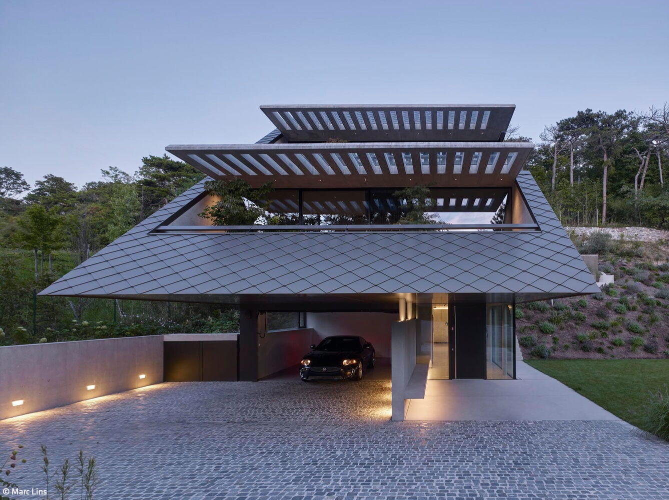 Bereits der erste Eindruck ist spektakulär: Die Fassade, verkleidet mit Rautenschindeln in warmem Braunbeige, strahlt Dynamik aus und verleiht dem Wohnhaus ein futuristisches Profil. Durch kühn gesetzte Fensteröffnungen und eine zur Talseite von oben bis unten verglaste Front ist jeder Raum und jede Sichtachse von Landschaft geprägt und lässt den Innen- und Außenraum fließend ineinander übergehen. Die unterste Ebene empfängt mit einem eleganten Ankommen: Eingang, zwei überdachte Stellplätze, Garage, Gästezimmer sowie Technik- und Wirtschaftsräume bilden das funktionale Rückgrat des Hauses. Von hier aus zieht sich eine einläufige Treppe über alle Geschosse – die Erschließung wirkt dadurch mühelos und selbstverständlich. Besonders reizvoll ist ihr Verlauf entlang eines verglasten Bandes, das parallel zum Hang die Natur als ständigen Begleiter mitführt.