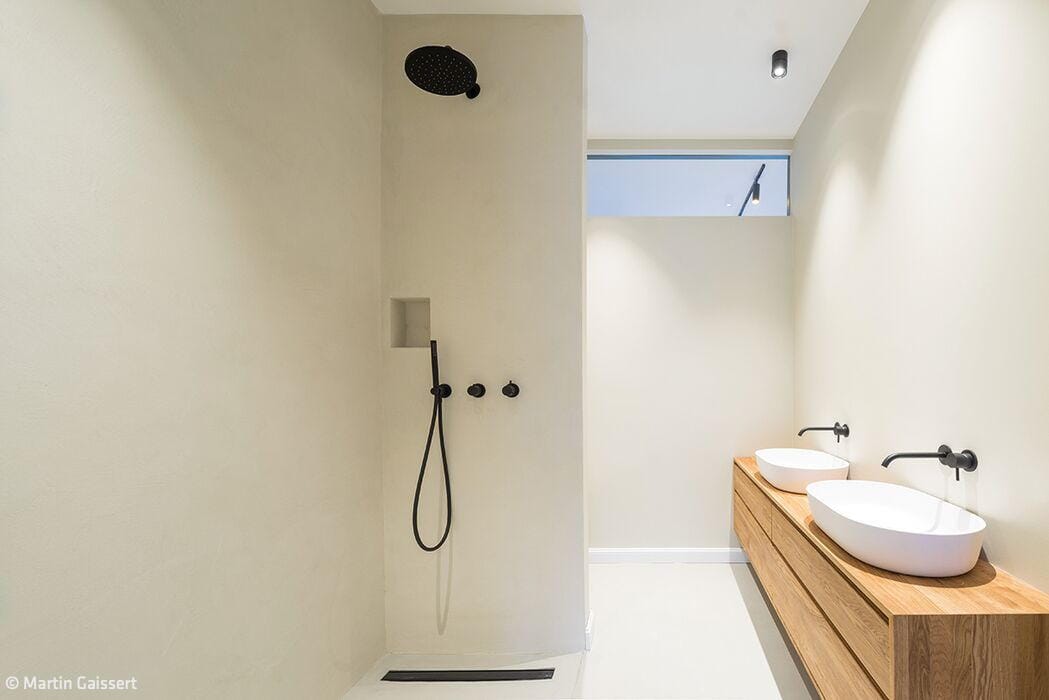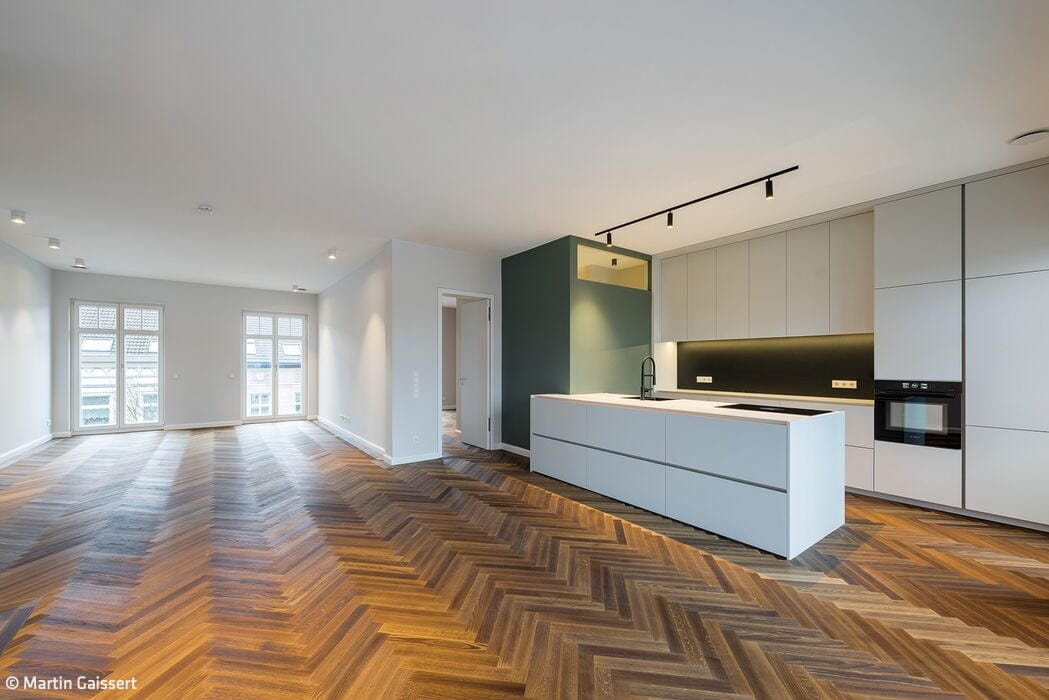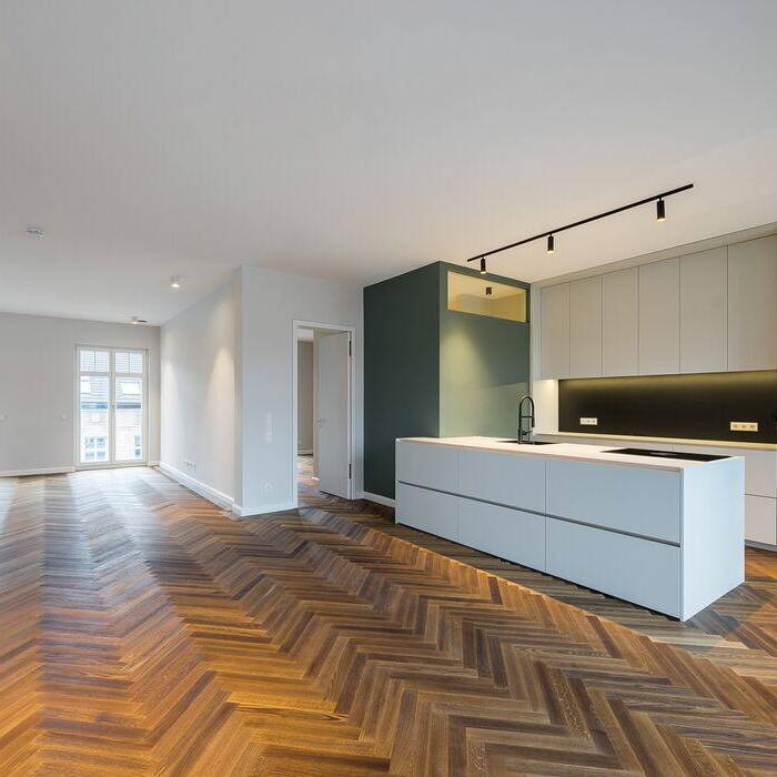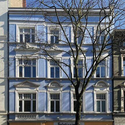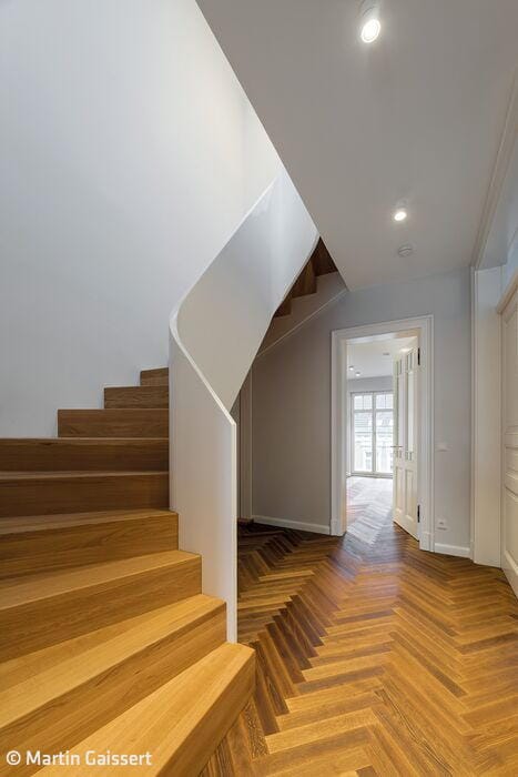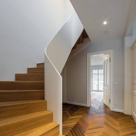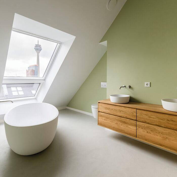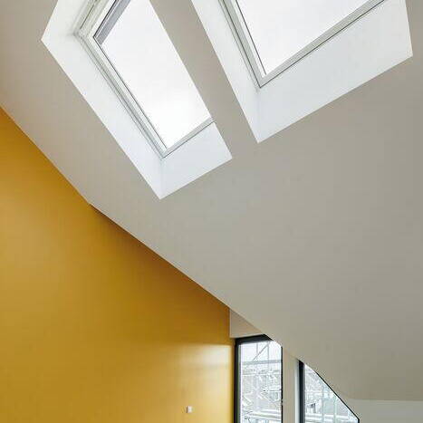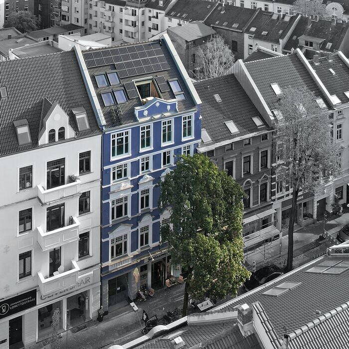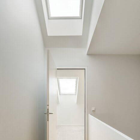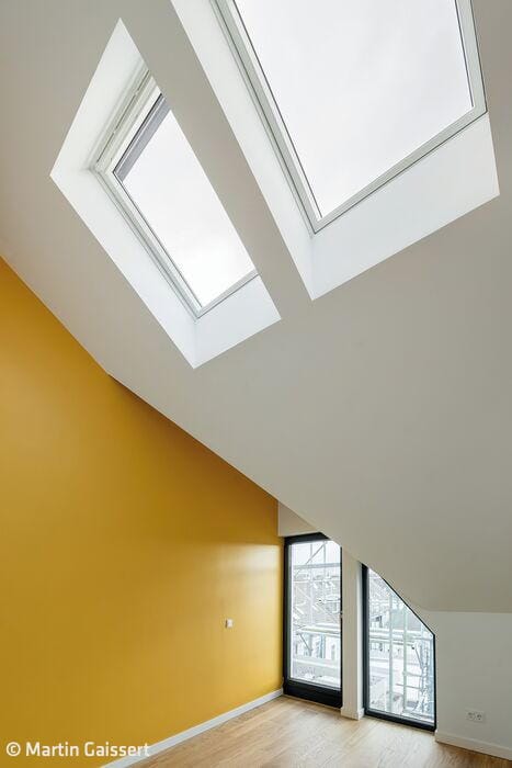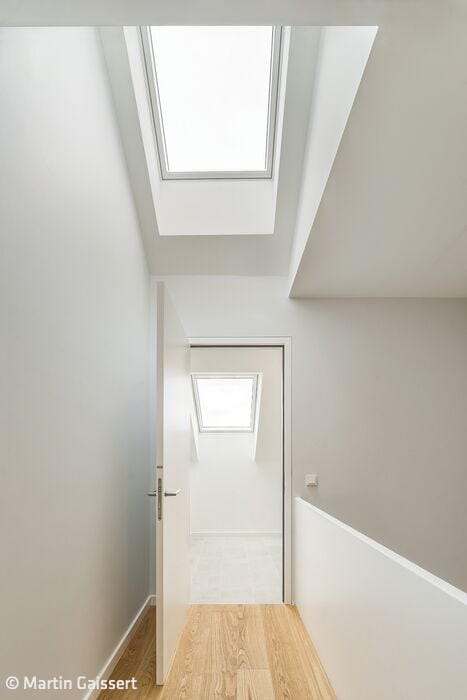 Built in 1897, this well-preserved residential and commercial building sits prominently on Lorettostraße. Originally comprising four full storeys topped with a low knee wall and pitched roof truss, the structure was expanded by adding another floor and installing an elevator to create a new 195 m² residential unit. This required completely removing the top floor slab and roof structure. Respecting the ridge height of adjacent buildings, the architects added a full storey at traditional old-building height, along with a two-level roof truss. The tight inner-city setting and minimal construction space necessitated a resourceful approach using cross-laminated timber (CLT) elements. True to the building's historic preservation mandate, the façade draws its design language from the original—windows, colour palette, and architectural details form a seamless dialogue with the existing structure. Thermal insulation meets KfW 55 efficiency standards, employing high-performance rock wool composite panels. The new residential unit connects via the existing stairwell; an elevator—integrated where a former floor bathroom stood—now serves the penthouse while providing accessibility throughout. The lower level flows seamlessly from street to courtyard, housing an open-plan living, cooking, and dining area with a courtyard-facing balcony, plus the master bedroom and home office. Above, the children's floor accommodates three bedrooms and a generously proportioned family bath with a freestanding tub. Skylights flood these spaces with daylight and sky views. A guest room enjoys a small roof terrace on the street side, framed by a decorative gable and offering views toward the nearby Rhine Tower. The second roof level—reserved entirely for storage and mechanical systems—sits directly beneath the ridge. Beyond expanded living space, this addition excels in energy performance: an air-source heat pump, photovoltaic arrays across both roof surfaces, and controlled mechanical ventilation make it a self-sufficient, sustainable home.