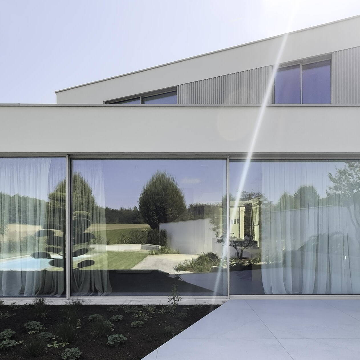 The bathrooms feature Dekton Kovik as well. For the five-meter washbasins, the team selected Silestone mineral composite in Camden matte grey. "These stone surfaces reinforce the home's minimalist architecture through their consistent material presence," notes architect Simon Frick.
