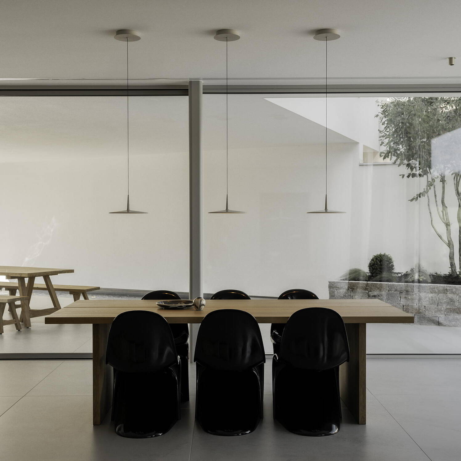 Expansive Dekton floor tiles blur the boundary between interior and exterior, creating seamless flow. "The sintered stone surface in Kovik's subtle grey-veined tone creates a stunning pairing with the natural wood dining table and kitchen cabinetry," explains designer Lilit Frick.