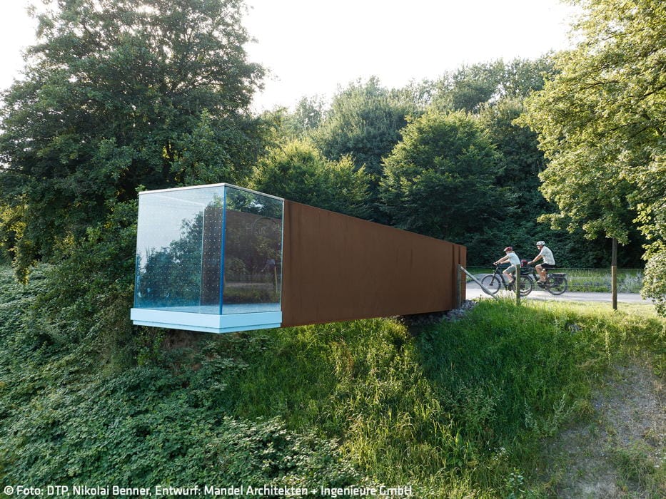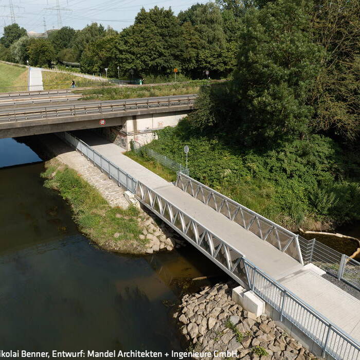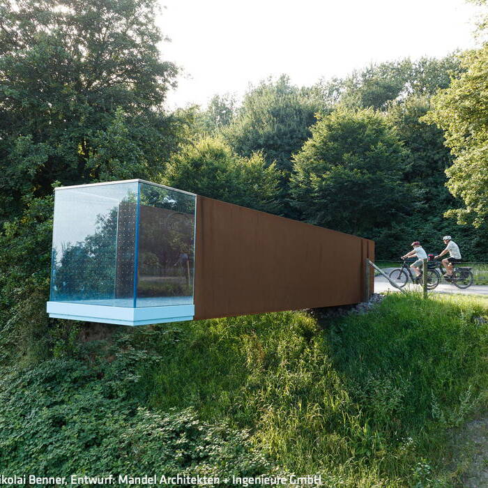 The promenade does far more than simply connect the cities—it creates a sense of place and transforms the Emscher and its surrounding pathways into an attractive destination for the neighborhoods, city, and region. The backbone is formed by the former operating path of the Emschergenossenschaft, now a waterside cycling and pedestrian route. However, it is the enhancement of the riverbanks and the creation of distinctive places that elevate it to something greater: an attractive and multifunctional urban space. Along the approximately 20-kilometer stretch, 25 designed spaces have been created, each addressing local themes, engaging with spatial relationships, or strengthening connections to the surrounding neighborhoods. New bridges and underpasses, as well as striking bridge structures—including an exit platform and a bridge spanning the Schellenbruchgraben, designed by Mandel Architects and Engineers—invite visitors to discover the space in unprecedented ways and enable new connections to public transportation. The Emscher Promenade thus becomes a vital part of the region's blue-green infrastructure. It can be divided into three sections. The first section showcases a typical Ruhr Valley landscape, blending industry, commerce, residential areas, and green space. The promenade responds to this environment with carefully designed places, engaging the senses of hearing and sight, highlighting what is special, and revealing meaningful connections. Examples include the Hellbach Terraces with native trees and benches for lingering, as well as blue-painted, funnel-shaped objects—listening stations—that capture the theme of water and its sounds. The second section focuses on the river's future landscape appeal and its history. Blue horse sculptures, the Emscher Horses, commemorate the wild horses that once roamed here. The striking Emscher Platform, meanwhile, extends far over the river embankment from the path, offering a glimpse of a planned widening of the river as an ecological focal point. The third section emphasizes the connection between the urban space and the river. At the Herdicksfällen, a water experience area has been created. Along the playful blue water serpent that winds across the meadow, visitors can explore and engage. All gathering points, play areas, and learning spaces follow a unified design language, forming the "blue thread" of the Emscher Promenade.